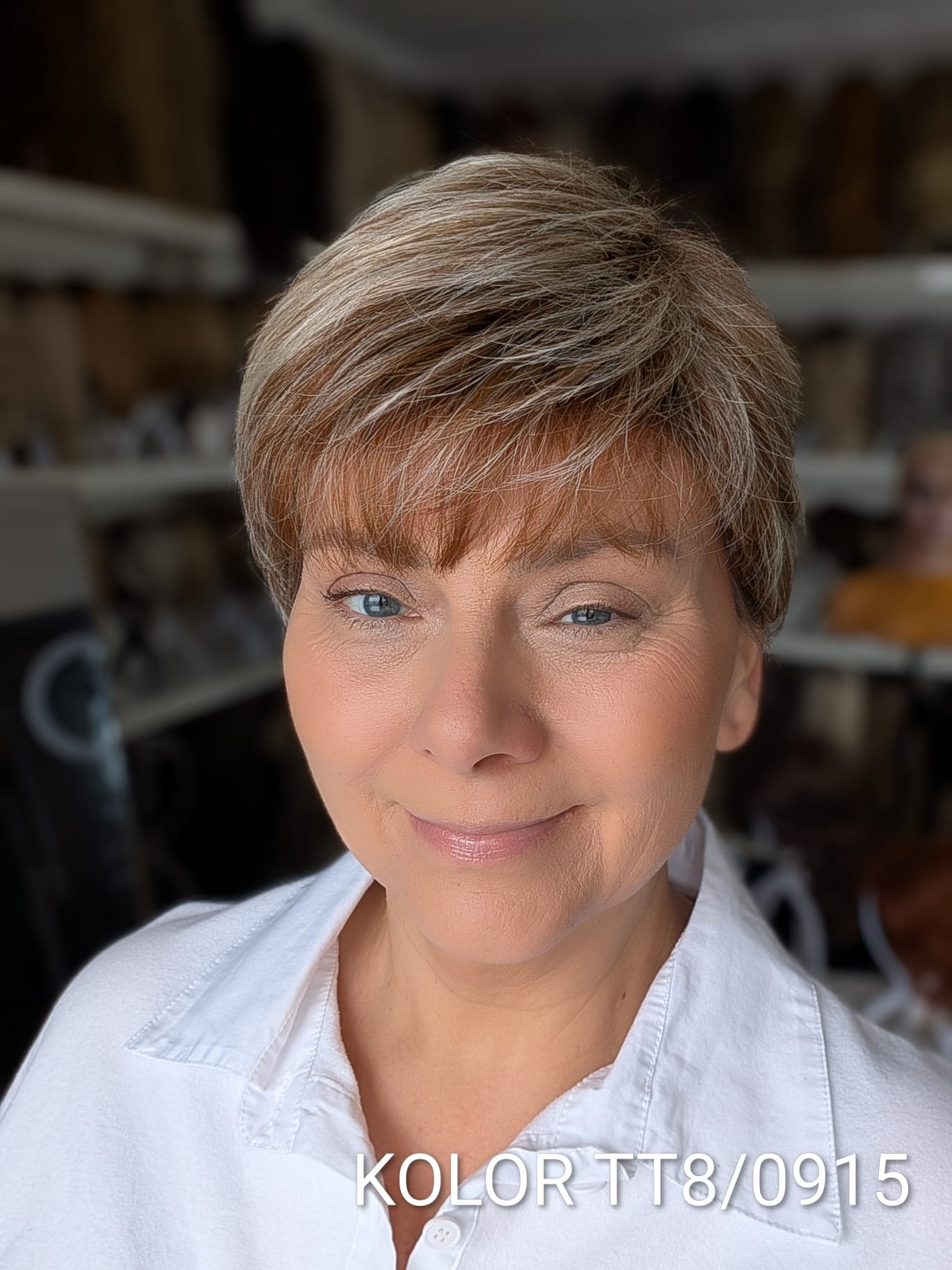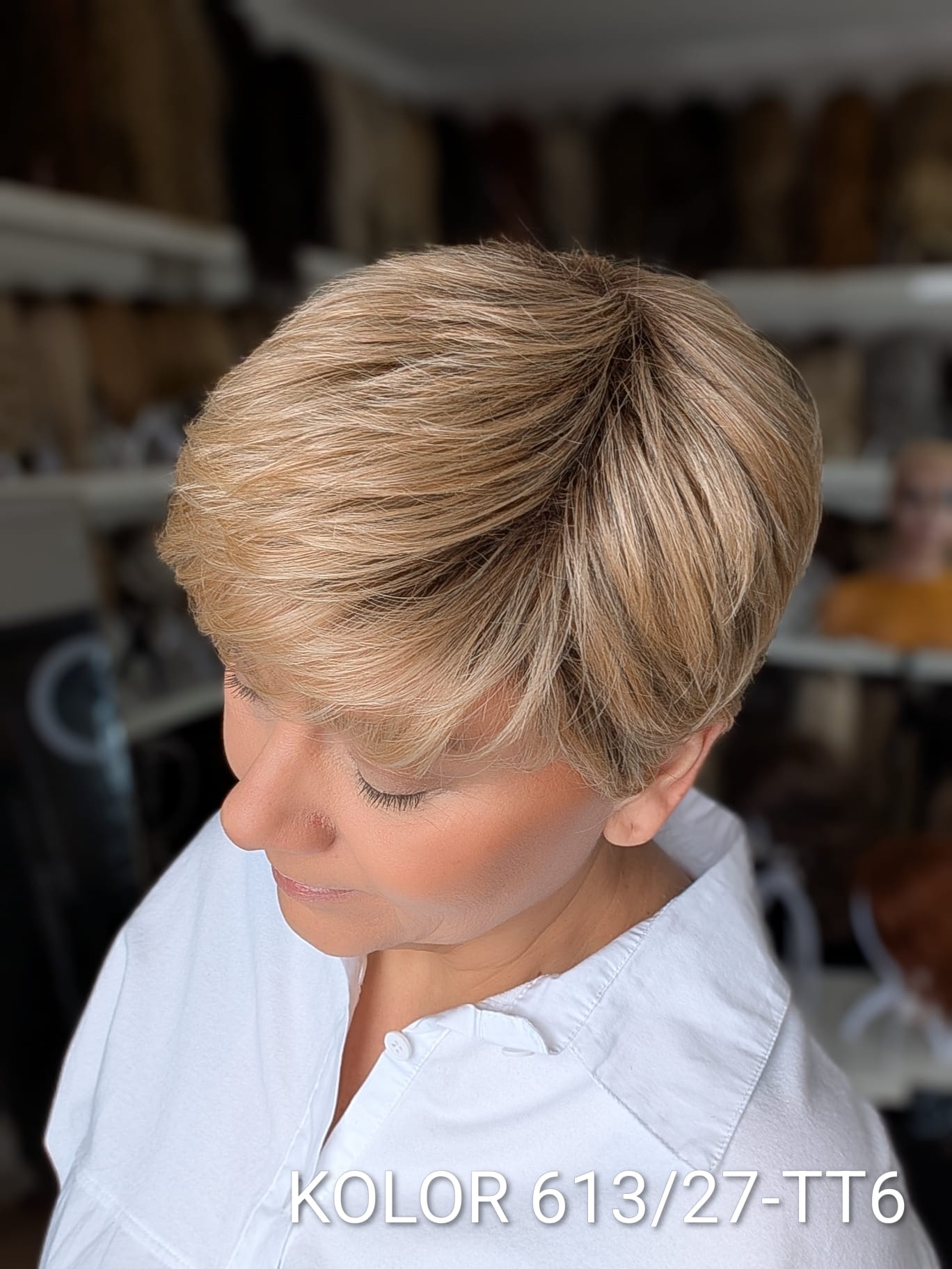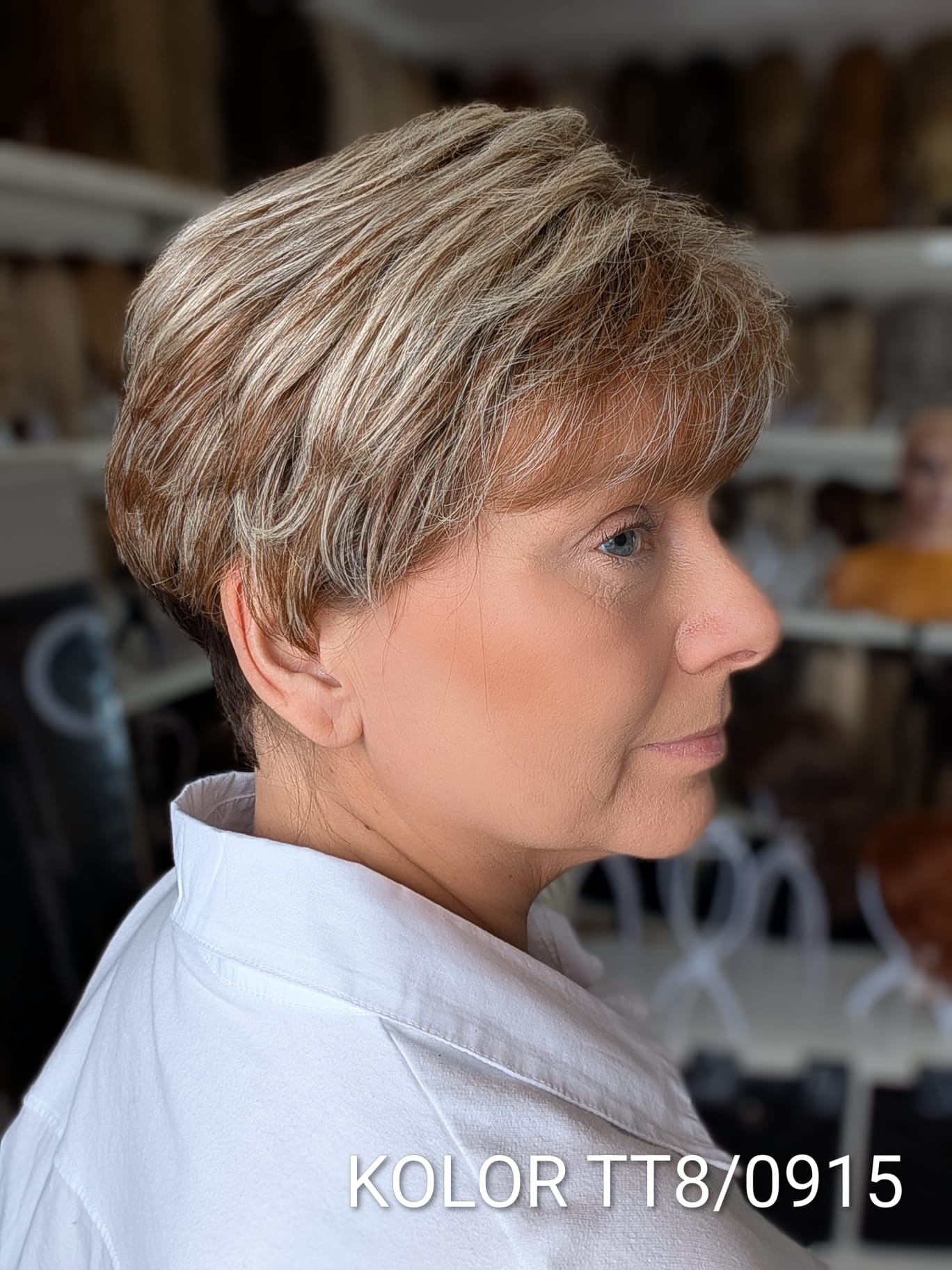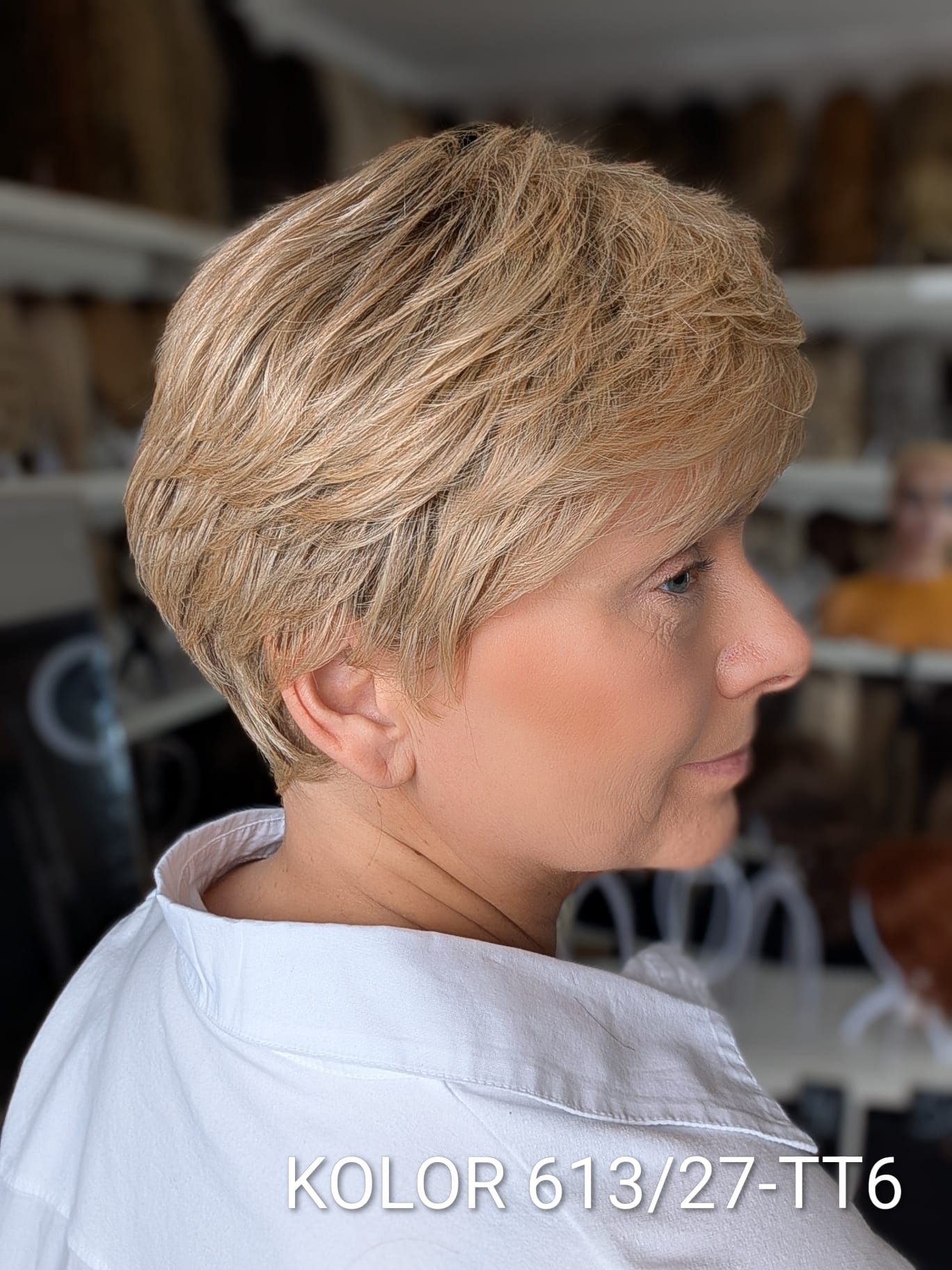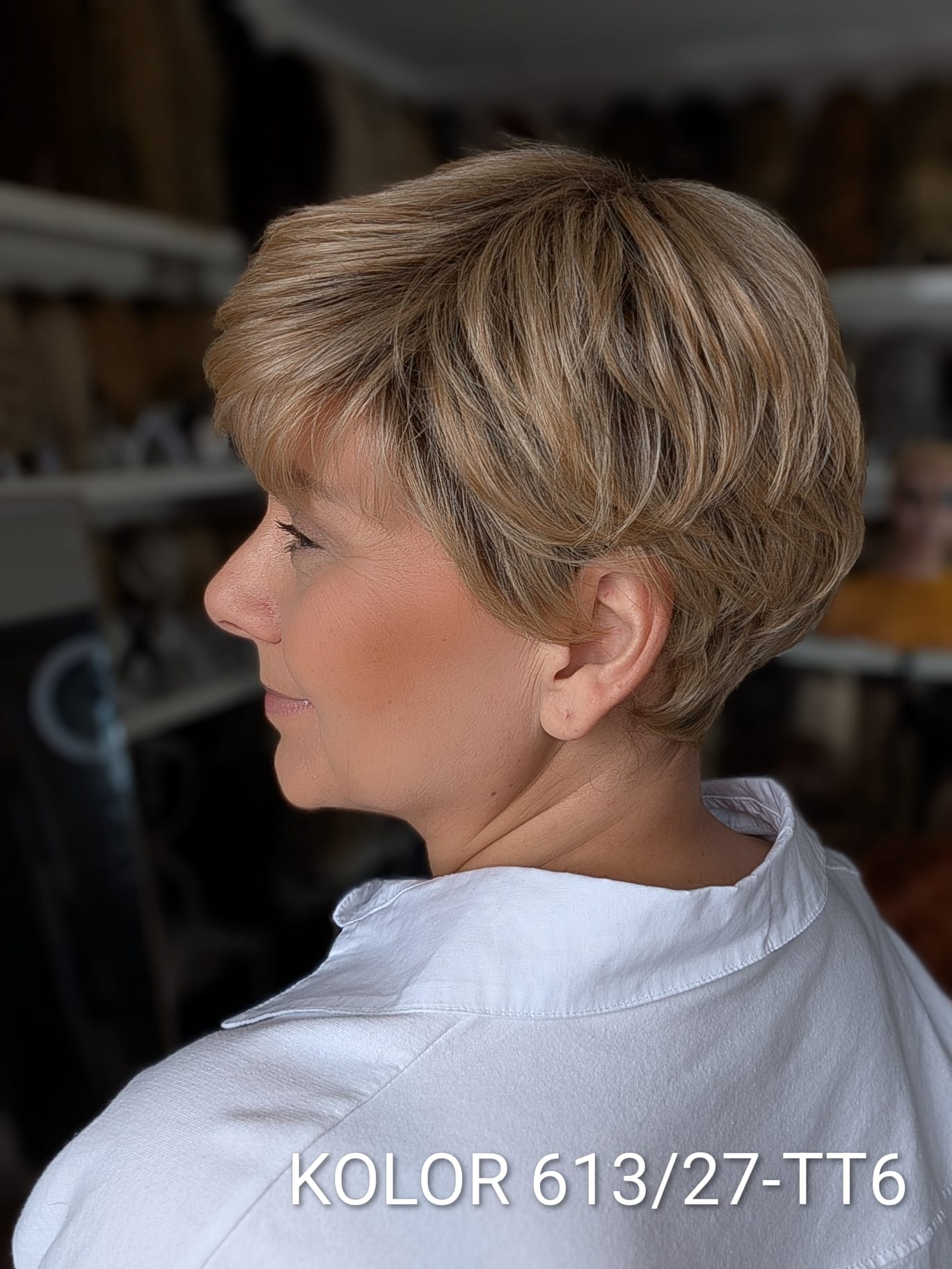 Peruka Aldona to krótka, kobieca fryzura z delikatnie wycieniowaną grzywką i subtelnym efektem tapiru, który nadaje włosom lekkości oraz naturalnego uniesienia u nasady. Model pięknie otula twarz, dodając jej świeżości i miękkiego charakteru. To propozycja dla kobiet, które cenią wygodę krótkiej fryzury, ale nie chcą rezygnować z objętości i eleganckiego wykończenia. Aldona sprawdzi się zarówno na co dzień, jak i w bardziej formalnych stylizacjach – zawsze wygląda naturalnie i harmonijnie.
