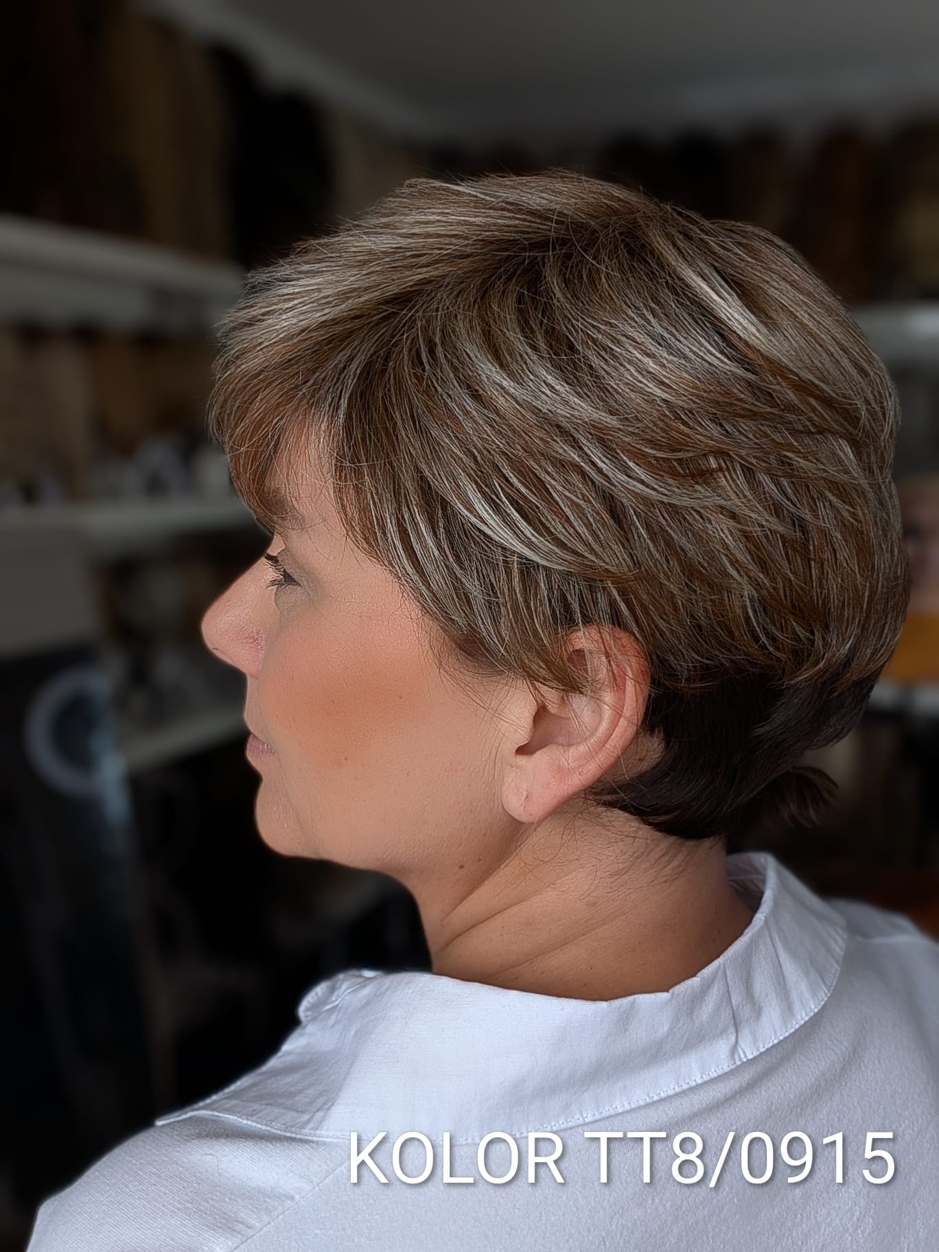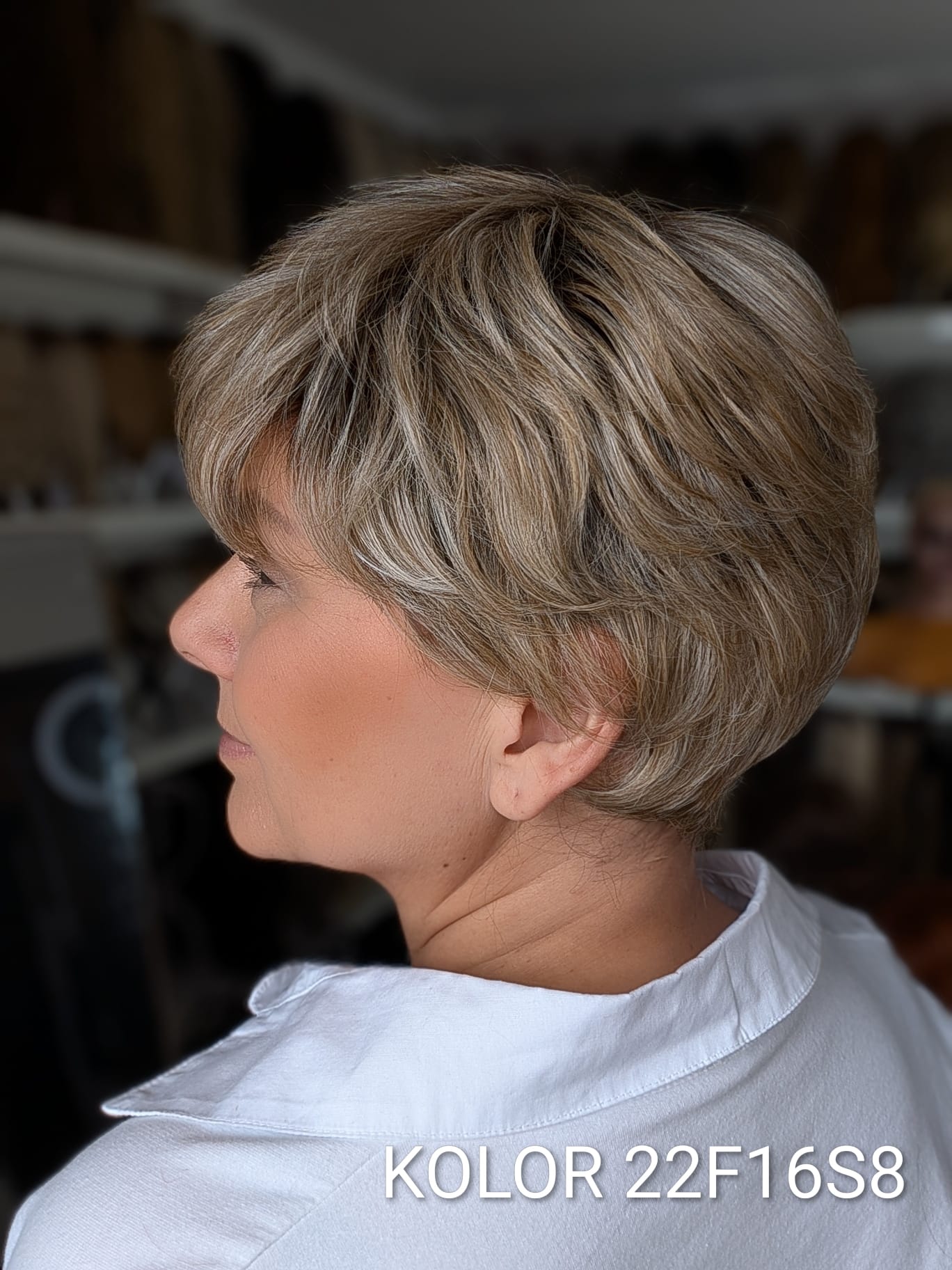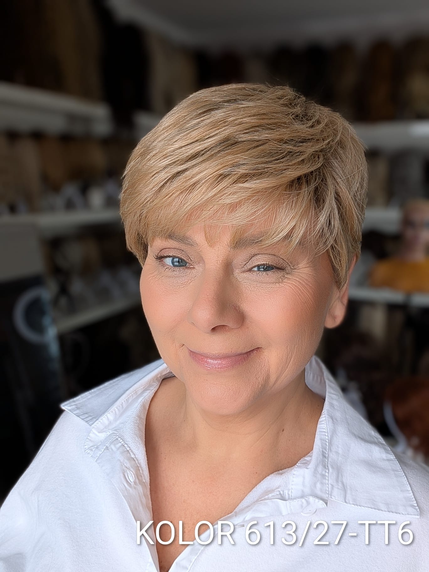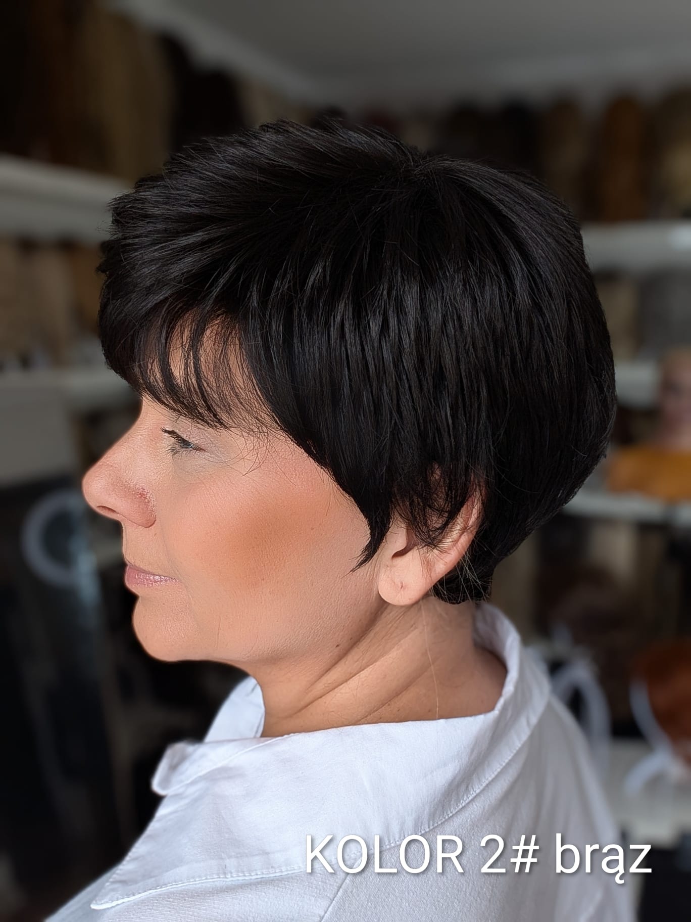 Peruka Aldona to krótka, kobieca fryzura z delikatnie wycieniowaną grzywką i subtelnym efektem tapiru, który nadaje włosom lekkości oraz naturalnego uniesienia u nasady. Model pięknie otula twarz, dodając jej świeżości i miękkiego charakteru. To propozycja dla kobiet, które cenią wygodę krótkiej fryzury, ale nie chcą rezygnować z objętości i eleganckiego wykończenia. Aldona sprawdzi się zarówno na co dzień, jak i w bardziej formalnych stylizacjach – zawsze wygląda naturalnie i harmonijnie.