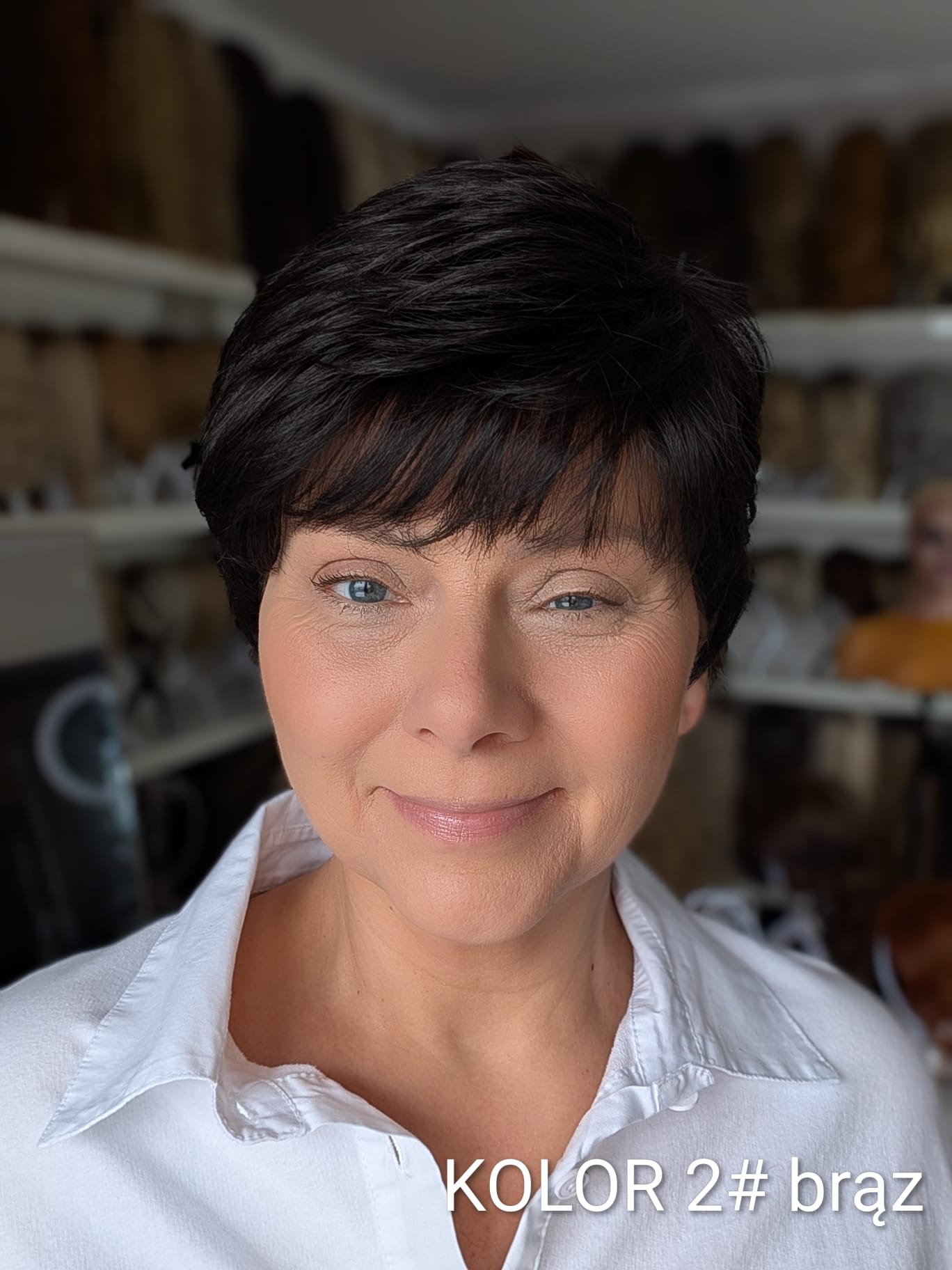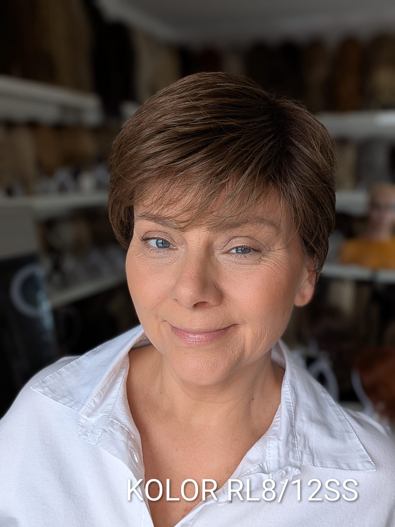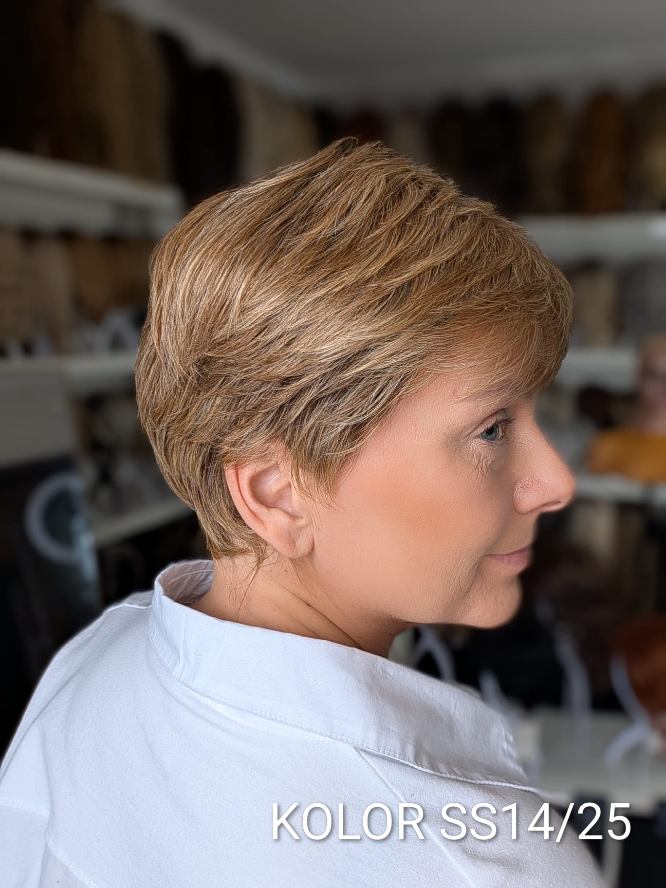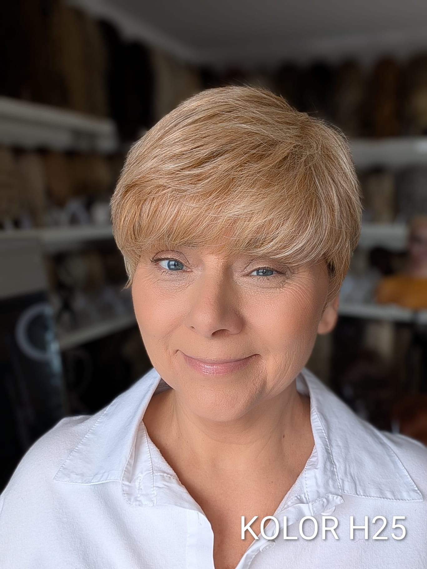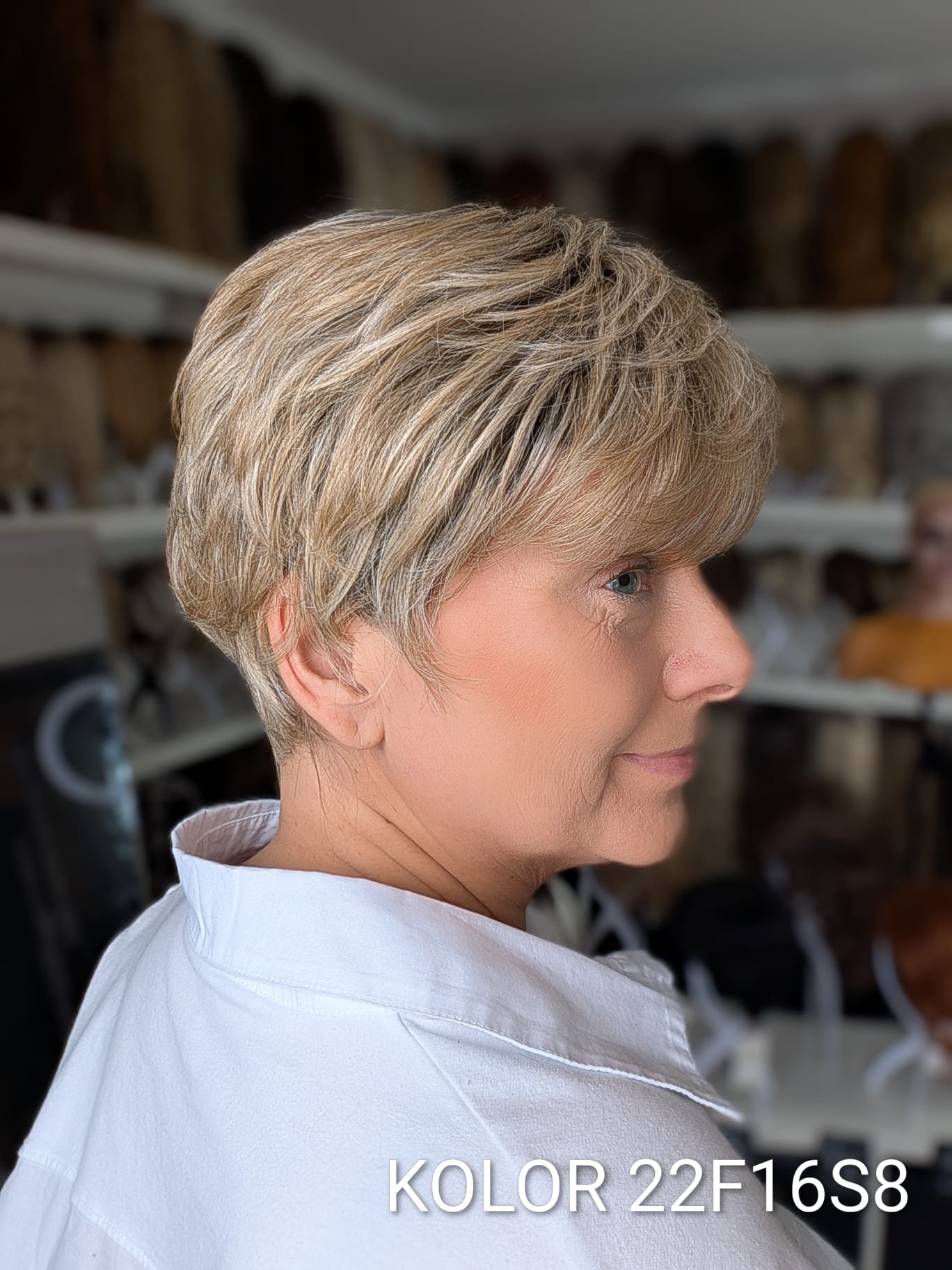 Peruka Aldona to krótka, kobieca fryzura z delikatnie wycieniowaną grzywką i subtelnym efektem tapiru, który nadaje włosom lekkości oraz naturalnego uniesienia u nasady. Model pięknie otula twarz, dodając jej świeżości i miękkiego charakteru. To propozycja dla kobiet, które cenią wygodę krótkiej fryzury, ale nie chcą rezygnować z objętości i eleganckiego wykończenia. Aldona sprawdzi się zarówno na co dzień, jak i w bardziej formalnych stylizacjach – zawsze wygląda naturalnie i harmonijnie.