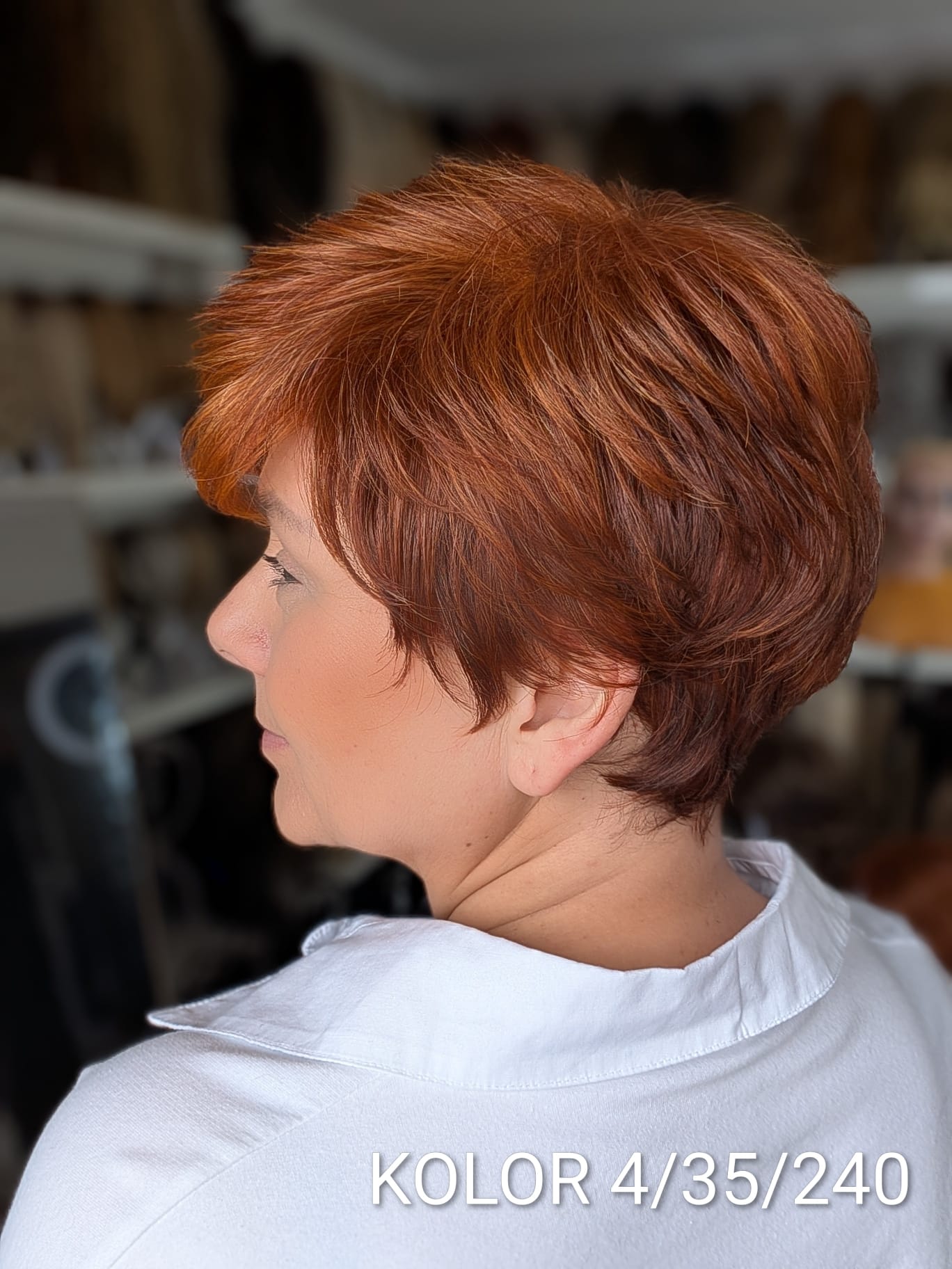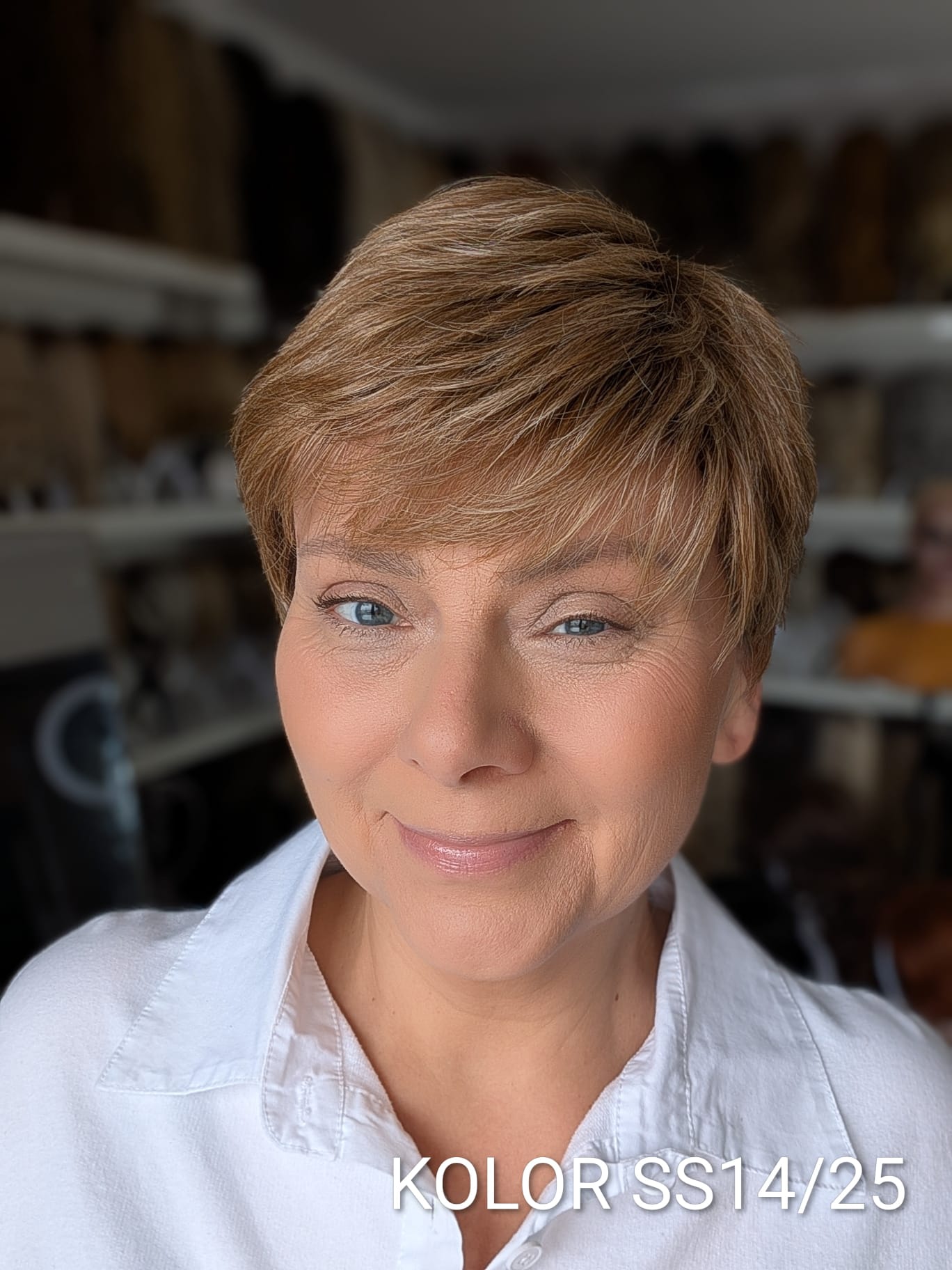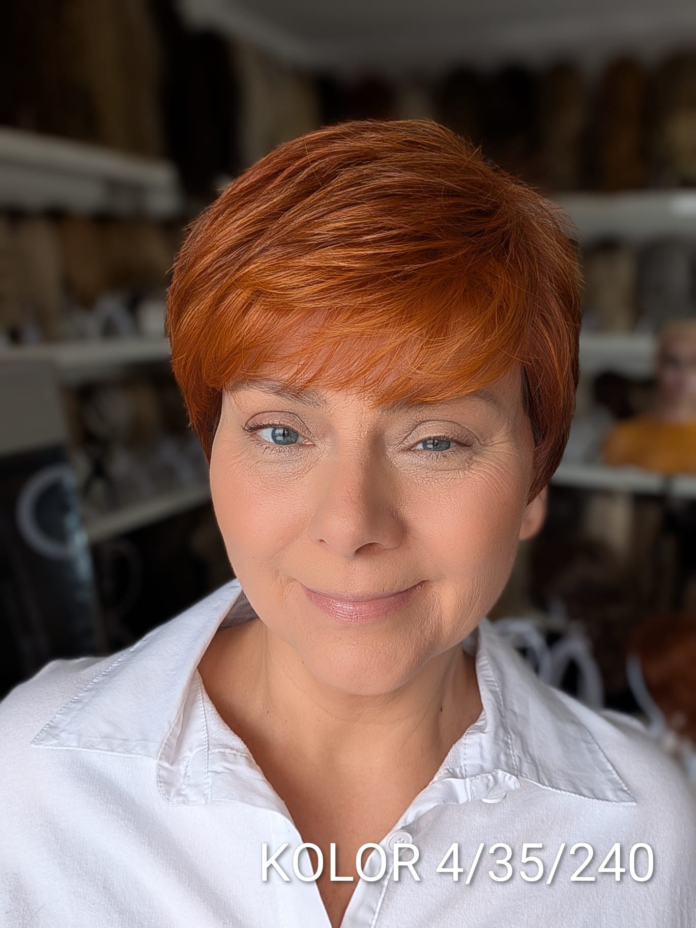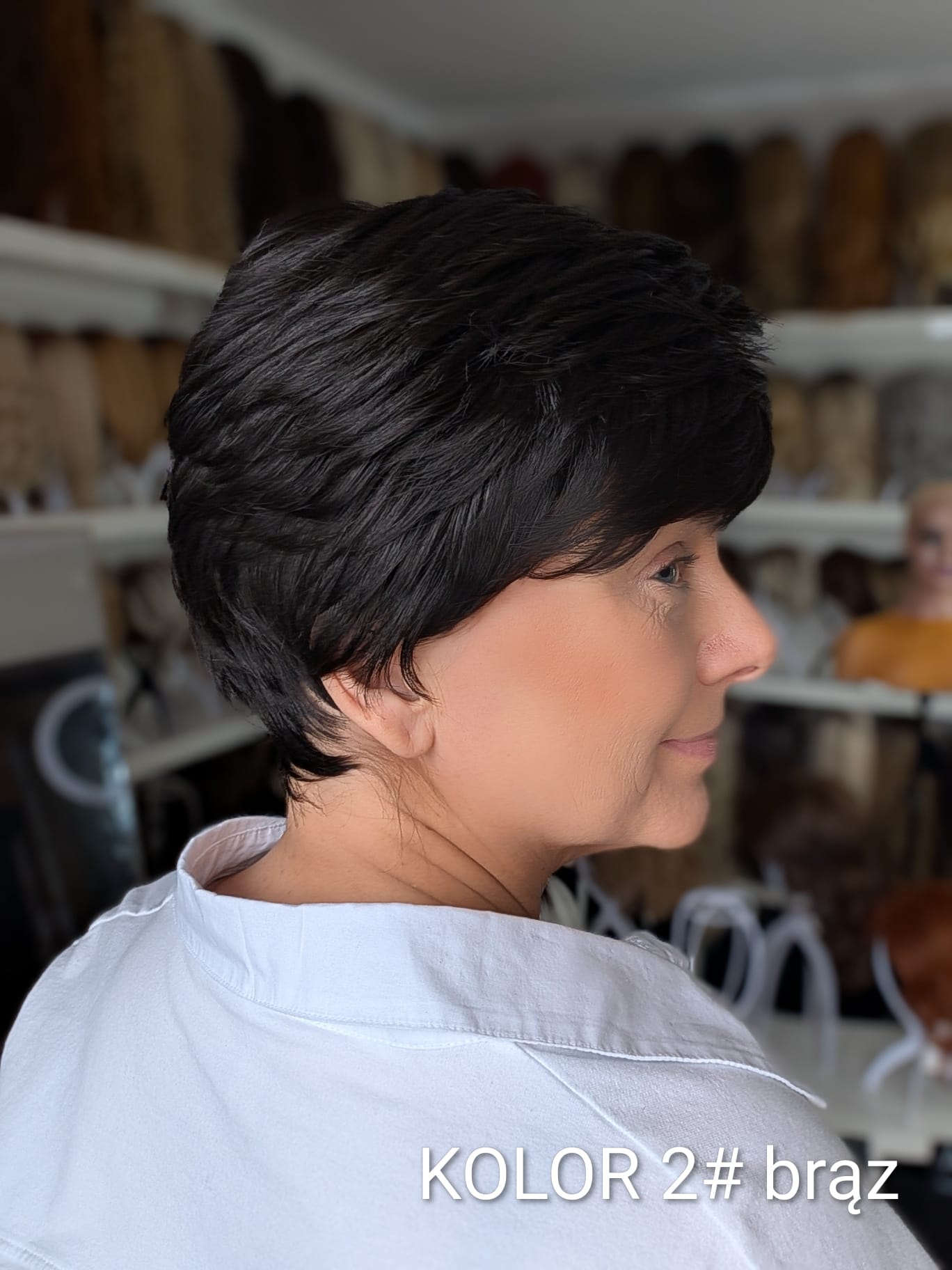 Peruka Aldona to krótka, kobieca fryzura z delikatnie wycieniowaną grzywką i subtelnym efektem tapiru, który nadaje włosom lekkości oraz naturalnego uniesienia u nasady. Model pięknie otula twarz, dodając jej świeżości i miękkiego charakteru. To propozycja dla kobiet, które cenią wygodę krótkiej fryzury, ale nie chcą rezygnować z objętości i eleganckiego wykończenia. Aldona sprawdzi się zarówno na co dzień, jak i w bardziej formalnych stylizacjach – zawsze wygląda naturalnie i harmonijnie.