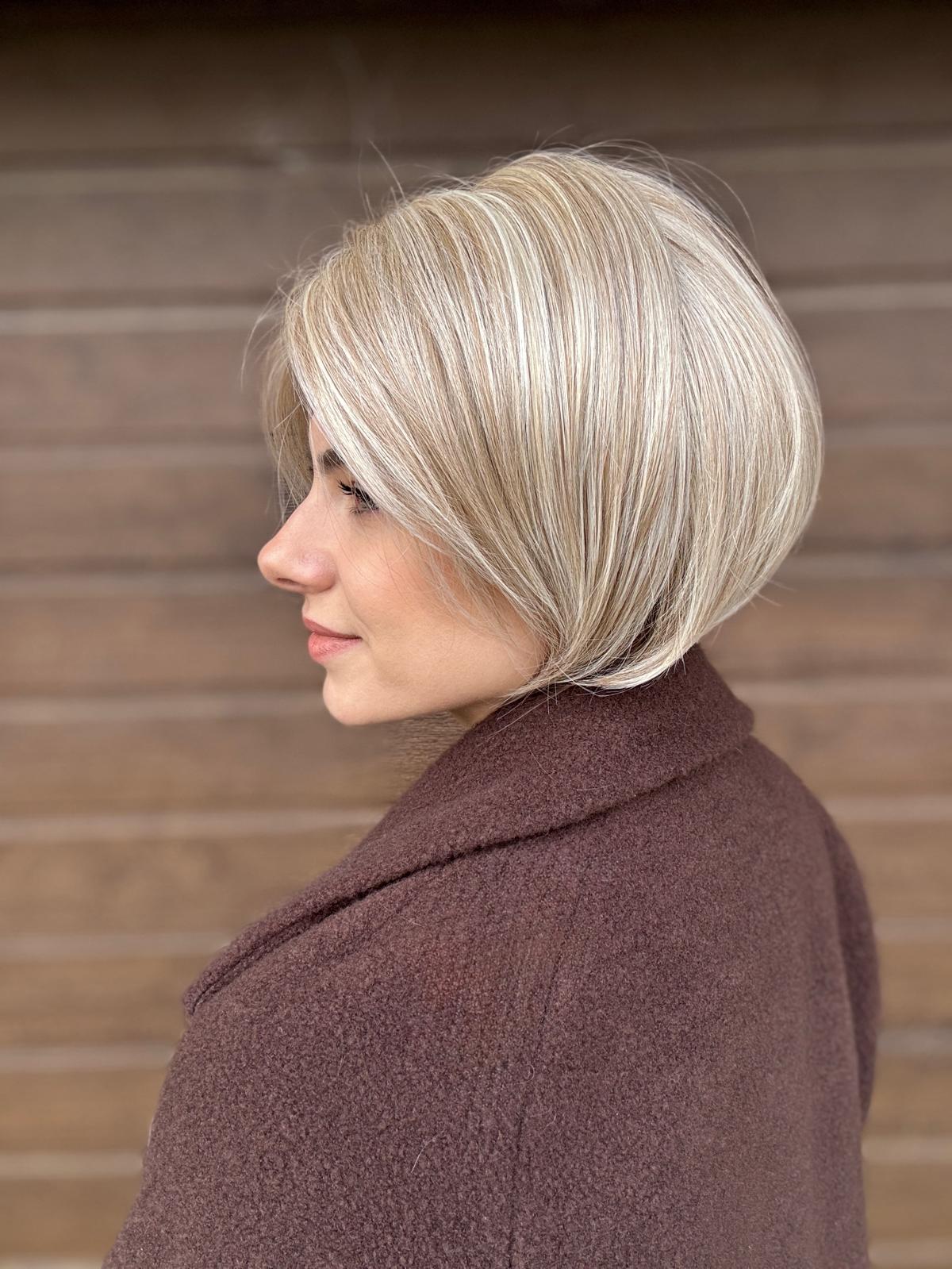 Fryzura: krótki bob w neutralnym blondzie, z naturalnie rozmytą linią czoła