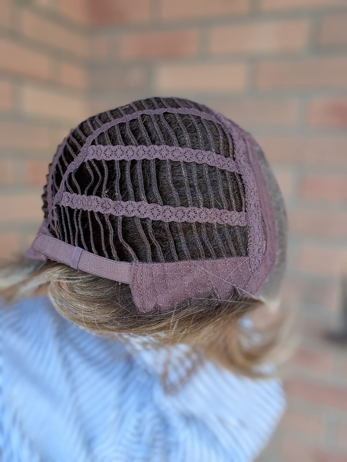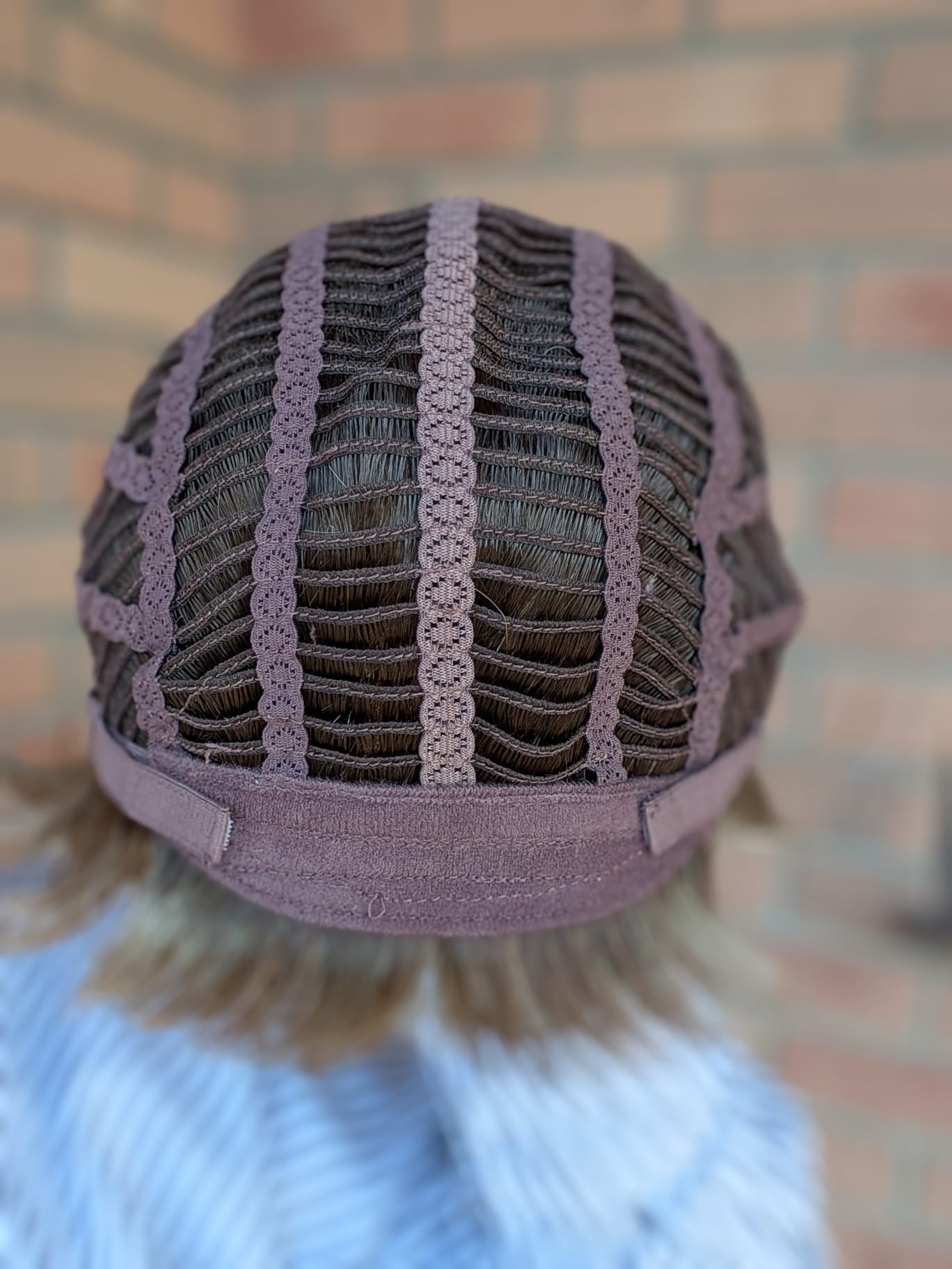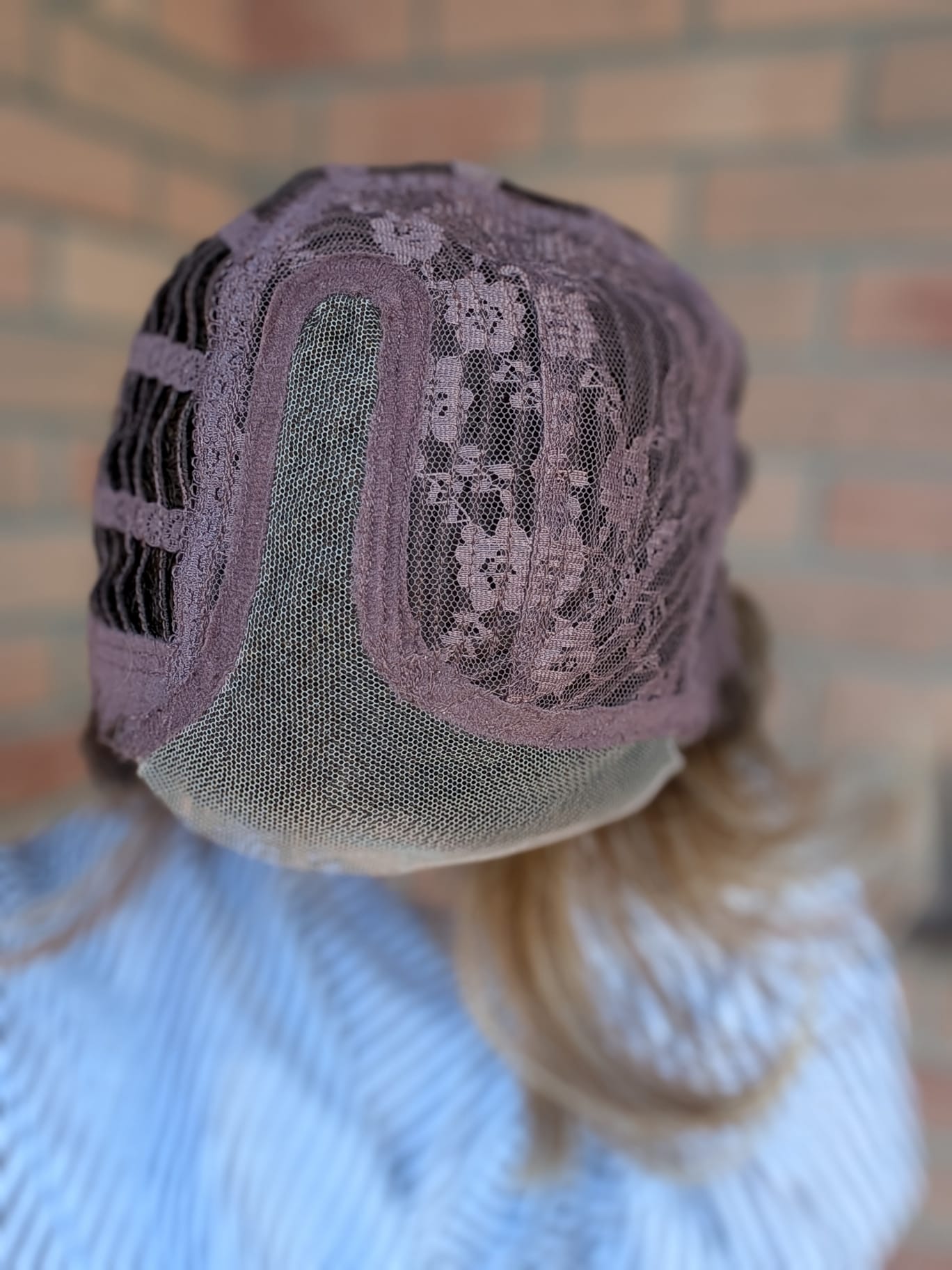 • Czepek: lace front w kształcie litery „T” – naturalna linia włosów, przedziałek po lewej stronie