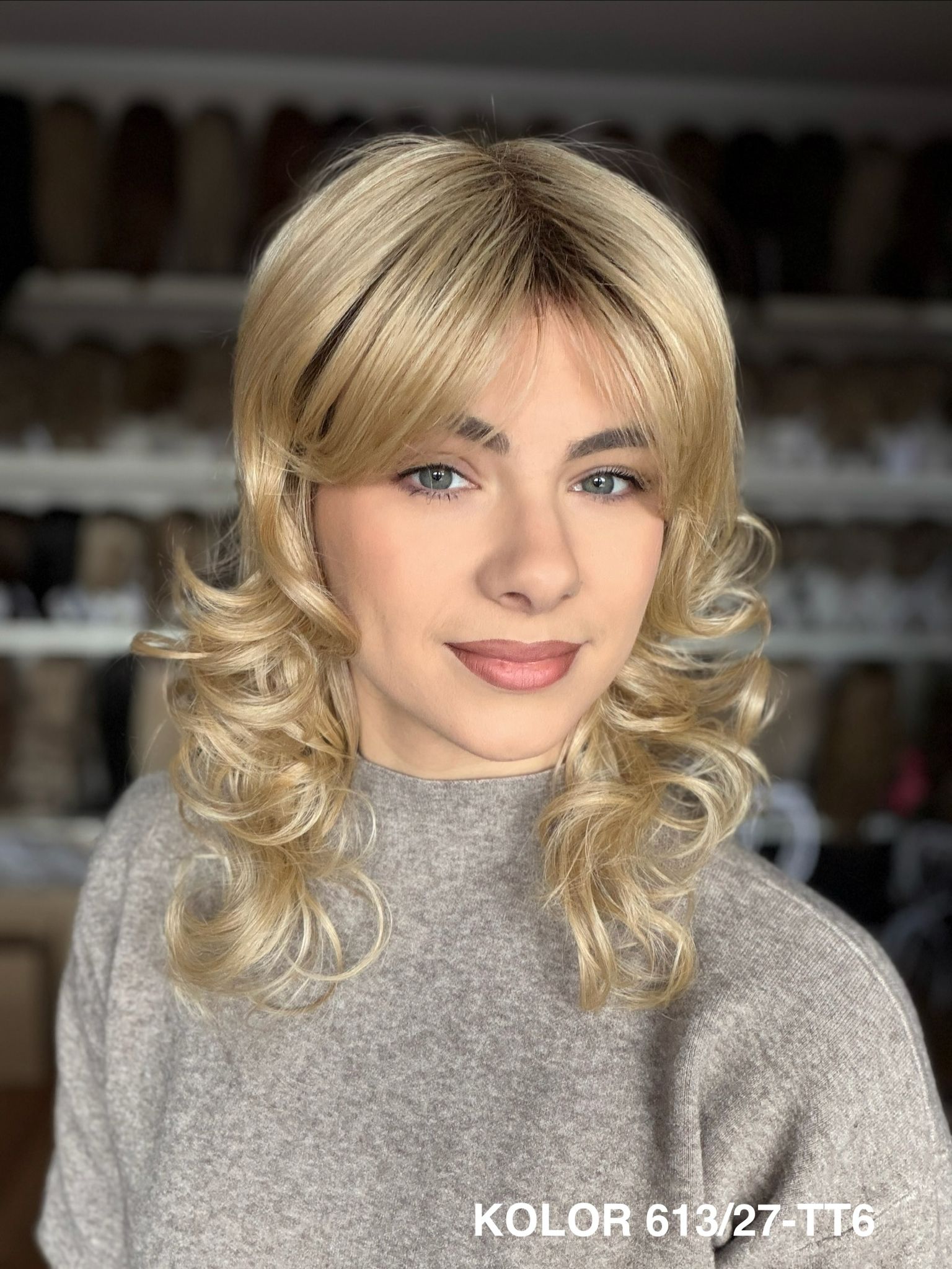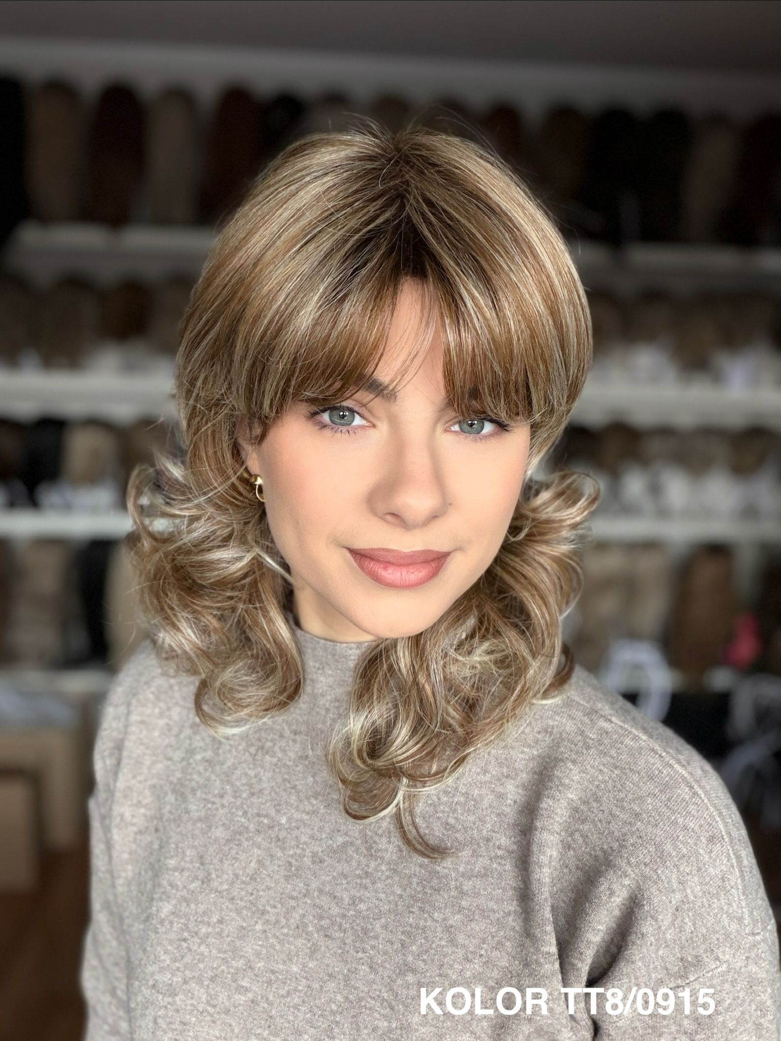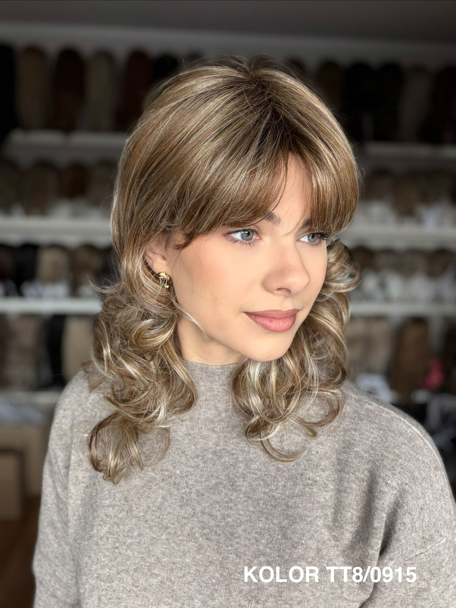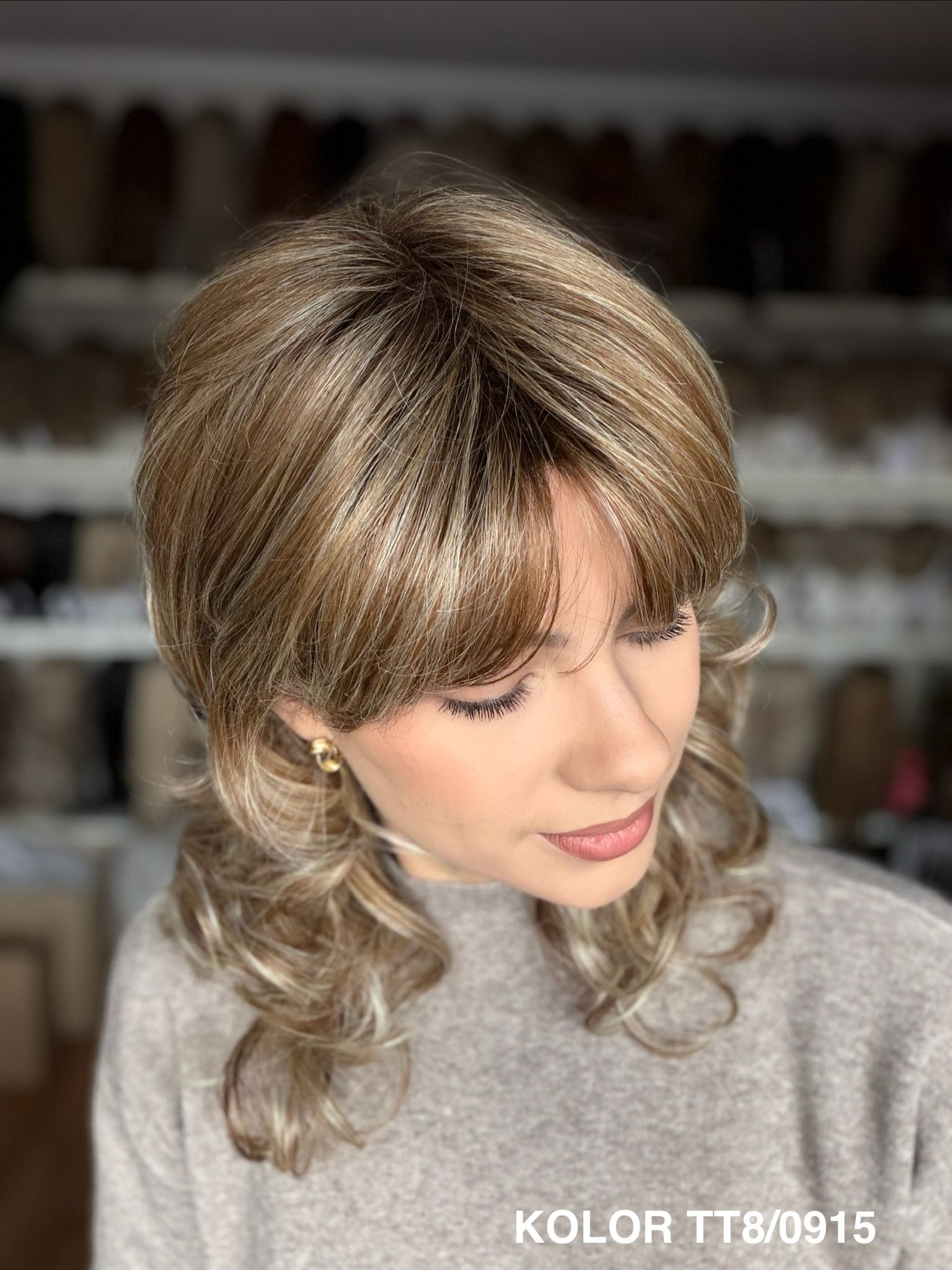 Peruka Cecylia to kobieca, stopniowo cieniowana fryzura z grzywką, która miękko otula twarz i nadaje całości lekkości. Od linii ucha włosy są mocniej wycieniowane, tworząc efekt swobodnych, sprężystych loków o wyraźnym ruchu. Dzięki takiej konstrukcji model pięknie pracuje przy każdym ruchu głowy i doskonale sprawdza się przy różnego rodzaju upięciach – od luźnych półupięć po bardziej eleganckie stylizacje. To propozycja dla kobiet, które chcą objętości, wyrazistego kształtu i fryzury, która daje wiele możliwości stylizacyjnych.