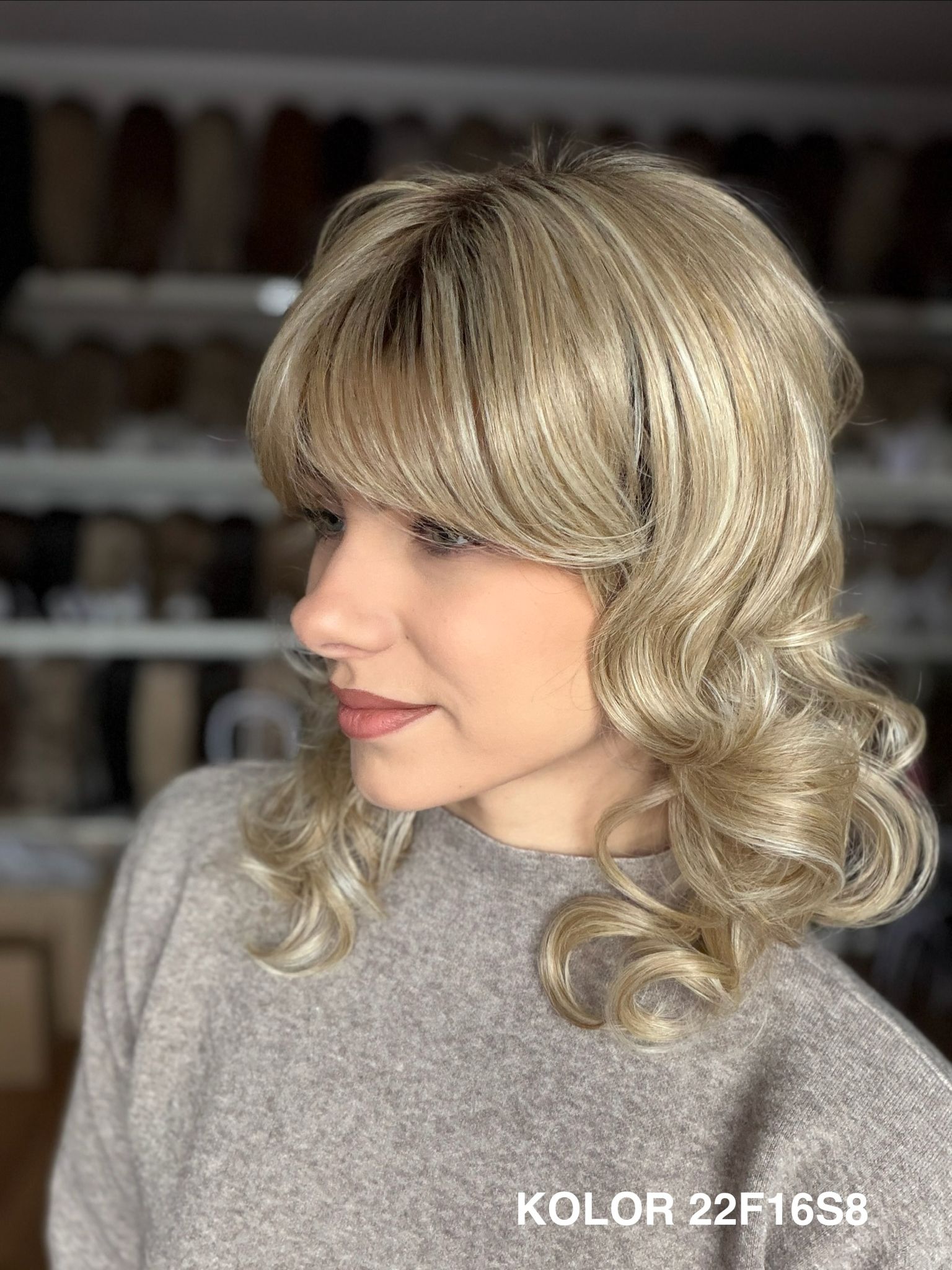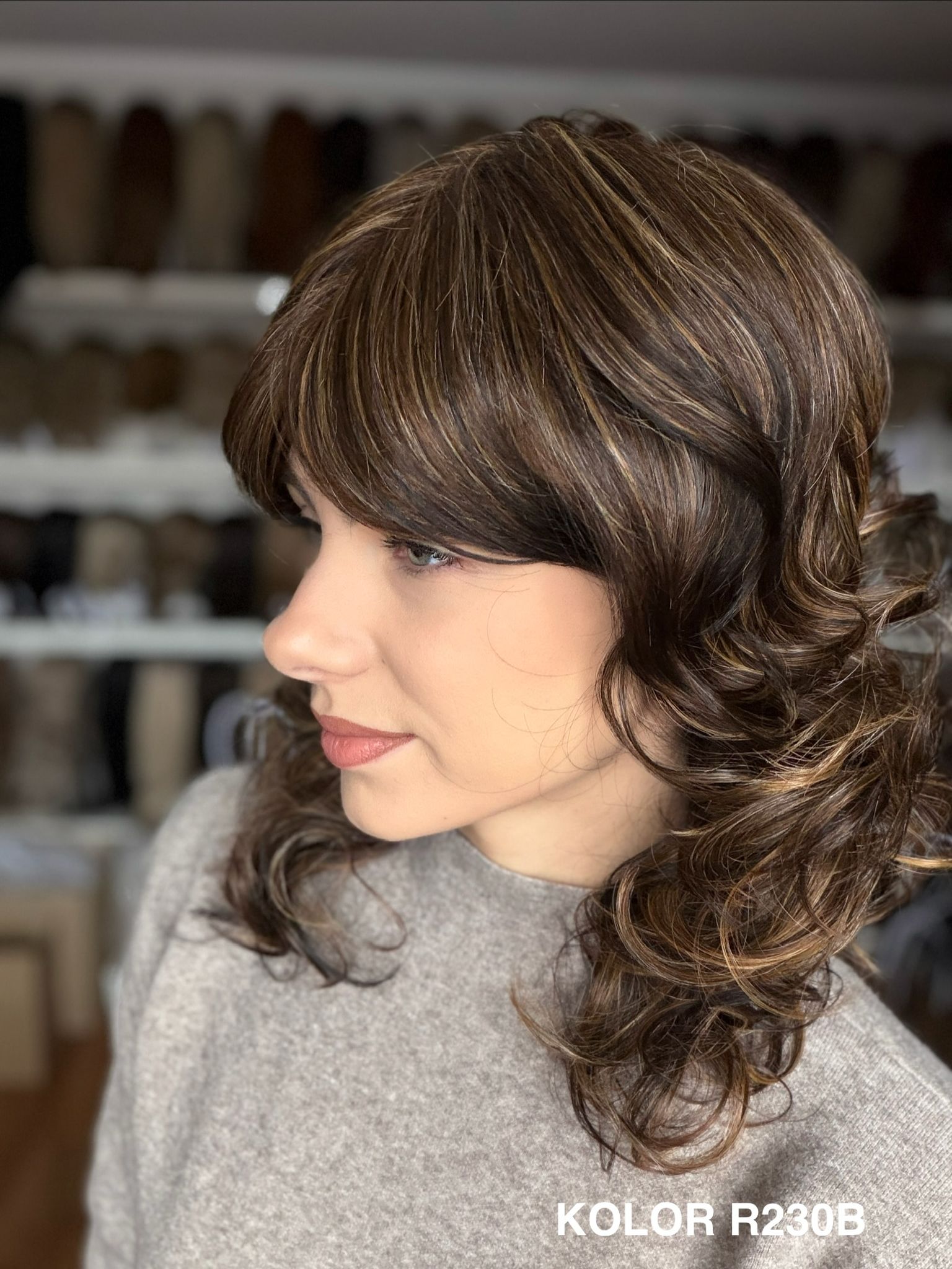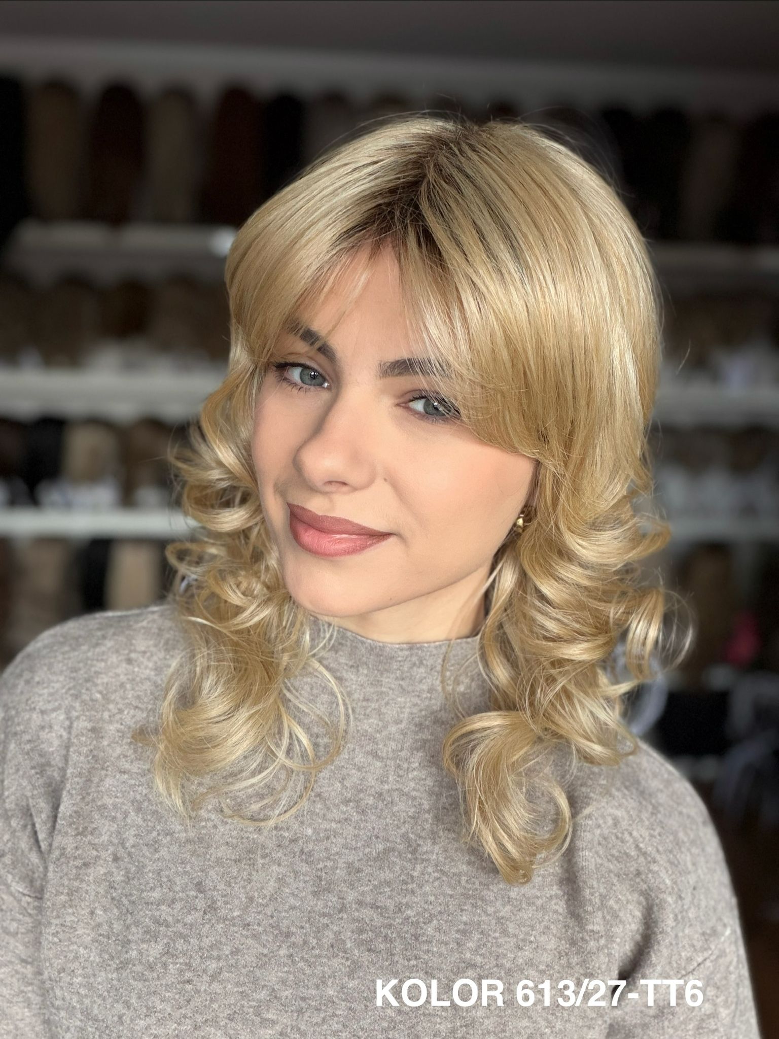 Peruka Cecylia to kobieca, stopniowo cieniowana fryzura z grzywką, która miękko otula twarz i nadaje całości lekkości. Od linii ucha włosy są mocniej wycieniowane, tworząc efekt swobodnych, sprężystych loków o wyraźnym ruchu. Dzięki takiej konstrukcji model pięknie pracuje przy każdym ruchu głowy i doskonale sprawdza się przy różnego rodzaju upięciach – od luźnych półupięć po bardziej eleganckie stylizacje. To propozycja dla kobiet, które chcą objętości, wyrazistego kształtu i fryzury, która daje wiele możliwości stylizacyjnych.