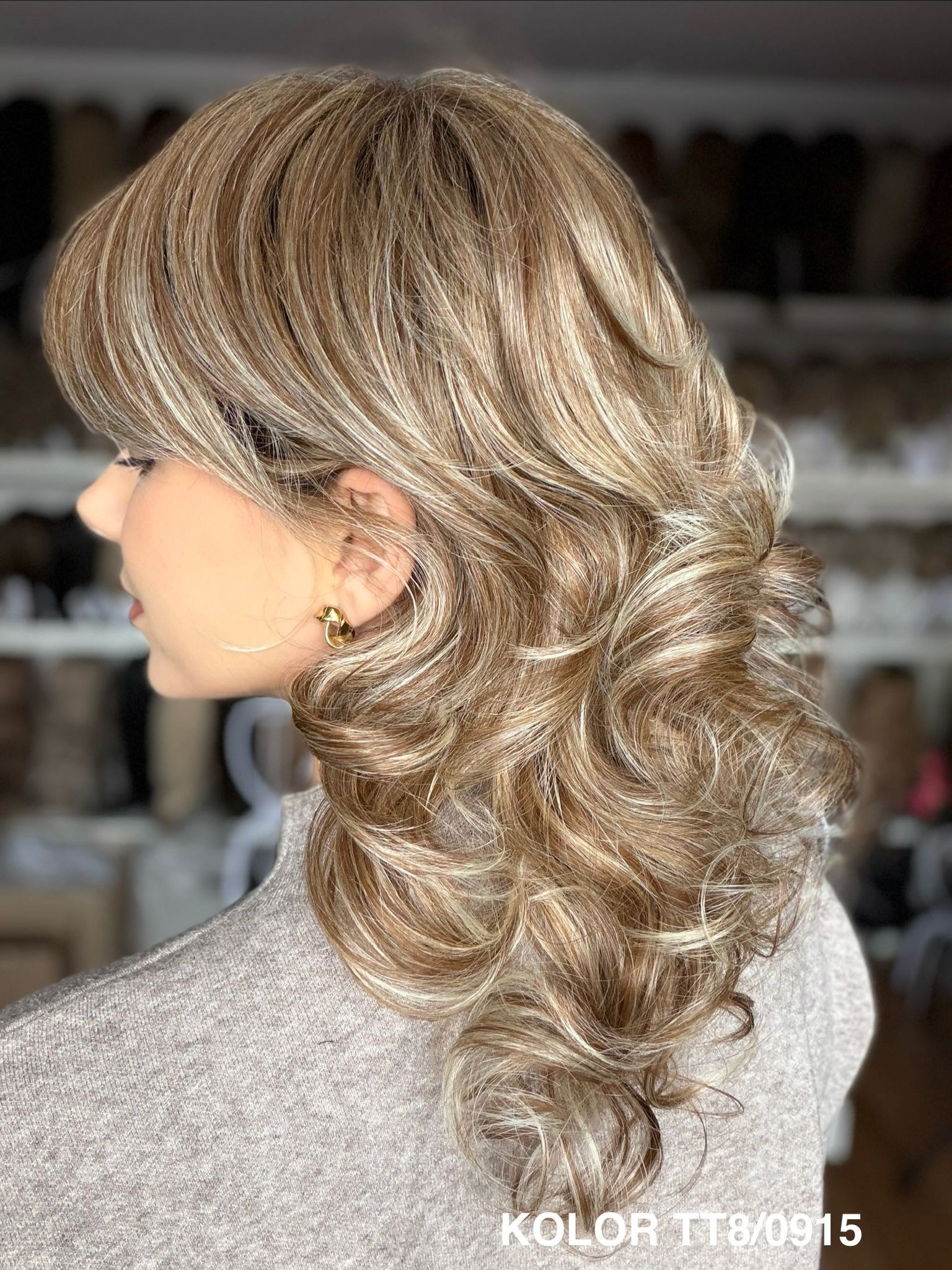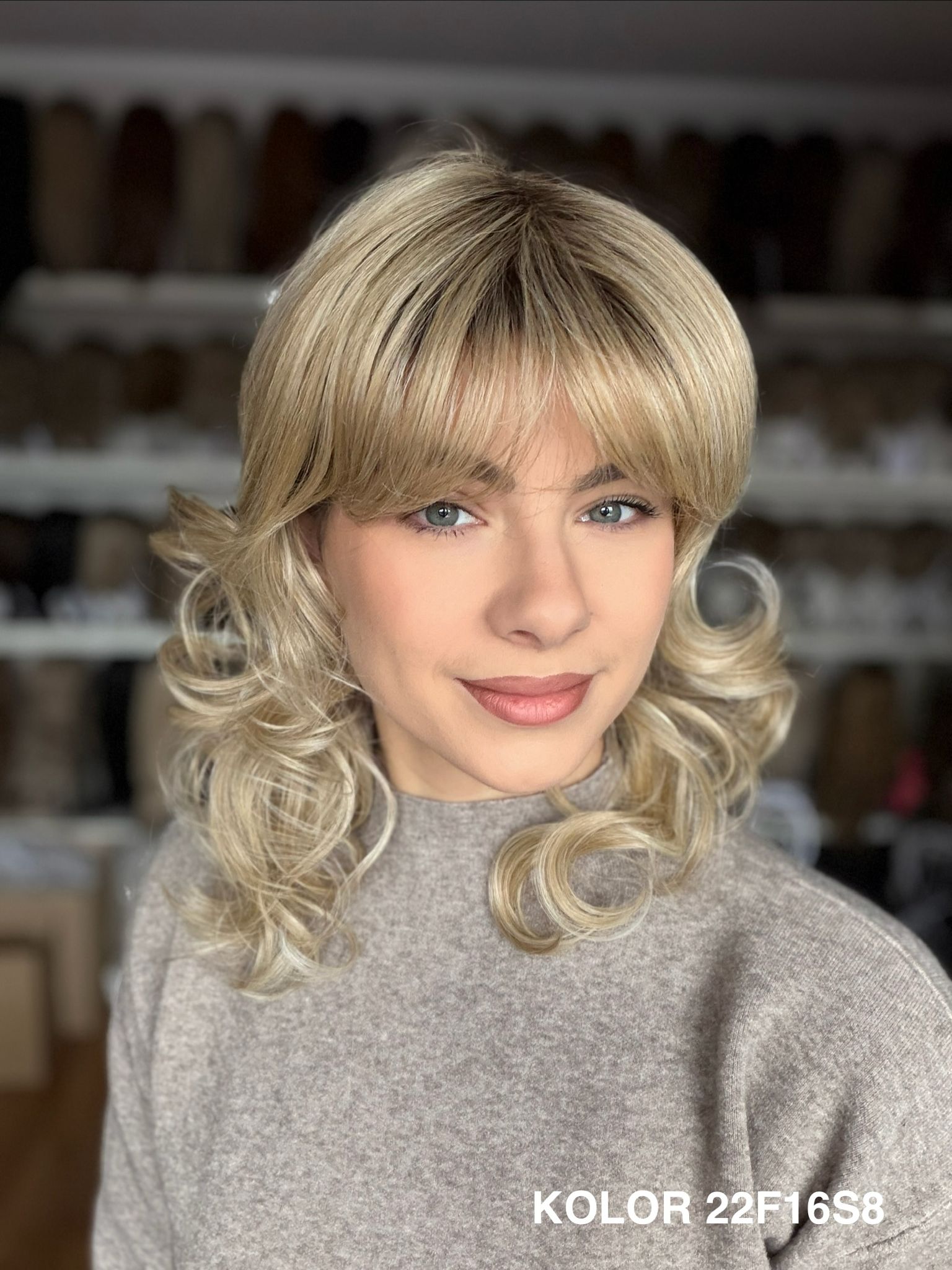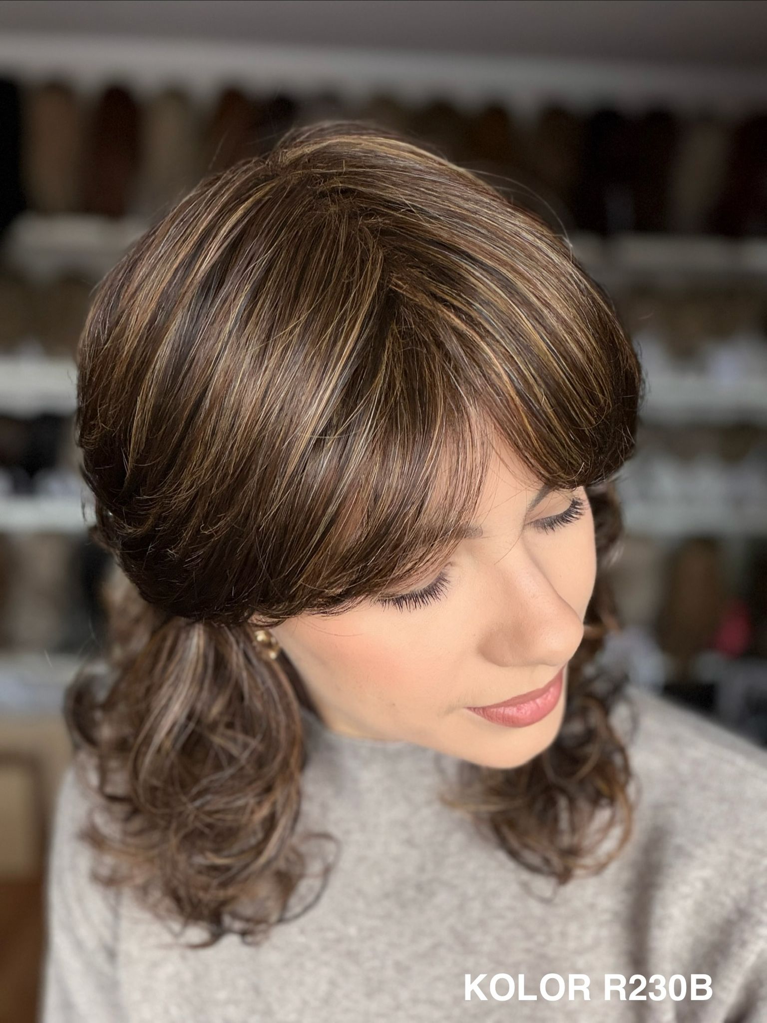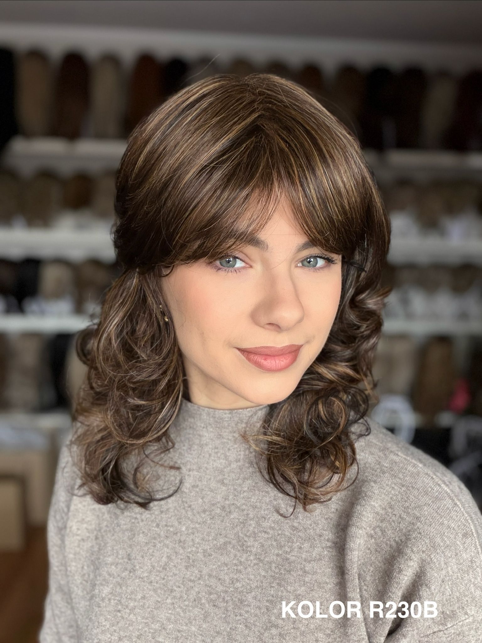 Peruka Cecylia to kobieca, stopniowo cieniowana fryzura z grzywką, która miękko otula twarz i nadaje całości lekkości. Od linii ucha włosy są mocniej wycieniowane, tworząc efekt swobodnych, sprężystych loków o wyraźnym ruchu. Dzięki takiej konstrukcji model pięknie pracuje przy każdym ruchu głowy i doskonale sprawdza się przy różnego rodzaju upięciach – od luźnych półupięć po bardziej eleganckie stylizacje. To propozycja dla kobiet, które chcą objętości, wyrazistego kształtu i fryzury, która daje wiele możliwości stylizacyjnych.