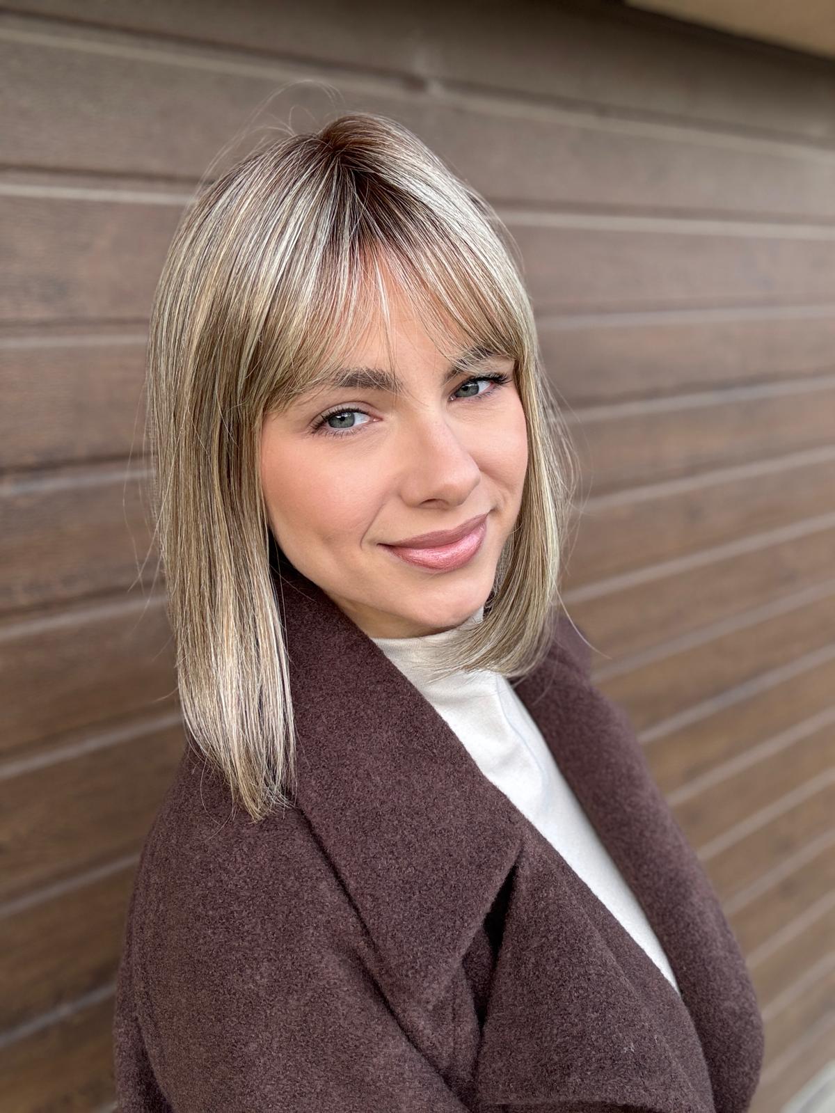 - Rodzaj fryzury: Półdługie proste włosy z grzywką.