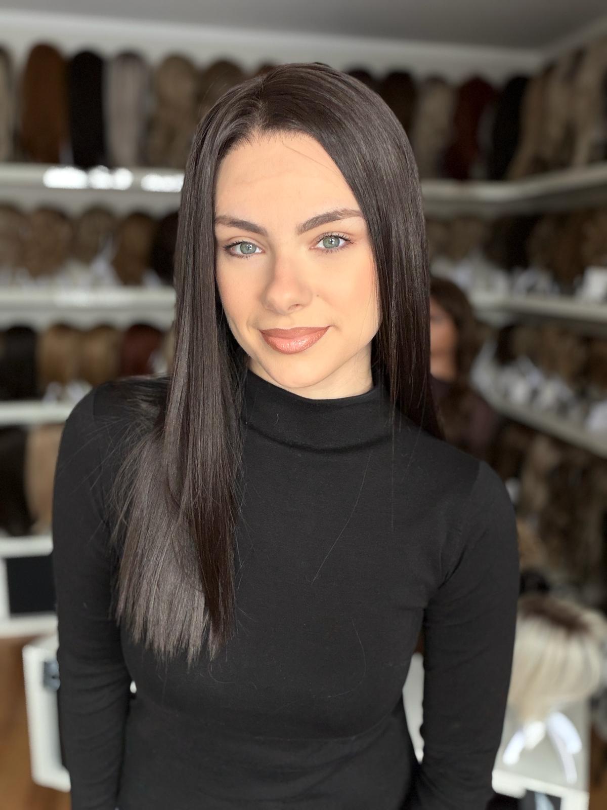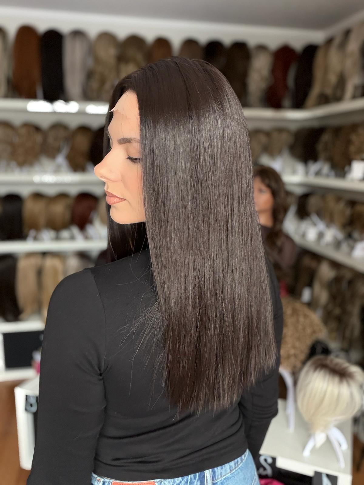 Peruka Julita to ponadczasowy klasyk w eleganckim wydaniu – długi, prosty włos o lekkiej, naturalnej formie, który pięknie układa się przy twarzy i daje efekt zadbanej, dopracowanej fryzury. Model zachwyca wyjątkowo realistyczną linią brzegową czoła – subtelnie rozmytą i miękko przechodzącą w skórę, dzięki czemu całość wygląda niezwykle naturalnie. Głęboki lace front pozwala na swobodną zmianę przedziałka oraz unoszenie włosów u nasady, co daje pełną kontrolę nad stylizacją i eliminuje efekt „płaskiego” ułożenia. Ciemny, chłodny, głęboki brąz podkreśla elegancję modelu i dodaje mu wyrafinowanego charakteru – to kolor, który wygląda szlachetnie i bardzo stylowo.