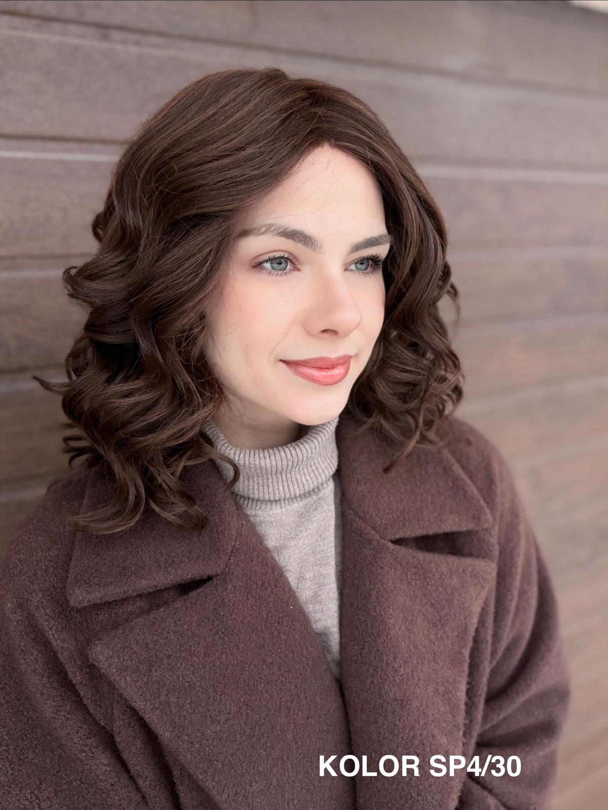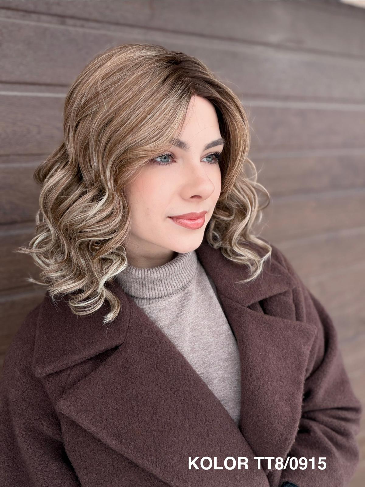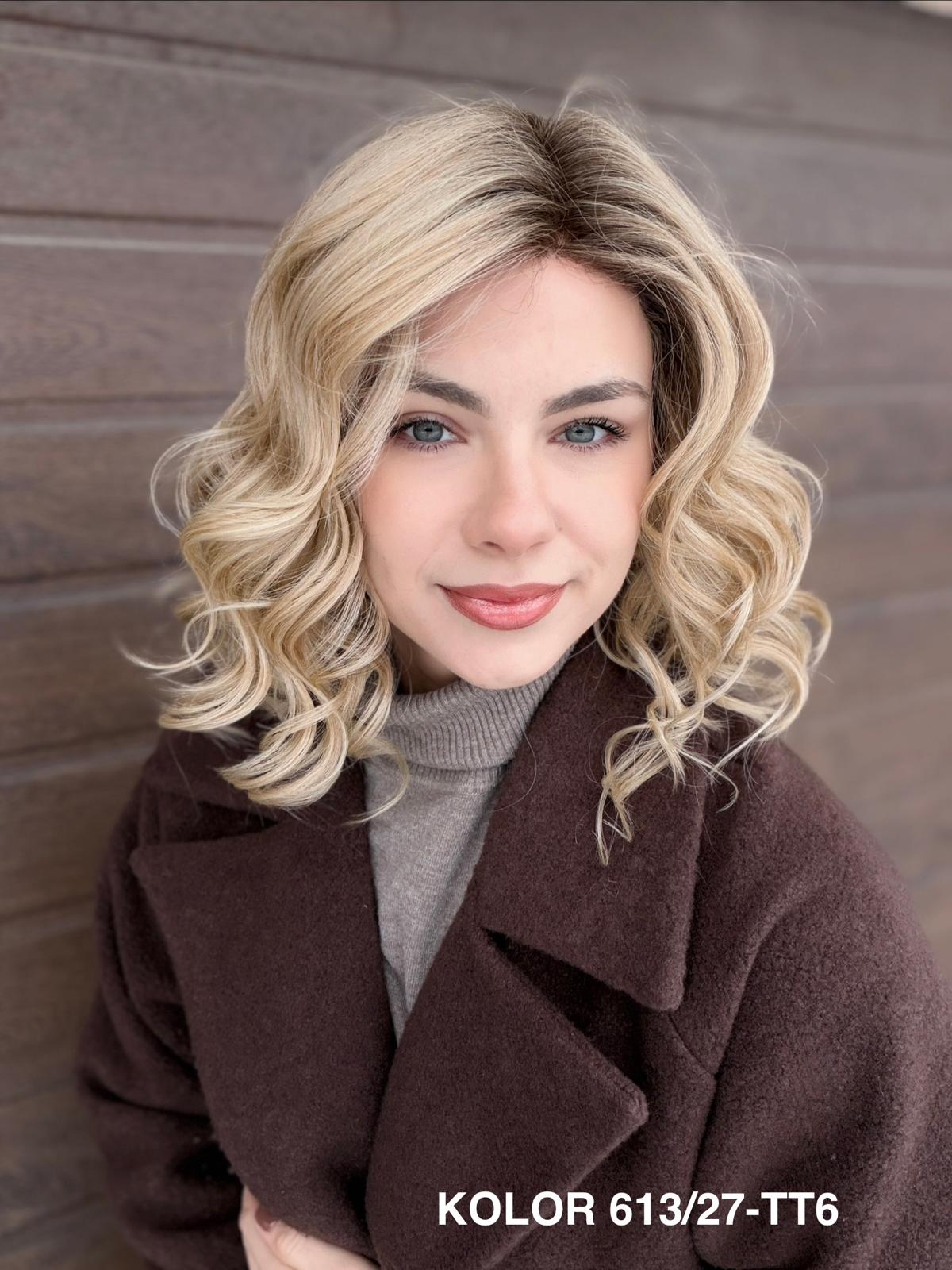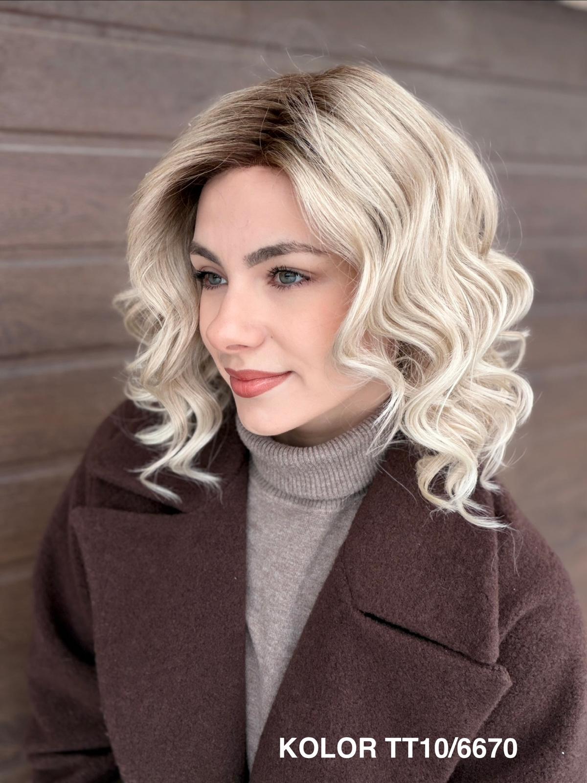 Peruka Nika to elegancka, dopracowana fryzura z wyraźnie zaznaczonym uniesieniem włosów od nasady, które od razu dodaje twarzy świeżości i lekkości. Włosy układają się miękko i naturalnie, tworząc harmonijną całość bez efektu ciężkości. Długość sięgająca okolic ramion sprawia, że model jest bardzo uniwersalny — subtelny i wygodny na co dzień, a jednocześnie wystarczająco efektowny na bardziej eleganckie okazje. Całość prezentuje się niezwykle naturalnie, jak starannie wystylizowane własne włosy.