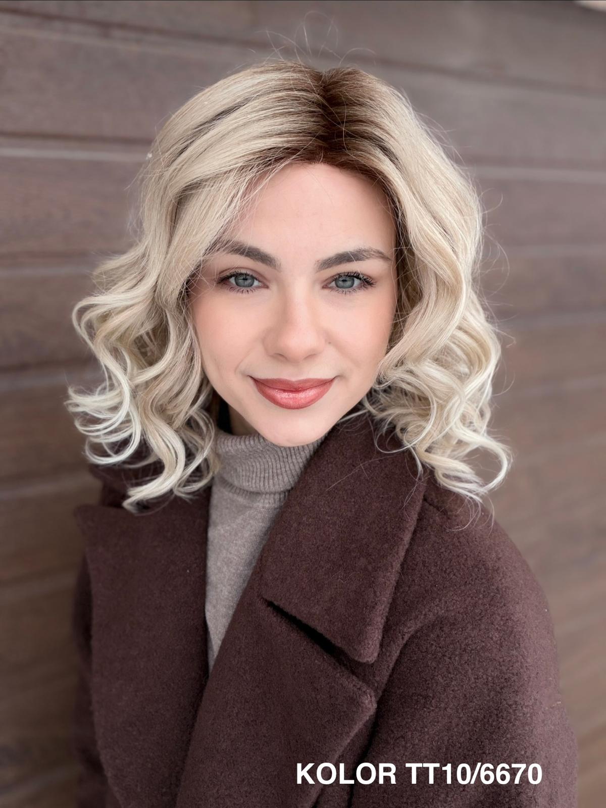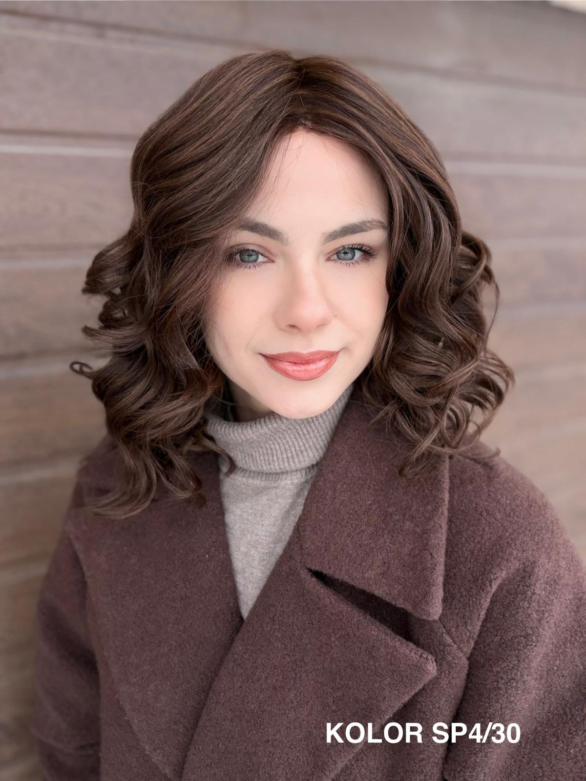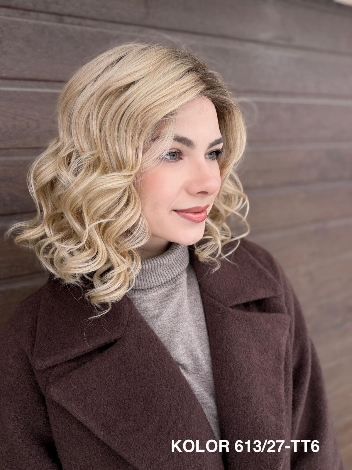 Peruka Nika to elegancka, dopracowana fryzura z wyraźnie zaznaczonym uniesieniem włosów od nasady, które od razu dodaje twarzy świeżości i lekkości. Włosy układają się miękko i naturalnie, tworząc harmonijną całość bez efektu ciężkości. Długość sięgająca okolic ramion sprawia, że model jest bardzo uniwersalny — subtelny i wygodny na co dzień, a jednocześnie wystarczająco efektowny na bardziej eleganckie okazje. Całość prezentuje się niezwykle naturalnie, jak starannie wystylizowane własne włosy.