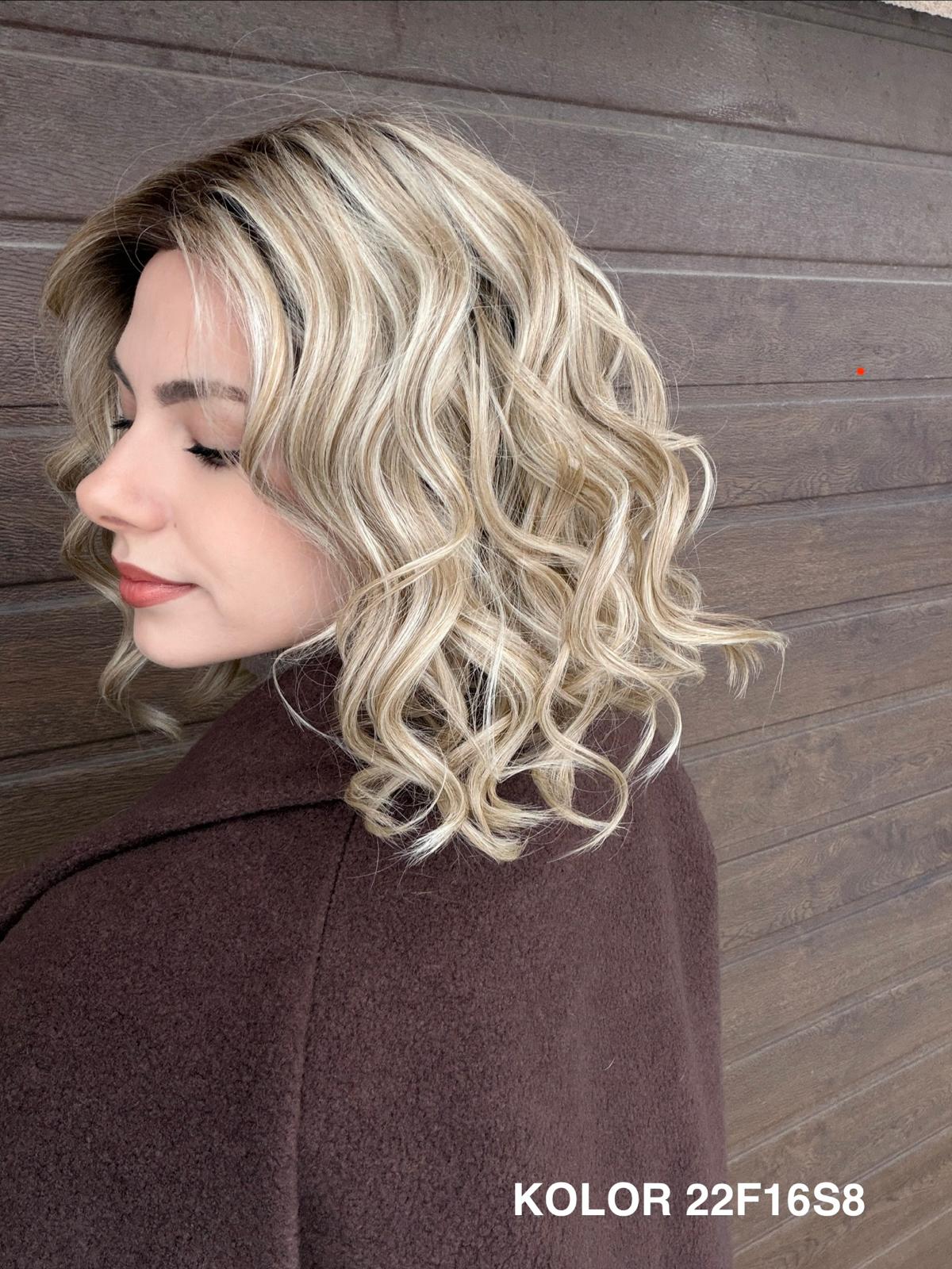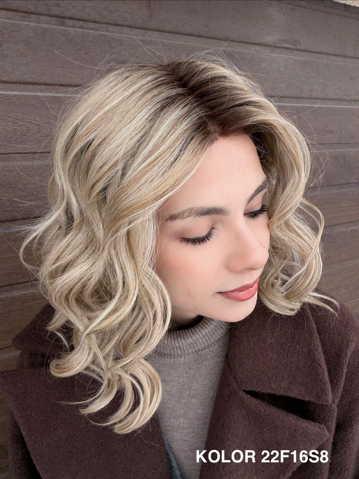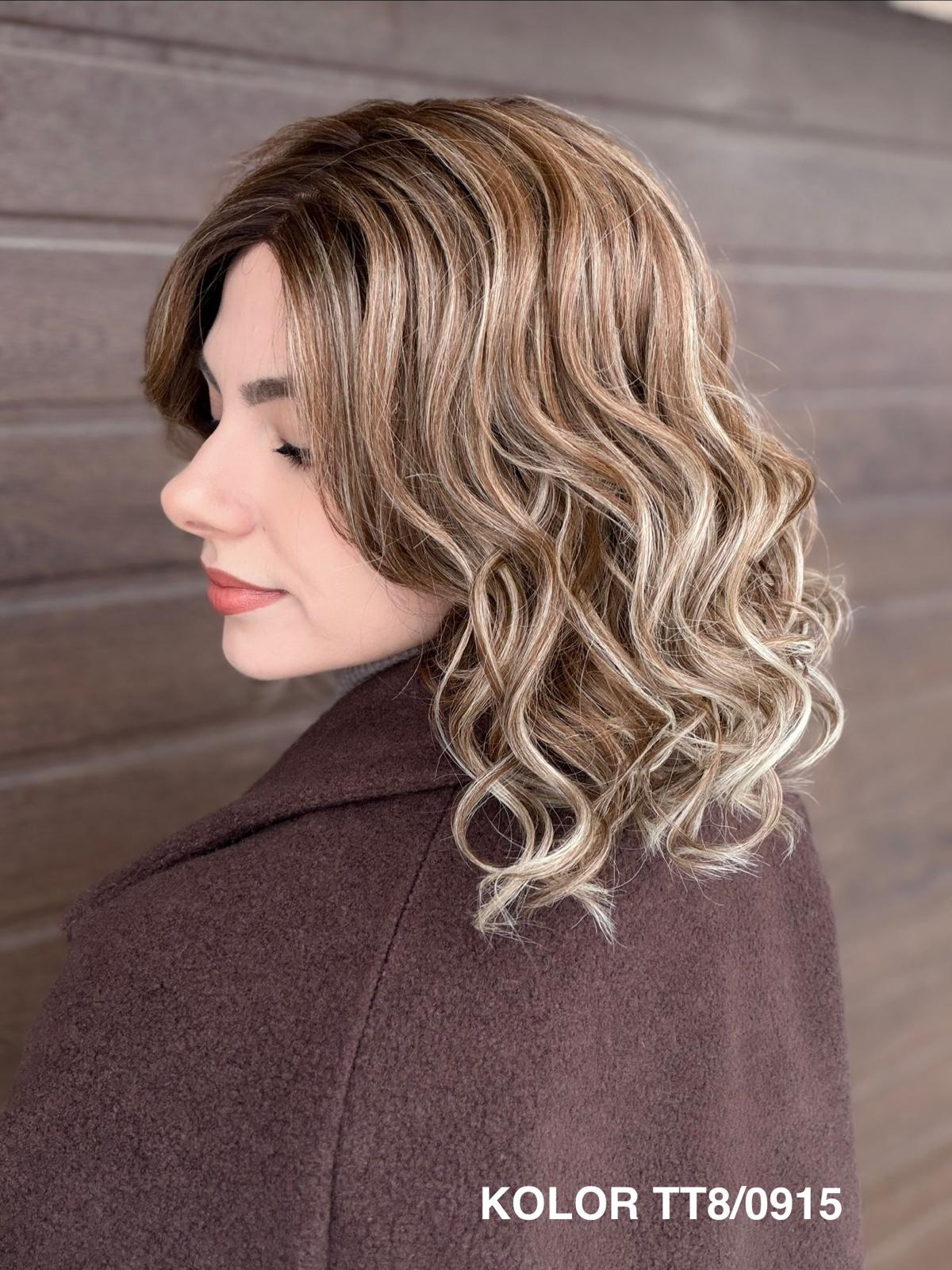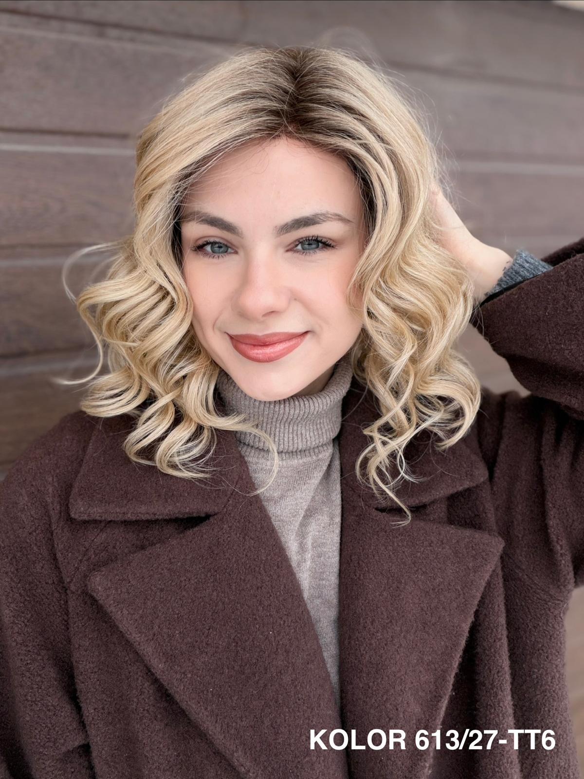 Peruka Nika to elegancka, dopracowana fryzura z wyraźnie zaznaczonym uniesieniem włosów od nasady, które od razu dodaje twarzy świeżości i lekkości. Włosy układają się miękko i naturalnie, tworząc harmonijną całość bez efektu ciężkości. Długość sięgająca okolic ramion sprawia, że model jest bardzo uniwersalny — subtelny i wygodny na co dzień, a jednocześnie wystarczająco efektowny na bardziej eleganckie okazje. Całość prezentuje się niezwykle naturalnie, jak starannie wystylizowane własne włosy.