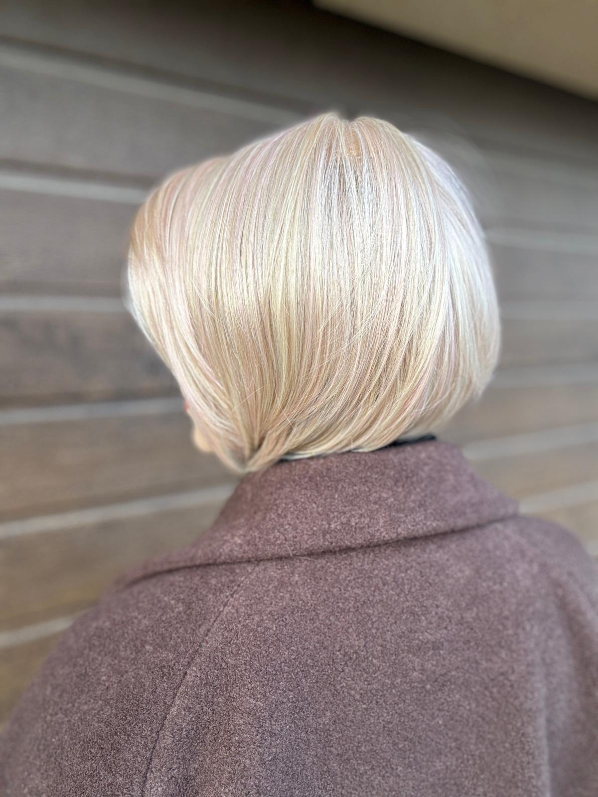 Lara to krótki, delikatnie cieniowany bob o długości około 25 cm, który od razu przyciąga wzrok swoim absolutnie wyjątkowym kolorem. Subtelny chłodny odcień został przełamany efektem różowego „nitkowania” — to rzadko spotykane połączenie, które tworzy prawdziwe wow i nadaje fryzurze niezwykłej oryginalności. Włosy układają się lekko, miękko i bardzo twarzowo, a jeśli ktoś lubi, można je również łatwo dopasować poprzez ewentualne docięcie grzywki.