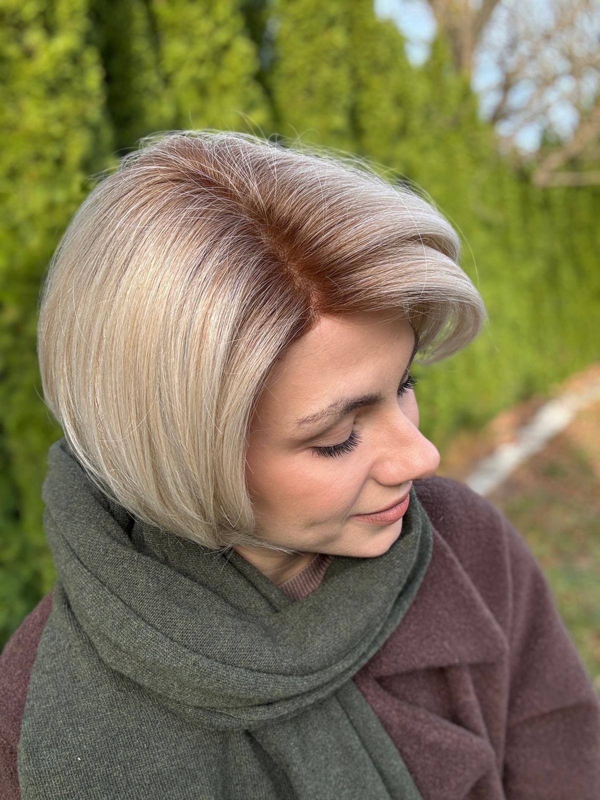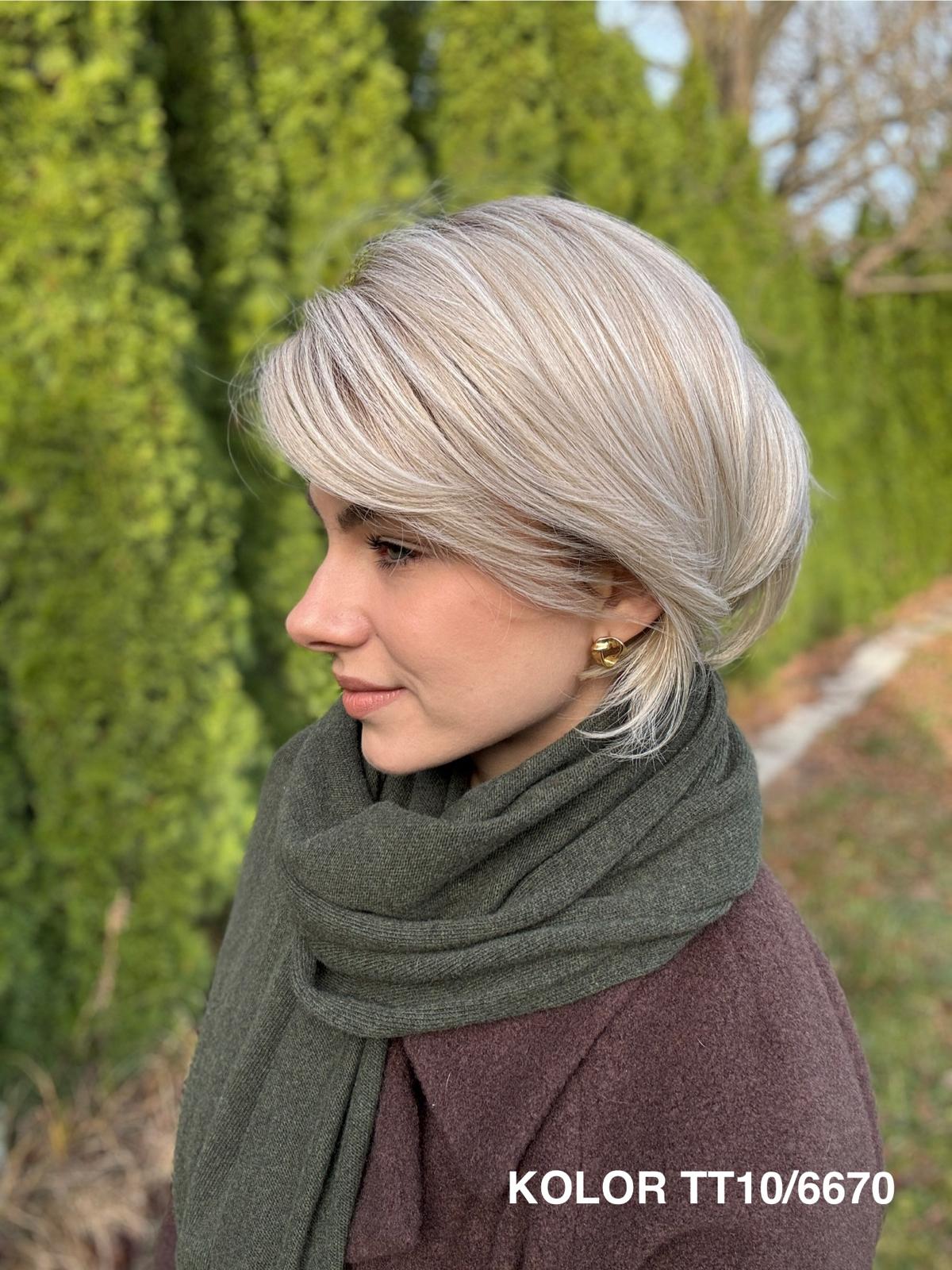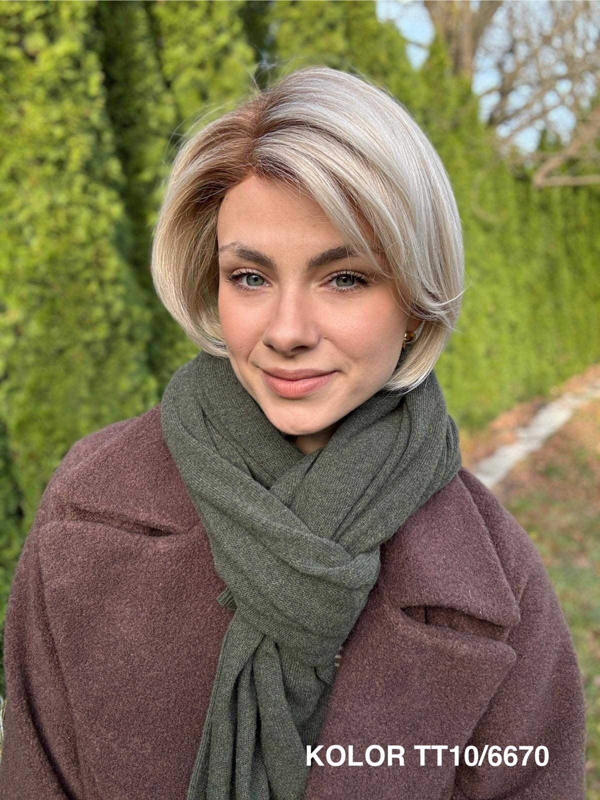 Krótkie, gęste włosy o długości ok. 25 cm, lekko podwinięte przy karku, tworzą klasycznego boba z objętością i miękkim wykończeniem. Fryzura posiada delikatną grzywkę, która łączy się z przedziałkiem i przechodzi w dłuższe pasma boczne. Dzięki konstrukcji Mono Top istnieje możliwość dowolnej stylizacji – włosy można przekładać i zmieniać przedziałek, dostosowując fryzurę do swojego stylu.