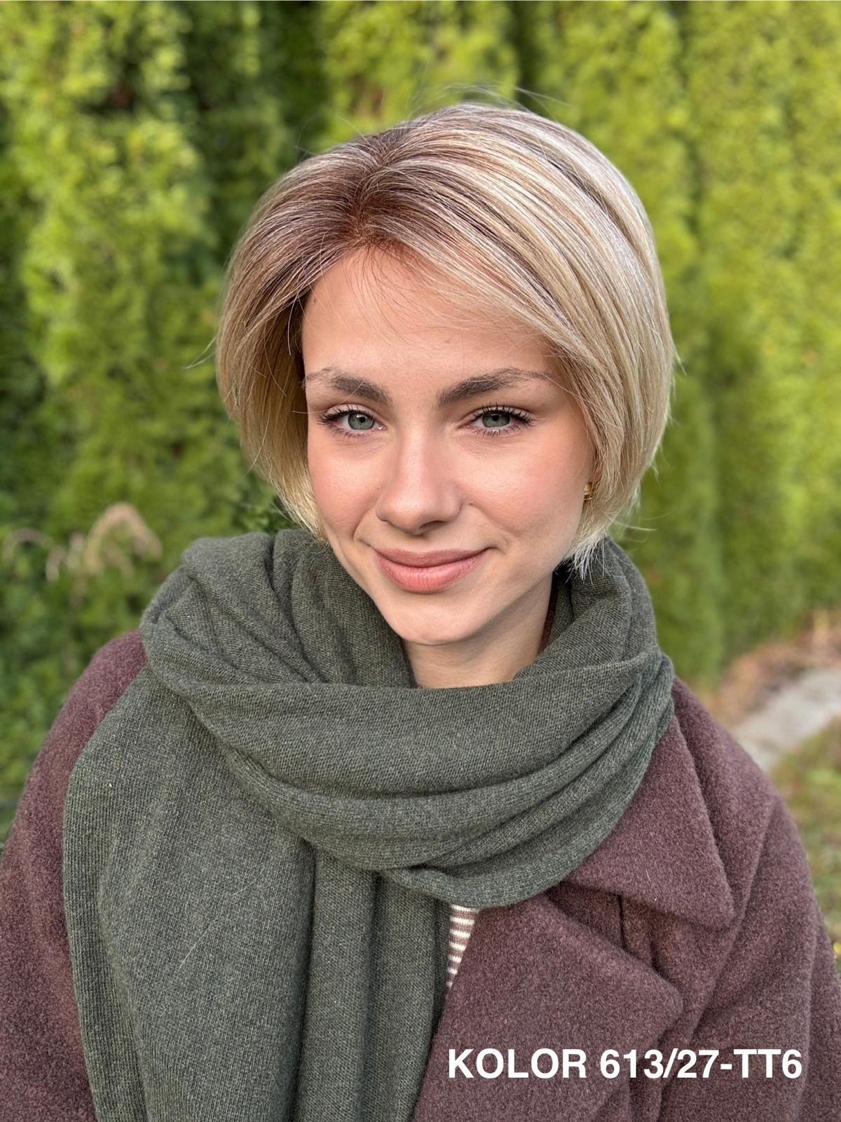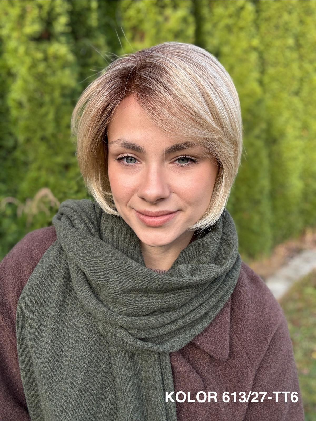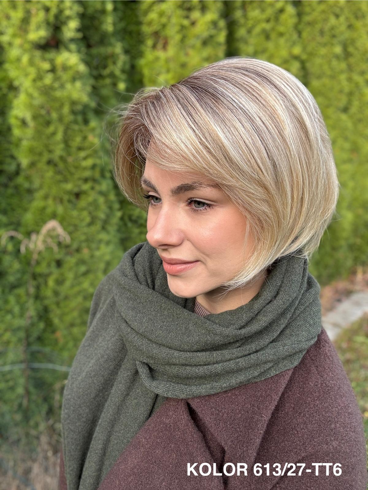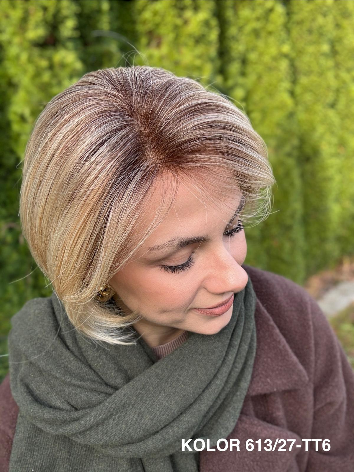 Peruka „Marisa” to połączenie elegancji, naturalności i wygody, które sprawia, że możesz czuć się pięknie i pewnie w każdej sytuacji. Krótsza fryzura  subtelnie podkreśla rysy twarzy, dodając świeżości i lekkości. Dzięki konstrukcji Mono Top możesz dowolnie stylizować fryzurę – zmieniać przedziałek, przekładać włosy i cieszyć się pełną swobodą oraz naturalnym efektem.
