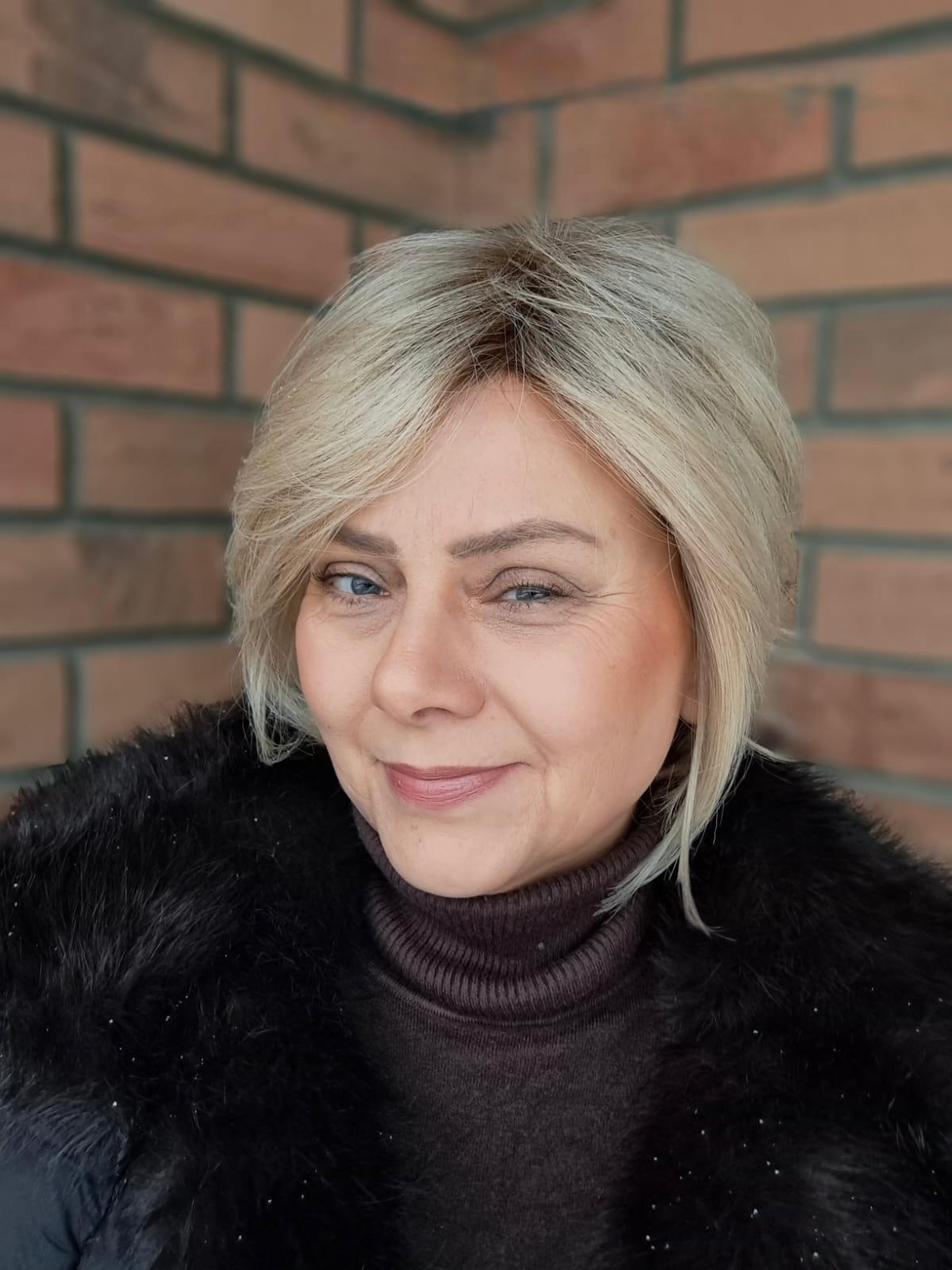 Peruka „Molly” kobieca, lekka fryzura o pięknej, objętościowej fali i delikatnej grzywce, która subtelnie otula twarz. Dzięki wstawce z monofilamentu na linii brzegowej czoła włosy prezentują się wyjątkowo naturalnie, tworząc efekt miękkiego przejścia i realistycznej linii włosów. Idealna na co dzień i wyjątkowe okazje — dodaje świeżości, ruchu i dziewczęcego uroku.