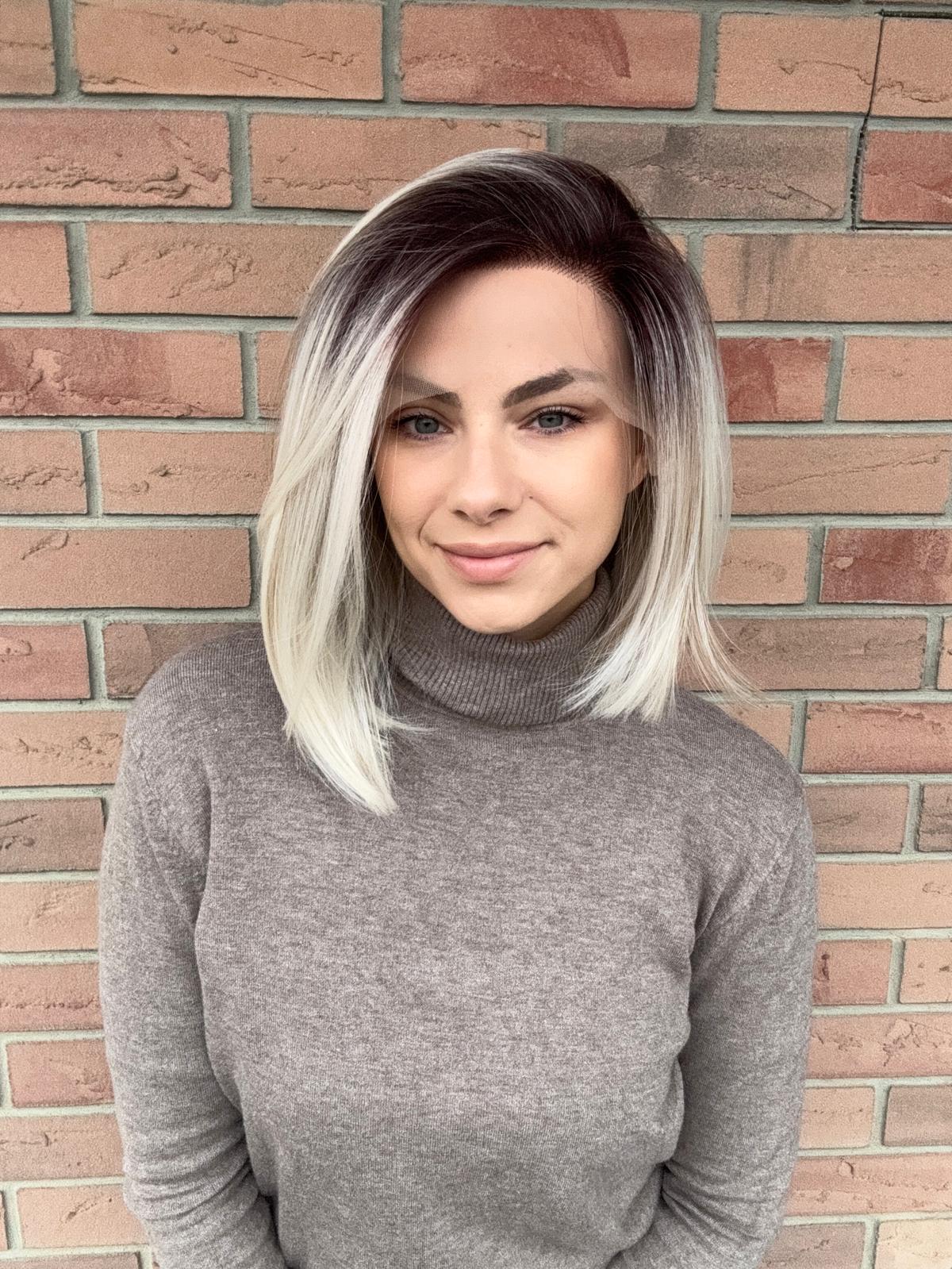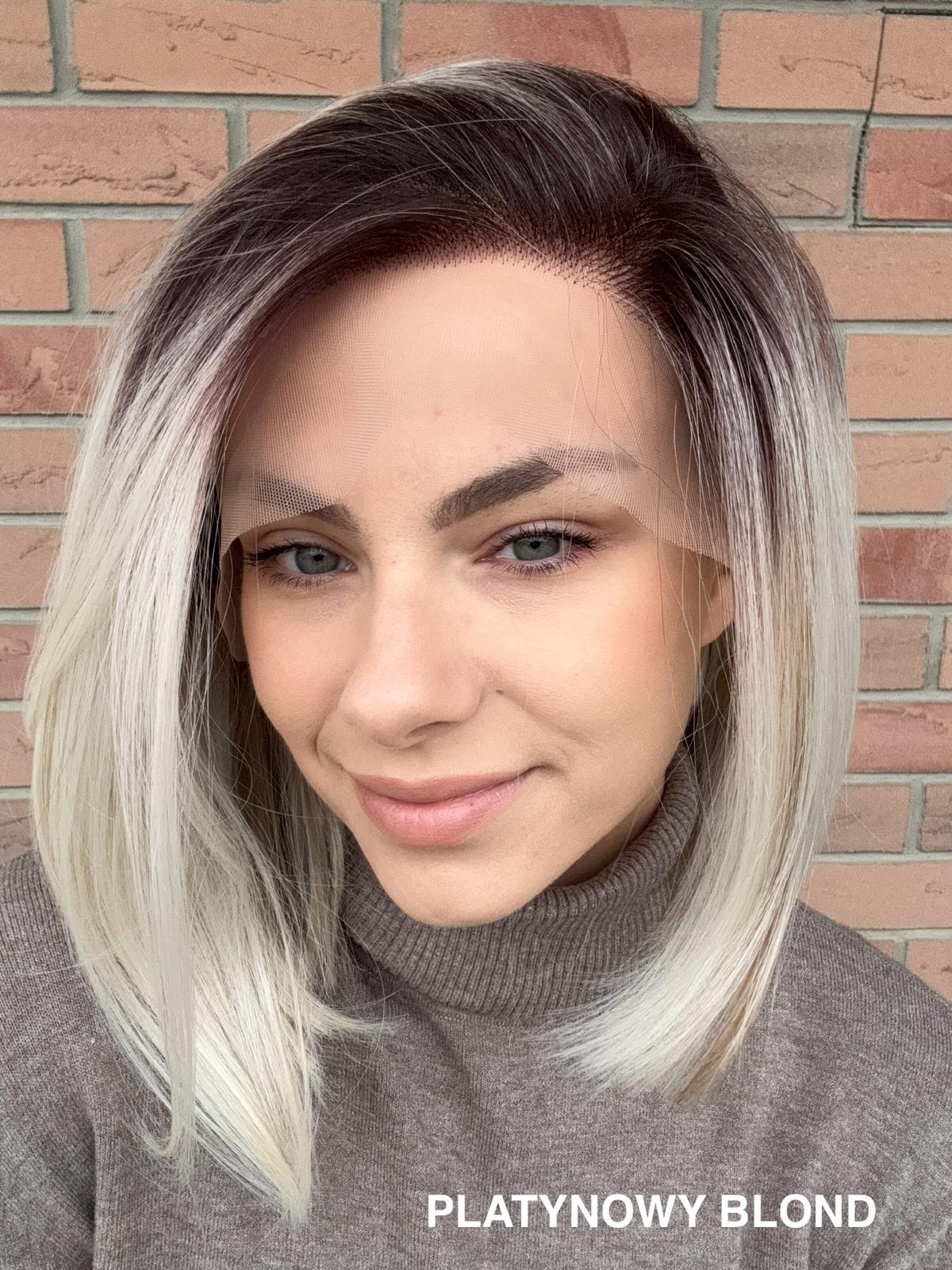 Peruka „Naomi” nowoczesny bob o długości do ramion, który zachwyca naturalnym efektem i eleganckim wykończeniem. Jasny blond w chłodnej tonacji z ciemnym kasztanowym odrostem tworzy subtelny balayage, dodający fryzurze głębi i charakteru. Dzięki lace frontowi możesz zmieniać przedziałek i unosić włosy od nasady, uzyskując lekkość i naturalny wygląd.