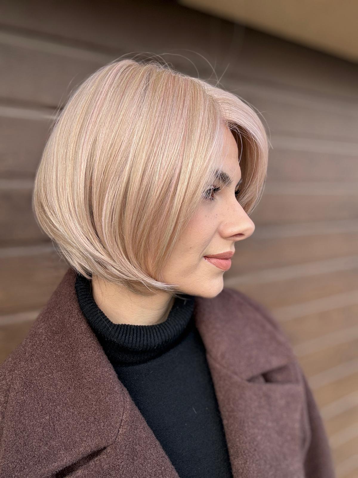 - Rodzaj fryzury: Bob włosy półdługie z grzywką, przedziałek z lewej strony.