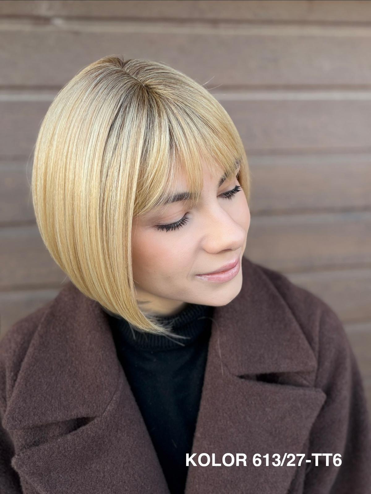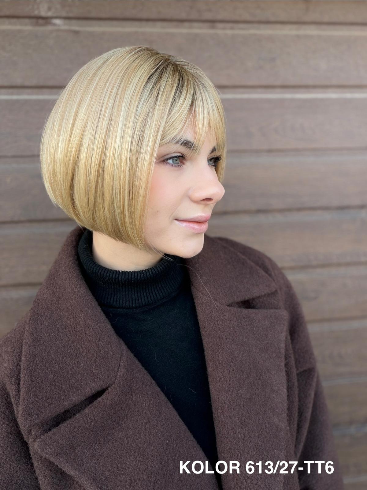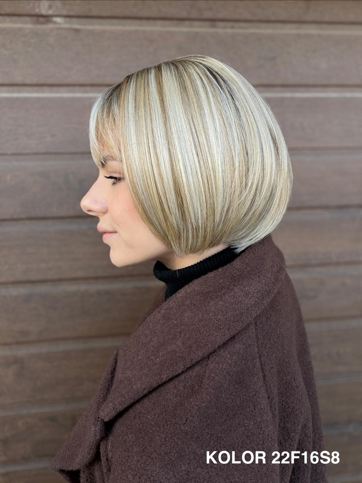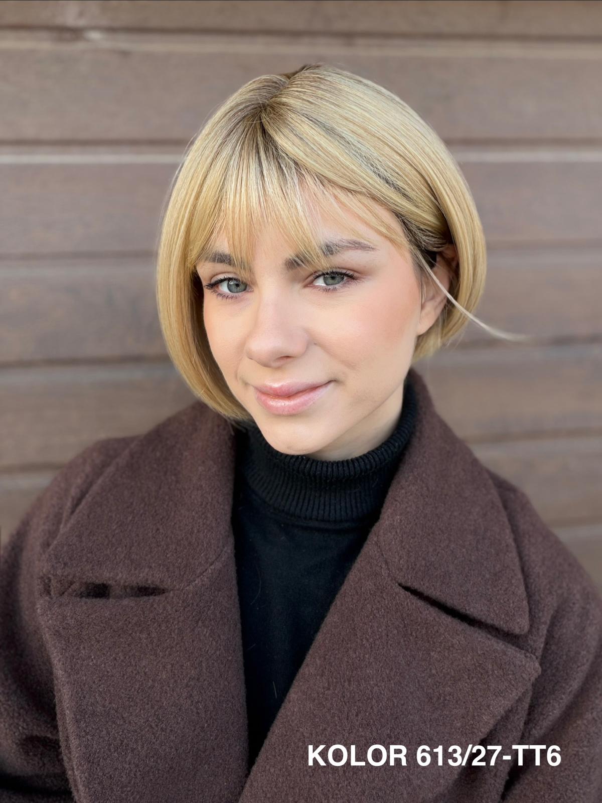 Peruka Gerda to klasyczna, krótka fryzura typu bob, która doskonale sprawdza się na co dzień. Prosta, czysta linia cięcia pięknie układa się przy twarzy i daje bardzo naturalny, spokojny efekt. To peruka, po którą sięga się bez zastanowienia — do pracy, na spotkanie, do codziennych obowiązków — zawsze wtedy, gdy chcesz wyglądać elegancko i czuć się komfortowo przez cały dzień.