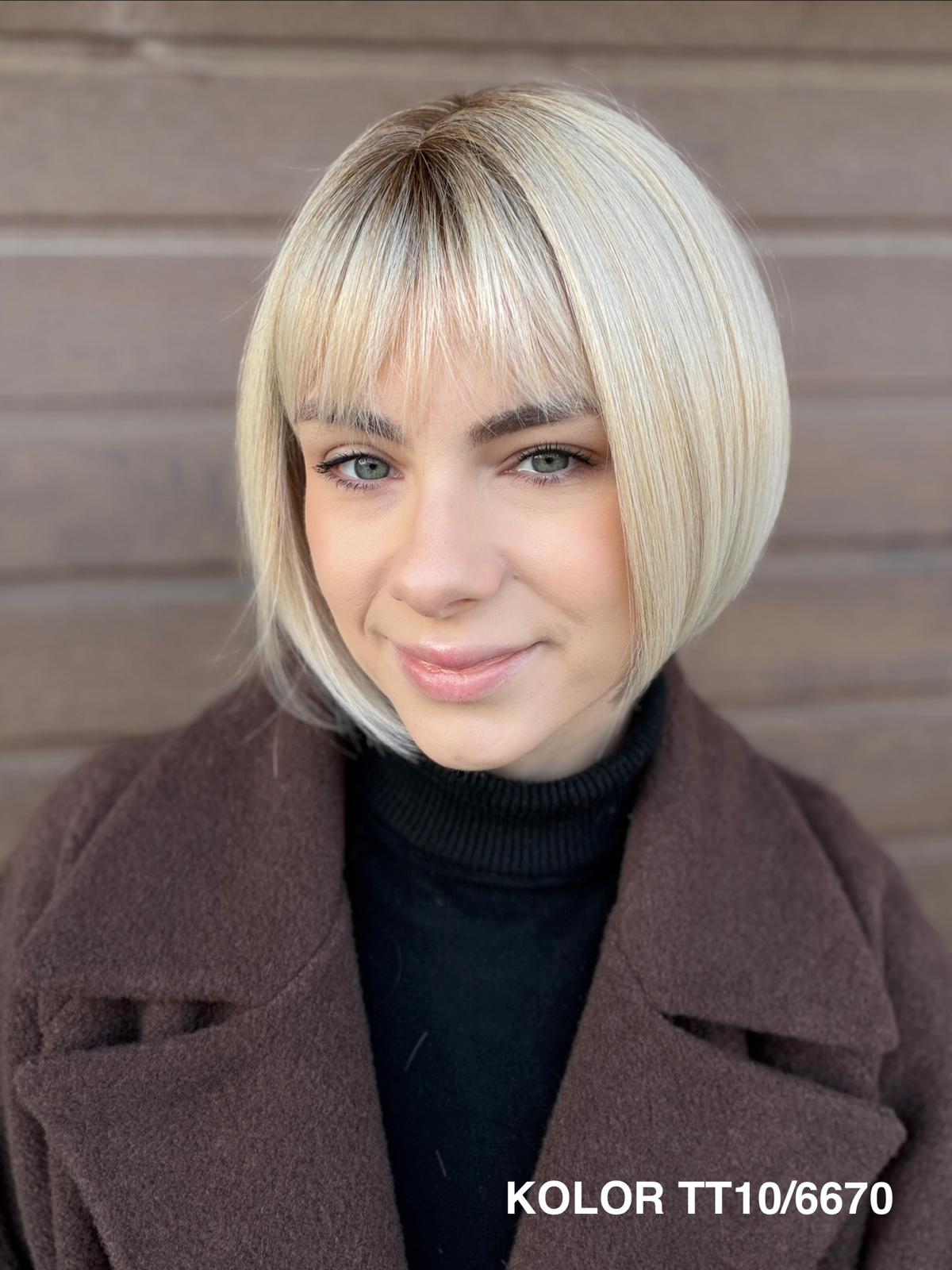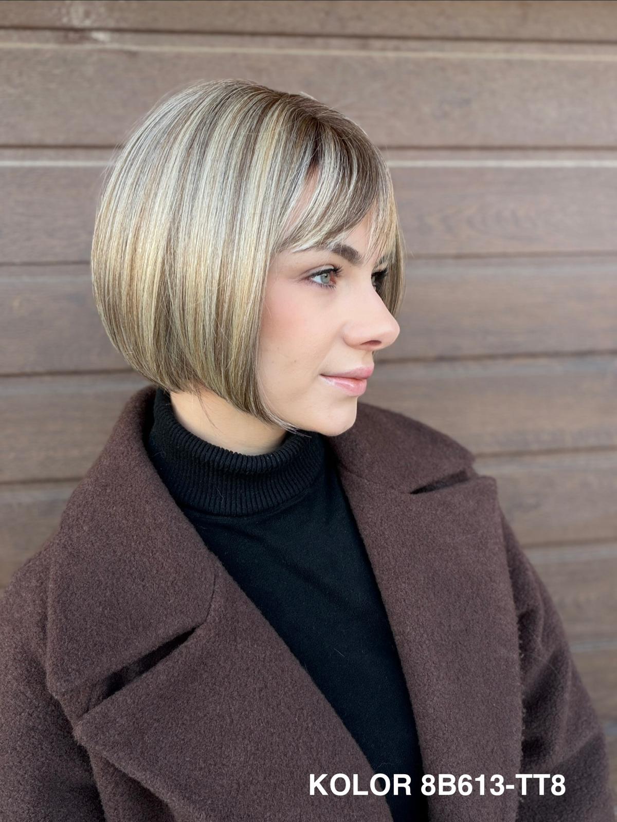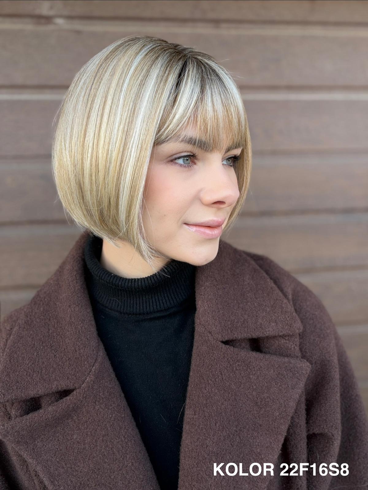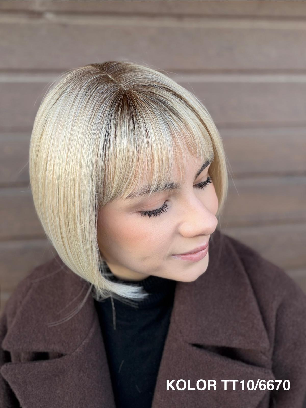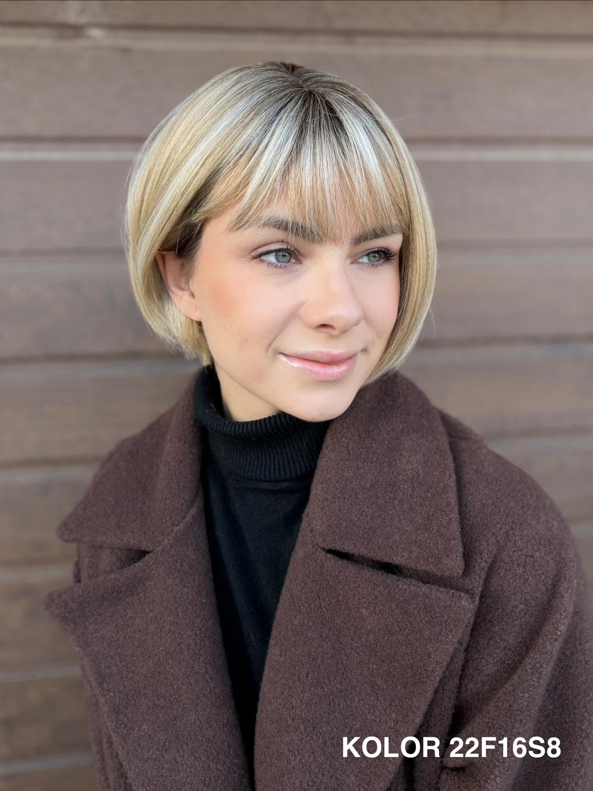 Peruka Gerda to klasyczna, krótka fryzura typu bob, która doskonale sprawdza się na co dzień. Prosta, czysta linia cięcia pięknie układa się przy twarzy i daje bardzo naturalny, spokojny efekt. To peruka, po którą sięga się bez zastanowienia — do pracy, na spotkanie, do codziennych obowiązków — zawsze wtedy, gdy chcesz wyglądać elegancko i czuć się komfortowo przez cały dzień.