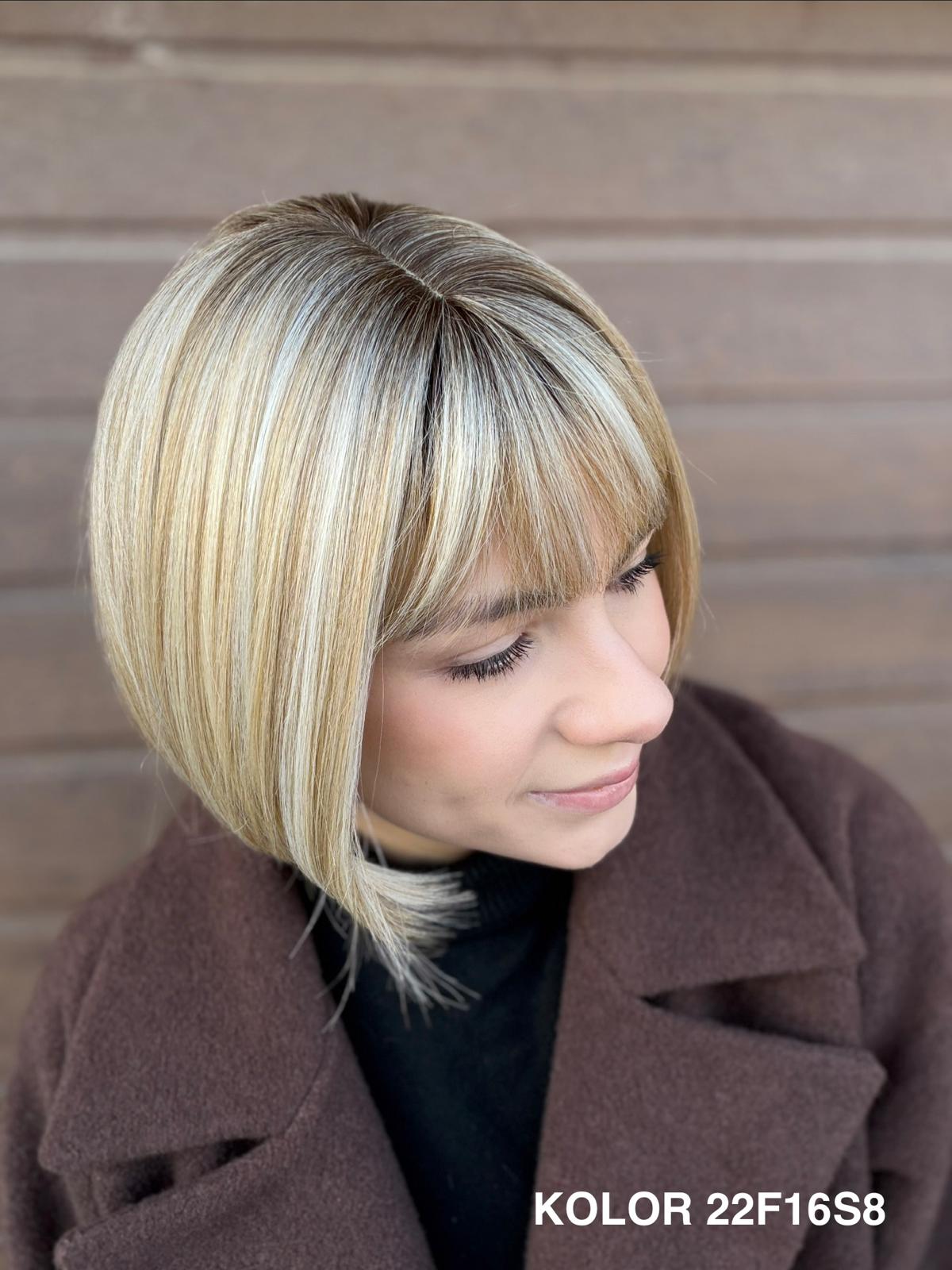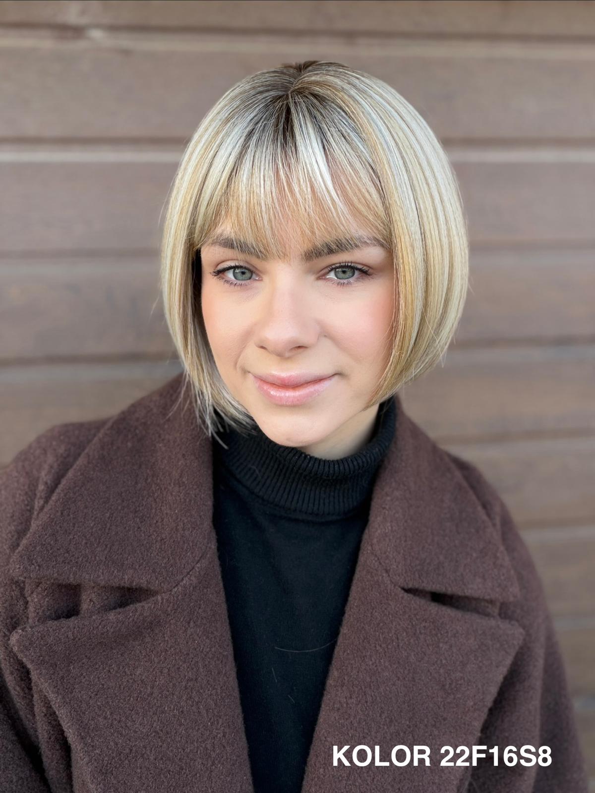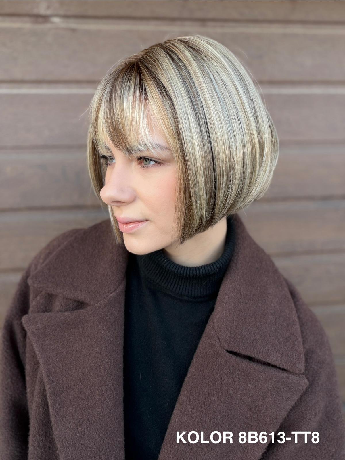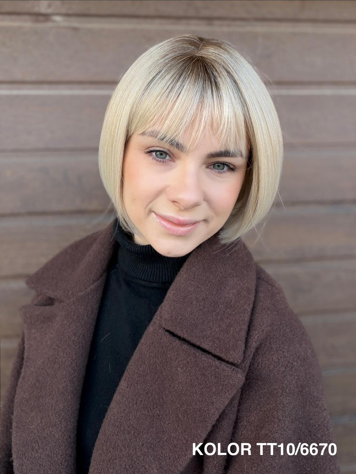 Peruka Gerda to klasyczna, krótka fryzura typu bob, która doskonale sprawdza się na co dzień. Prosta, czysta linia cięcia pięknie układa się przy twarzy i daje bardzo naturalny, spokojny efekt. To peruka, po którą sięga się bez zastanowienia — do pracy, na spotkanie, do codziennych obowiązków — zawsze wtedy, gdy chcesz wyglądać elegancko i czuć się komfortowo przez cały dzień.