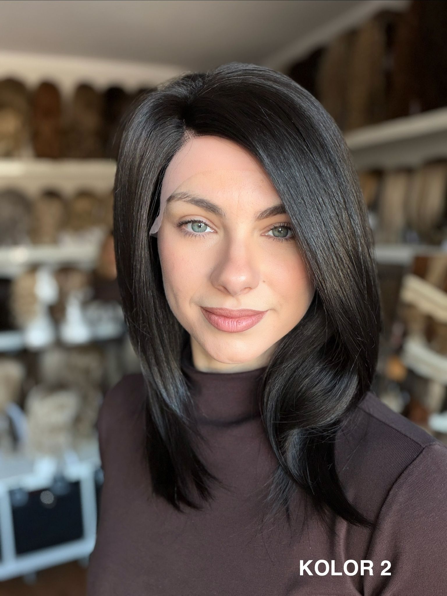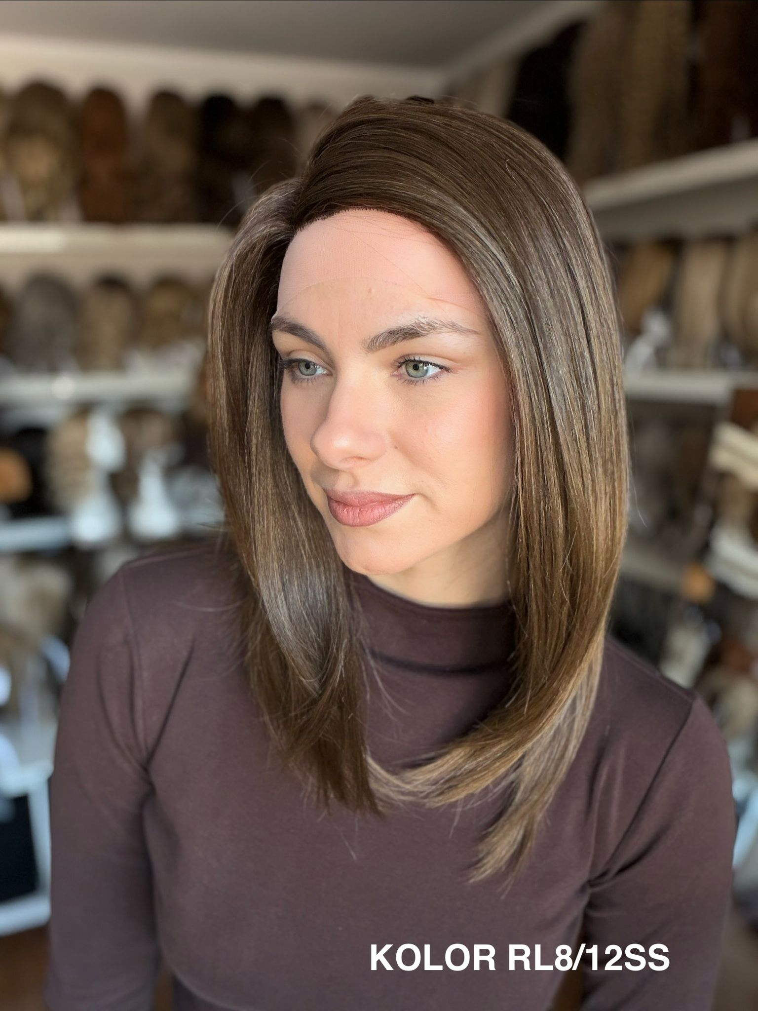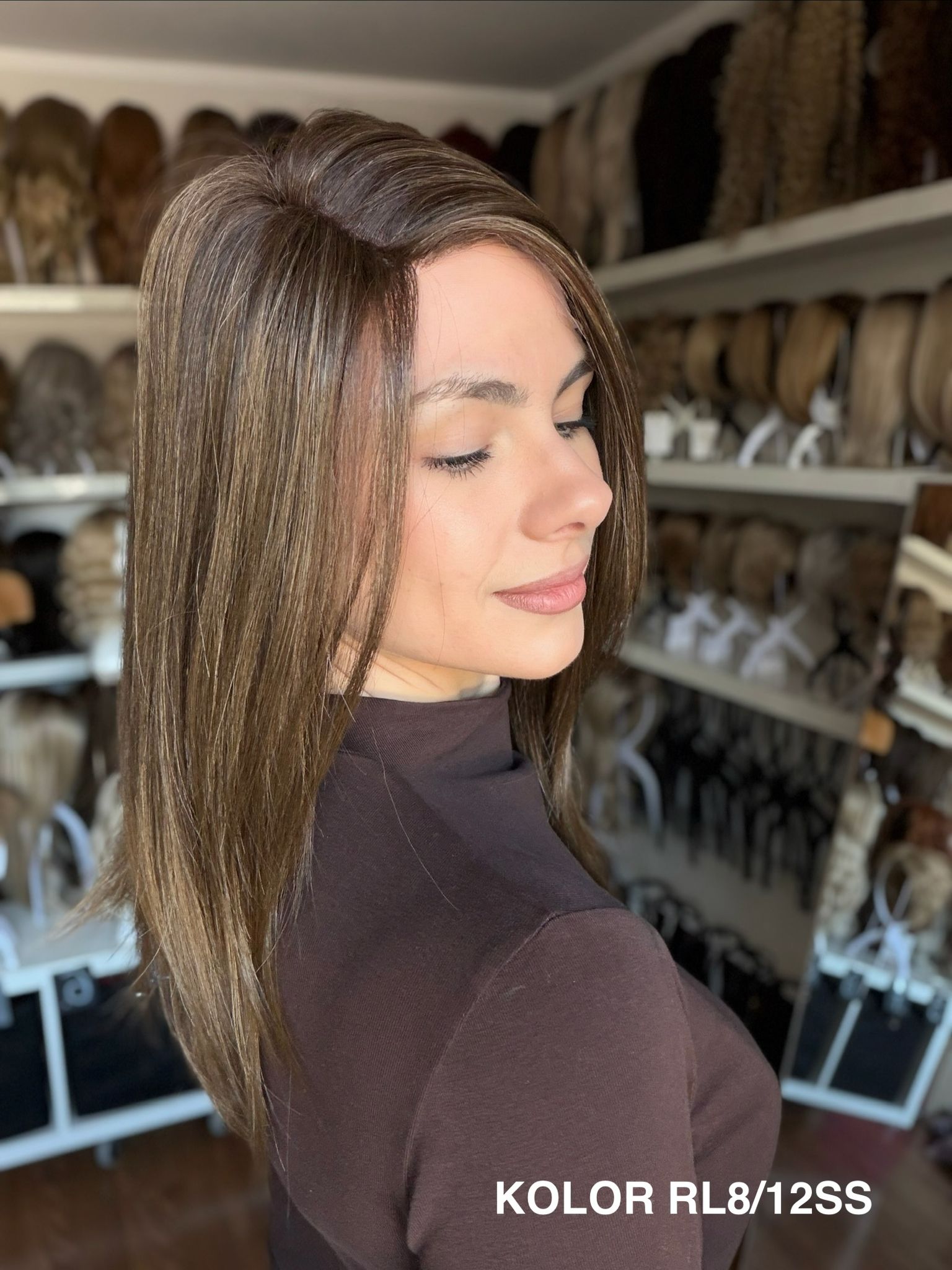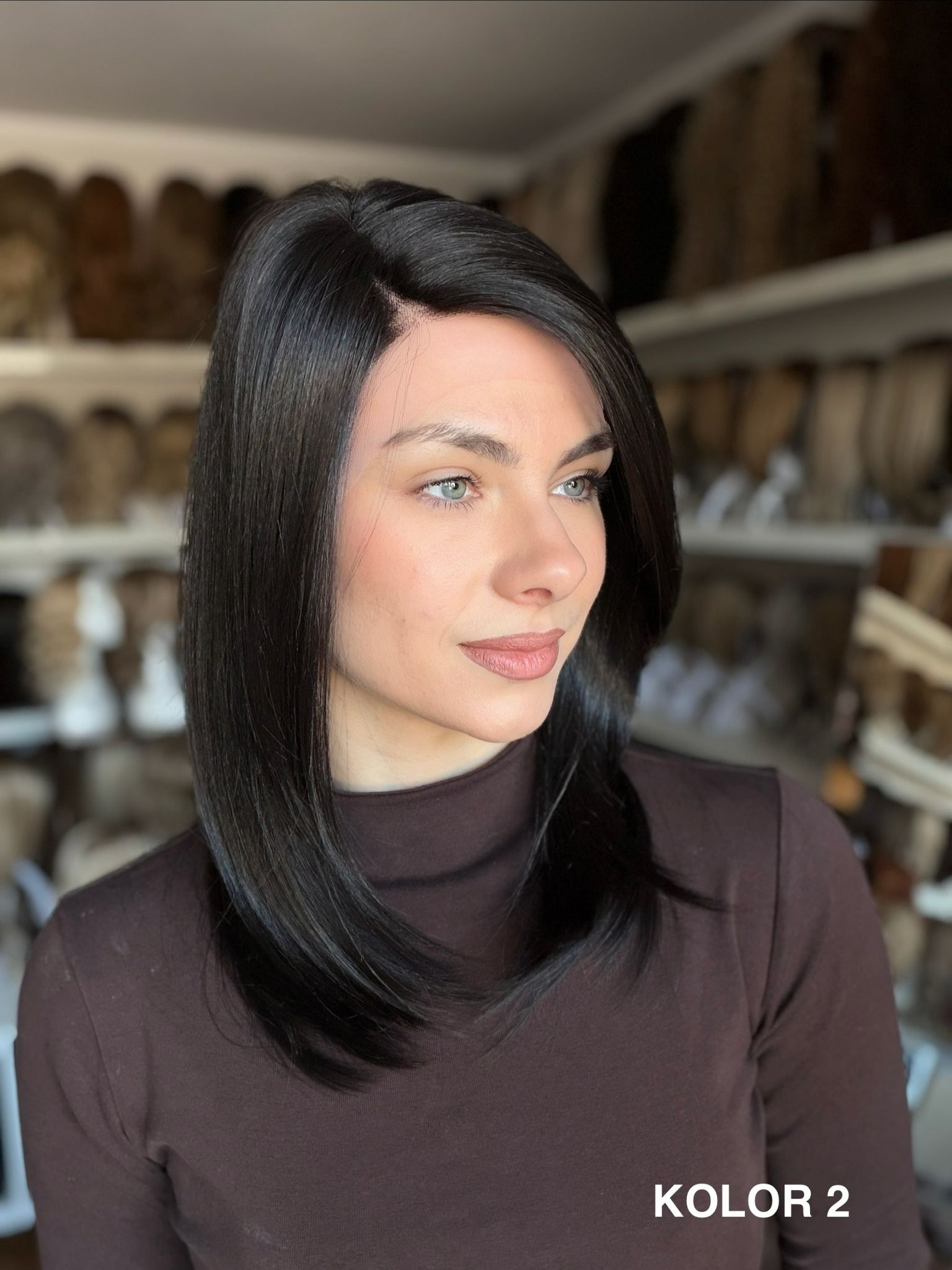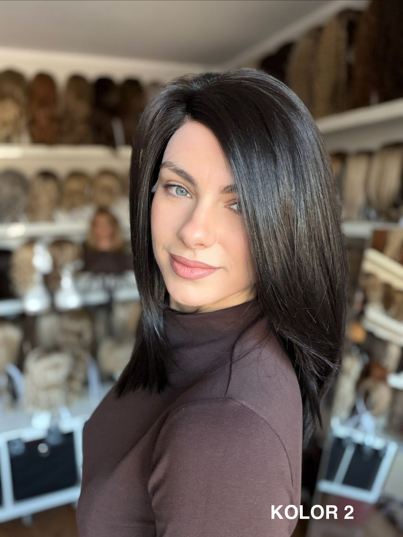 Peruka Nadia to klasyczna propozycja dla kobiet ceniących prostą, dopracowaną elegancję bez zbędnych ozdobników. Gładkie, proste włosy układają się naturalnie, a przedziałek po lewej stronie nadaje fryzurze harmonii i subtelnie wysmukla rysy twarzy. Choć przedziałek nie podlega zmianie, konstrukcja czepka pozwala na delikatne uniesienie włosów zarówno przy linii brzegowej czoła, jak i w miejscu przedziałka, co dodaje fryzurze lekkości i zapobiega efektowi nadmiernego przylegania do głowy. To model ponadczasowy – idealny do pracy, na co dzień, ale też jako eleganckie uzupełnienie bardziej formalnych stylizacji.