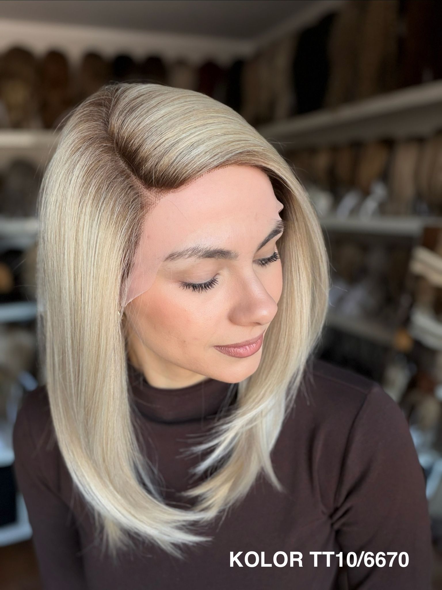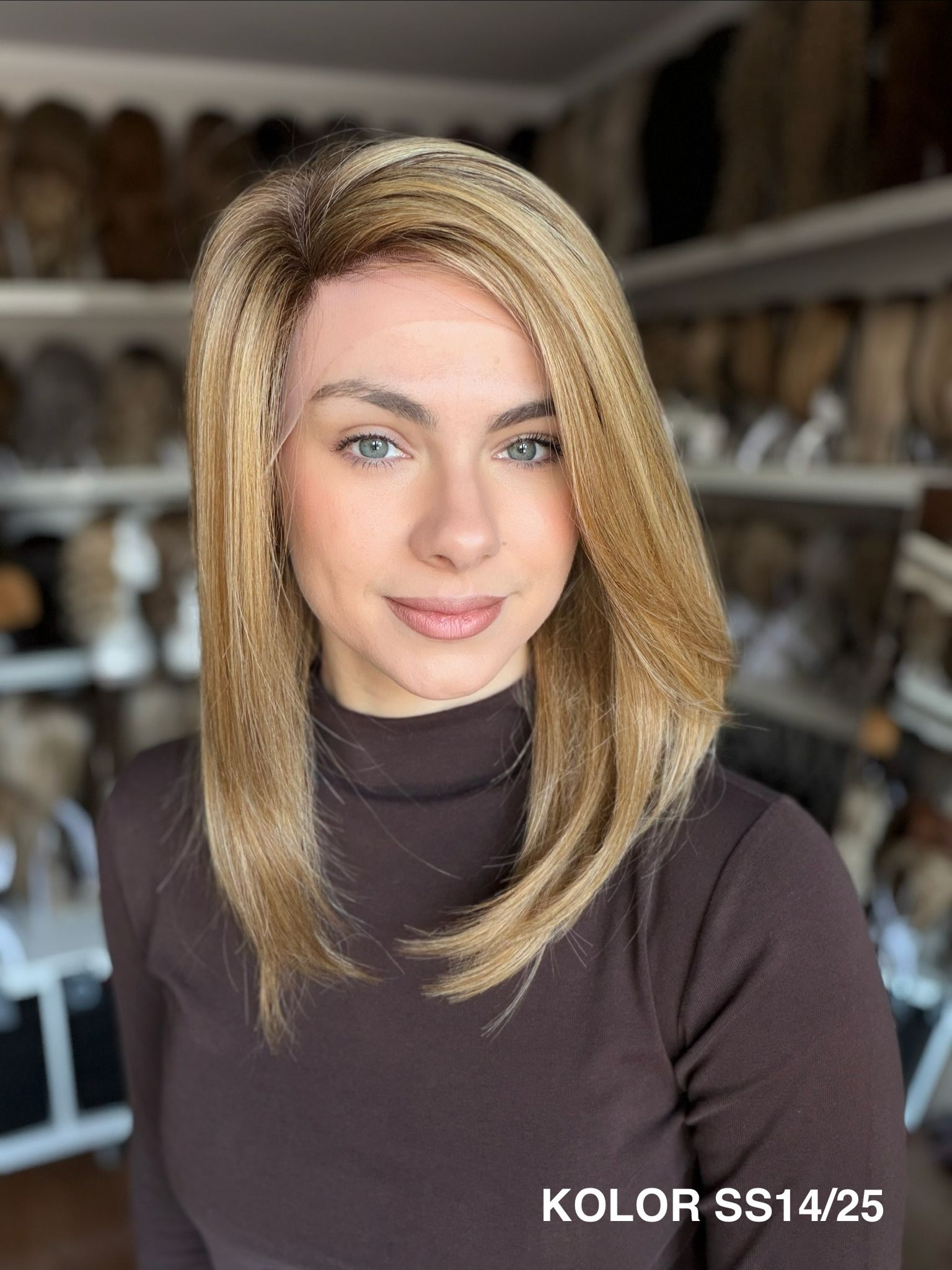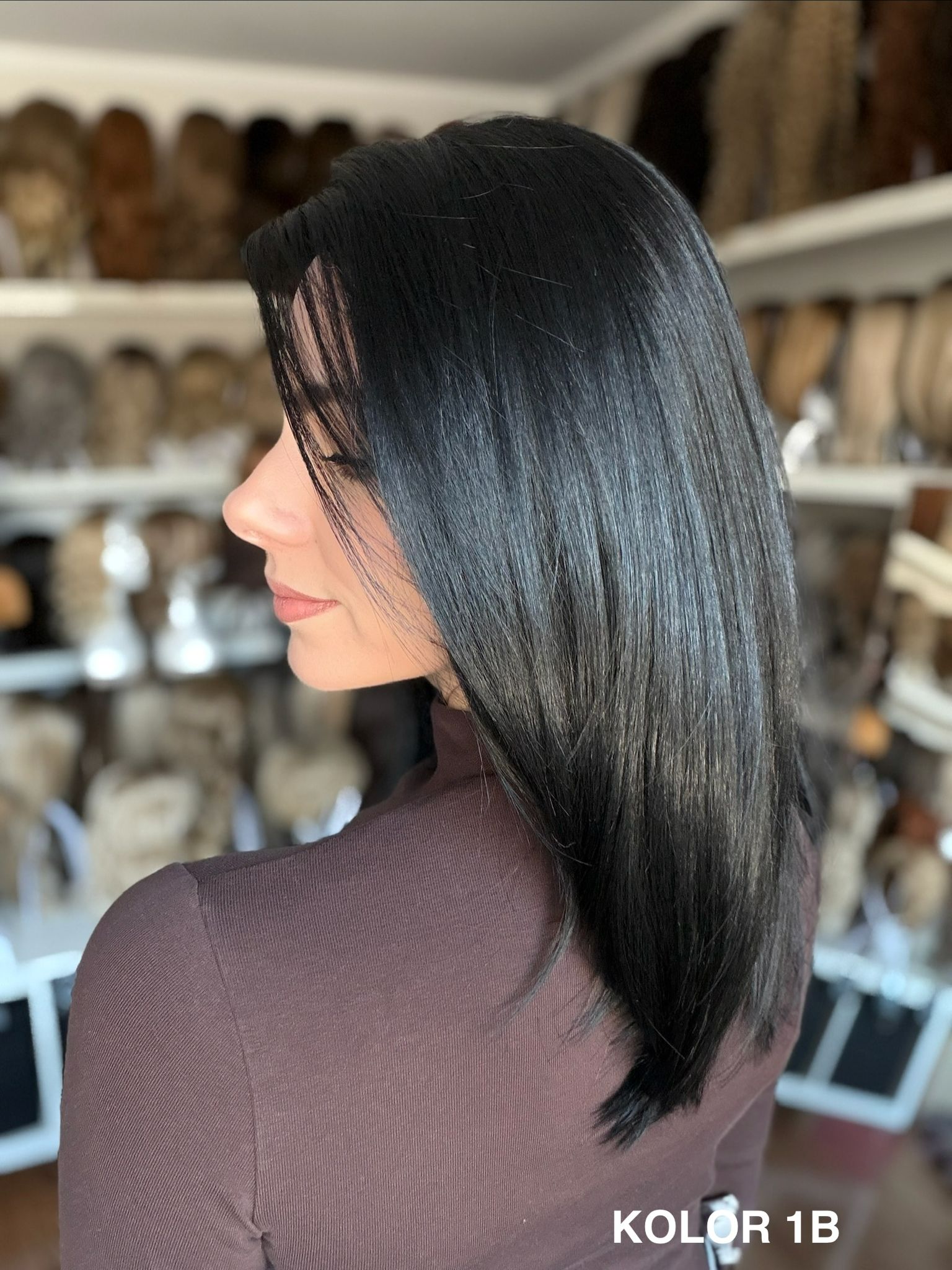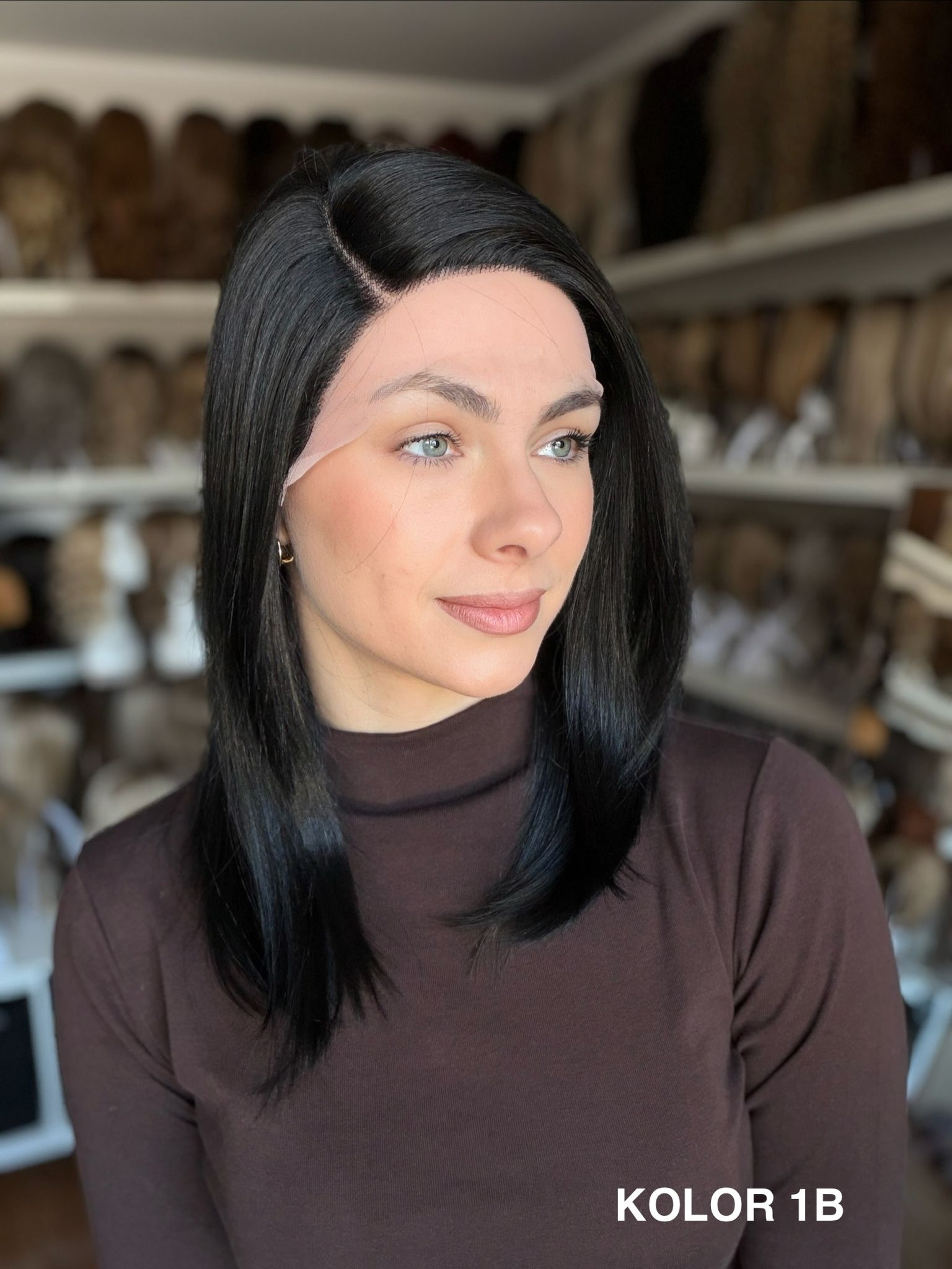 Peruka Nadia to klasyczna propozycja dla kobiet ceniących prostą, dopracowaną elegancję bez zbędnych ozdobników. Gładkie, proste włosy układają się naturalnie, a przedziałek po lewej stronie nadaje fryzurze harmonii i subtelnie wysmukla rysy twarzy. Choć przedziałek nie podlega zmianie, konstrukcja czepka pozwala na delikatne uniesienie włosów zarówno przy linii brzegowej czoła, jak i w miejscu przedziałka, co dodaje fryzurze lekkości i zapobiega efektowi nadmiernego przylegania do głowy. To model ponadczasowy – idealny do pracy, na co dzień, ale też jako eleganckie uzupełnienie bardziej formalnych stylizacji.