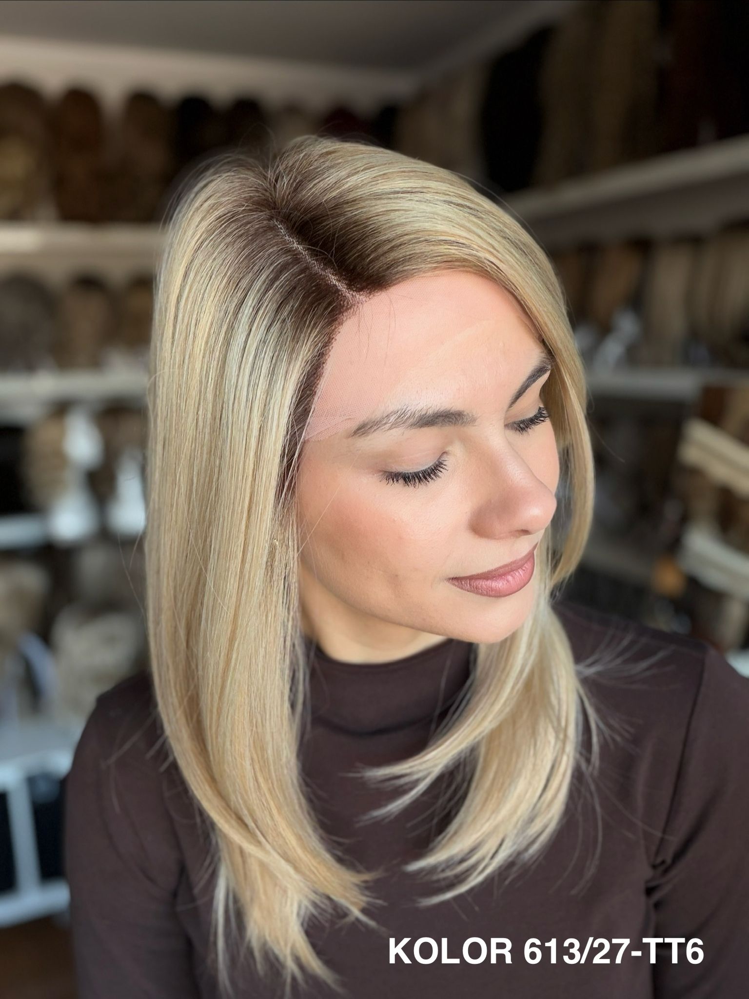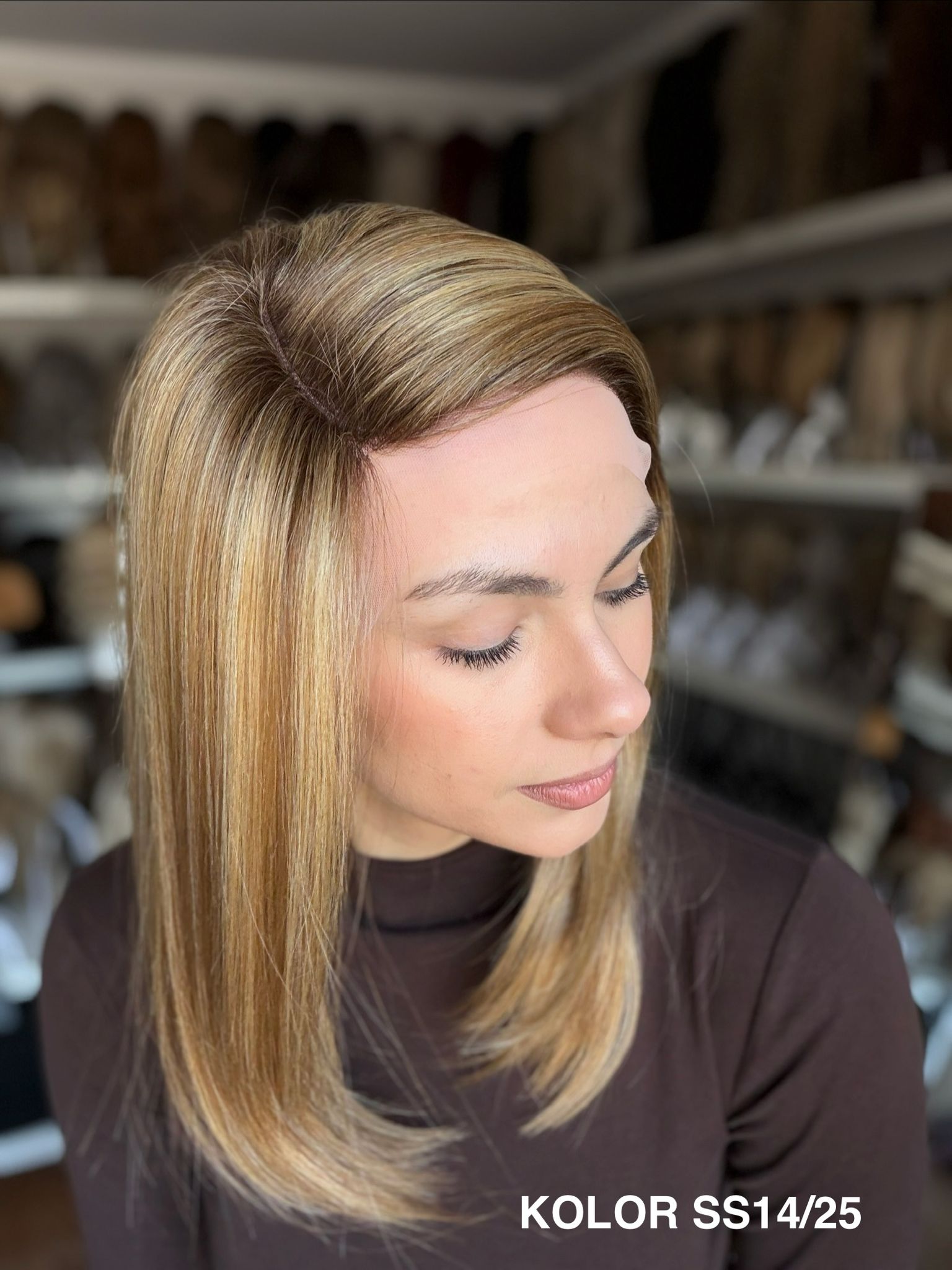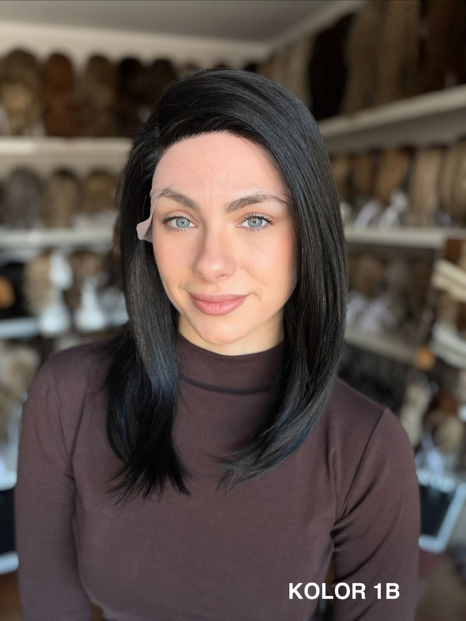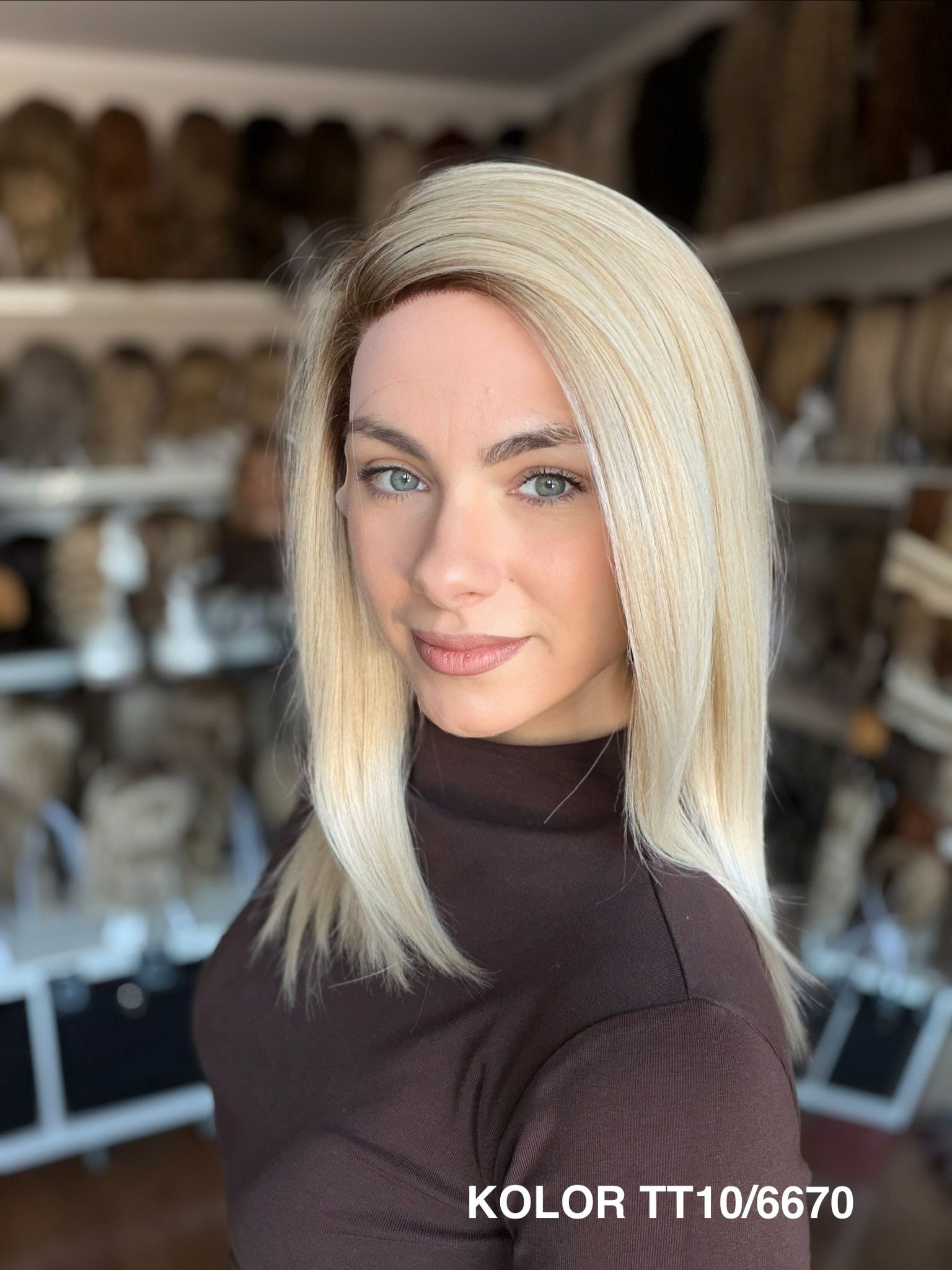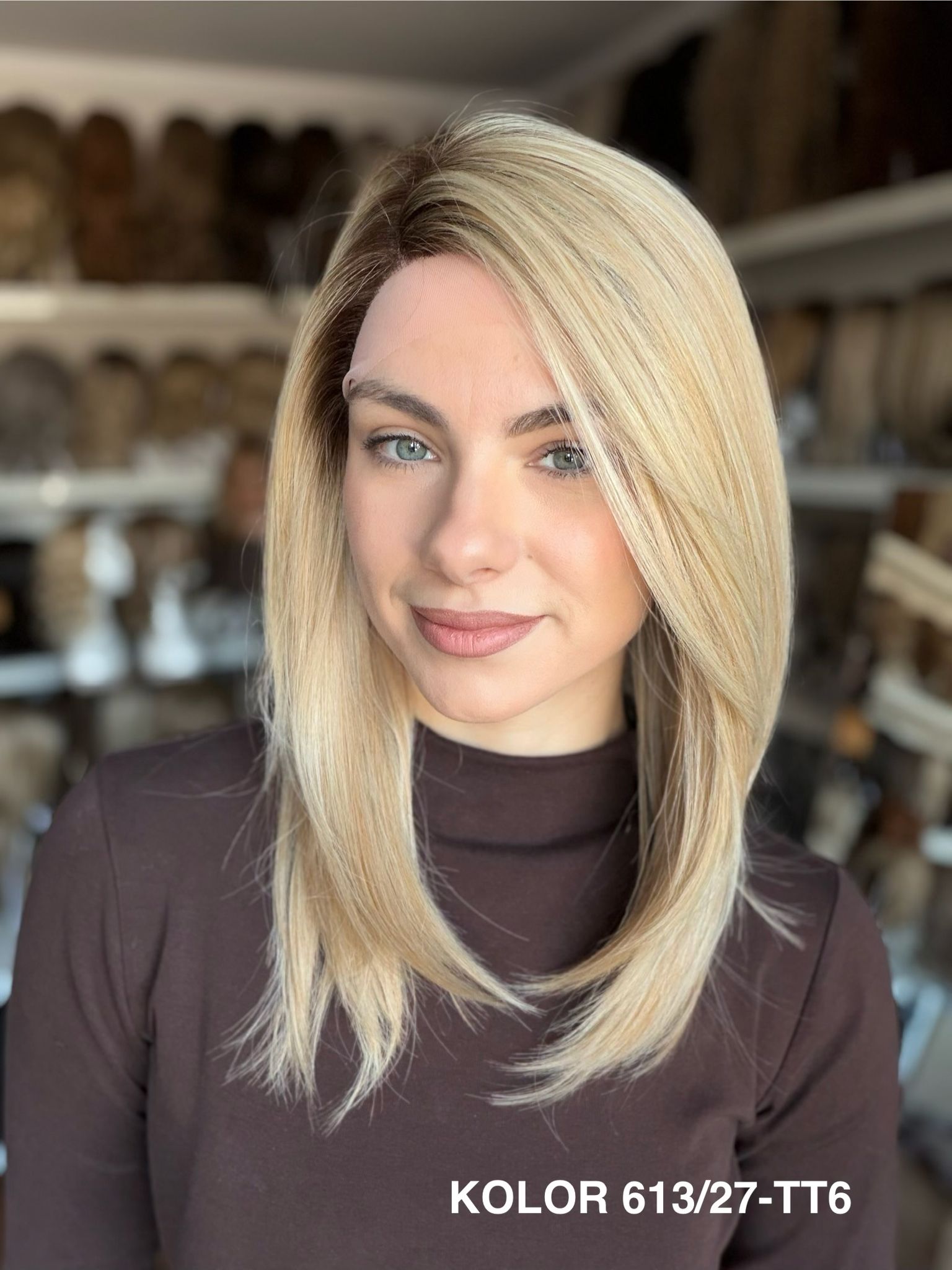 Peruka Nadia to klasyczna propozycja dla kobiet ceniących prostą, dopracowaną elegancję bez zbędnych ozdobników. Gładkie, proste włosy układają się naturalnie, a przedziałek po lewej stronie nadaje fryzurze harmonii i subtelnie wysmukla rysy twarzy. Choć przedziałek nie podlega zmianie, konstrukcja czepka pozwala na delikatne uniesienie włosów zarówno przy linii brzegowej czoła, jak i w miejscu przedziałka, co dodaje fryzurze lekkości i zapobiega efektowi nadmiernego przylegania do głowy. To model ponadczasowy – idealny do pracy, na co dzień, ale też jako eleganckie uzupełnienie bardziej formalnych stylizacji.