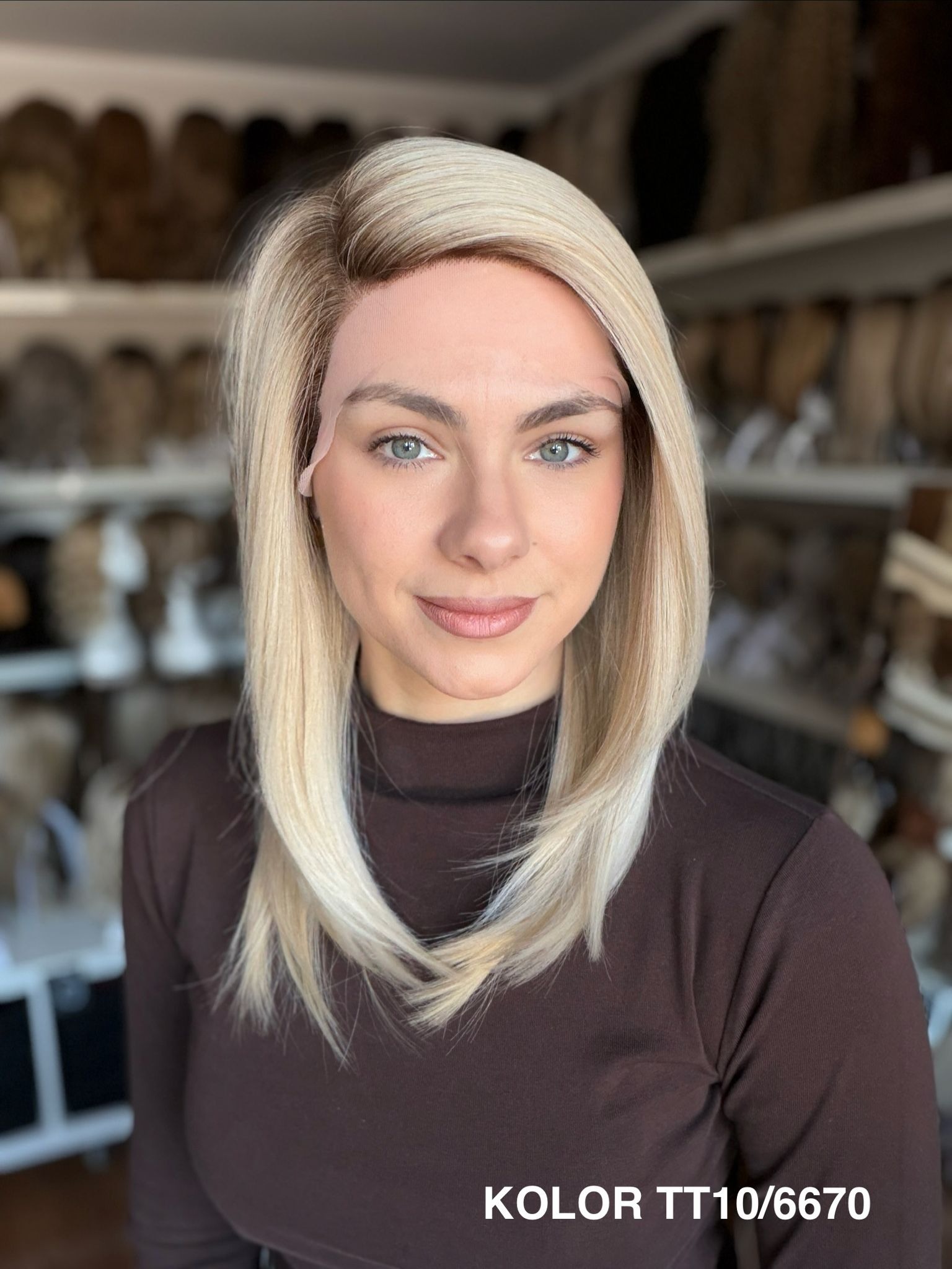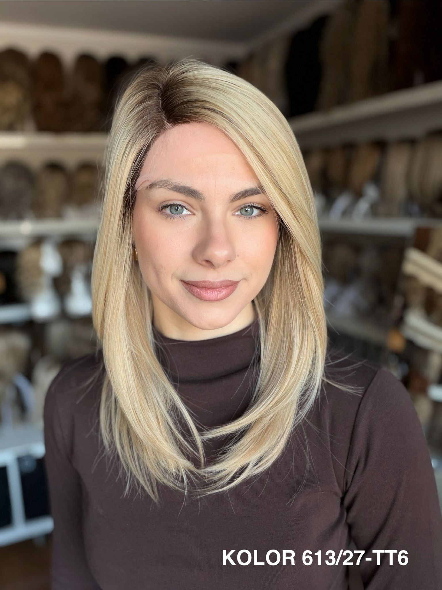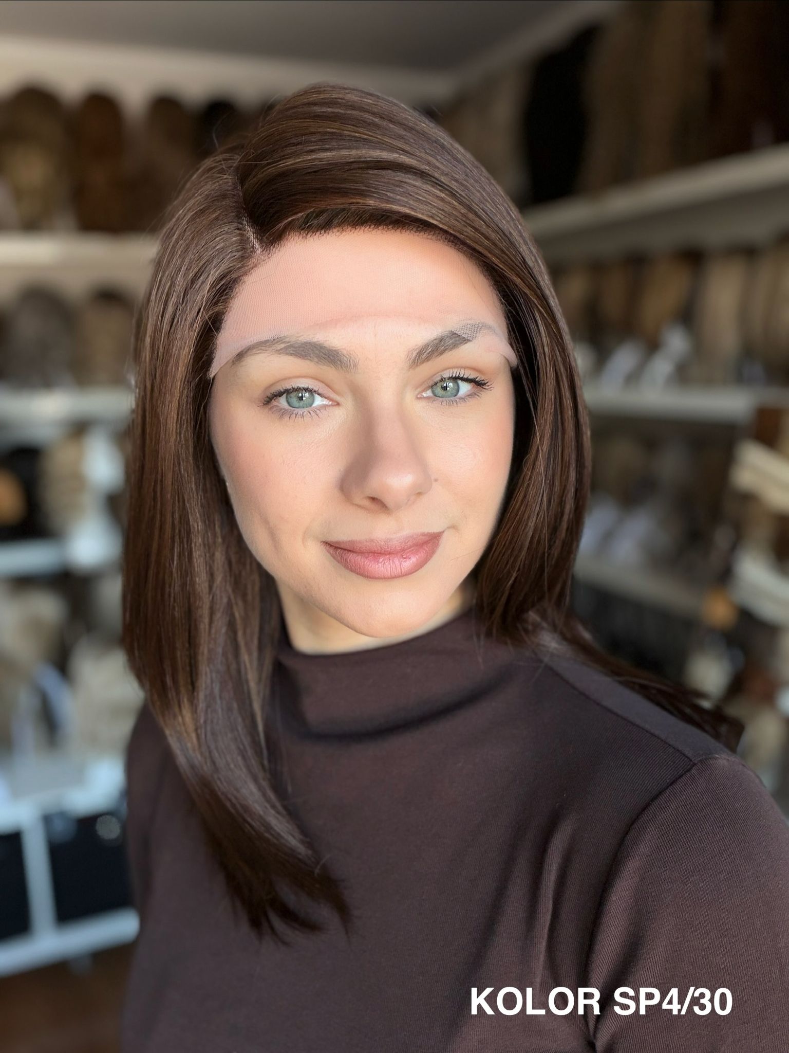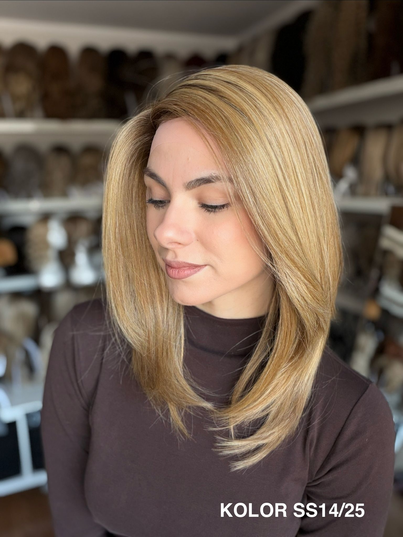 Peruka Nadia to klasyczna propozycja dla kobiet ceniących prostą, dopracowaną elegancję bez zbędnych ozdobników. Gładkie, proste włosy układają się naturalnie, a przedziałek po lewej stronie nadaje fryzurze harmonii i subtelnie wysmukla rysy twarzy. Choć przedziałek nie podlega zmianie, konstrukcja czepka pozwala na delikatne uniesienie włosów zarówno przy linii brzegowej czoła, jak i w miejscu przedziałka, co dodaje fryzurze lekkości i zapobiega efektowi nadmiernego przylegania do głowy. To model ponadczasowy – idealny do pracy, na co dzień, ale też jako eleganckie uzupełnienie bardziej formalnych stylizacji.
