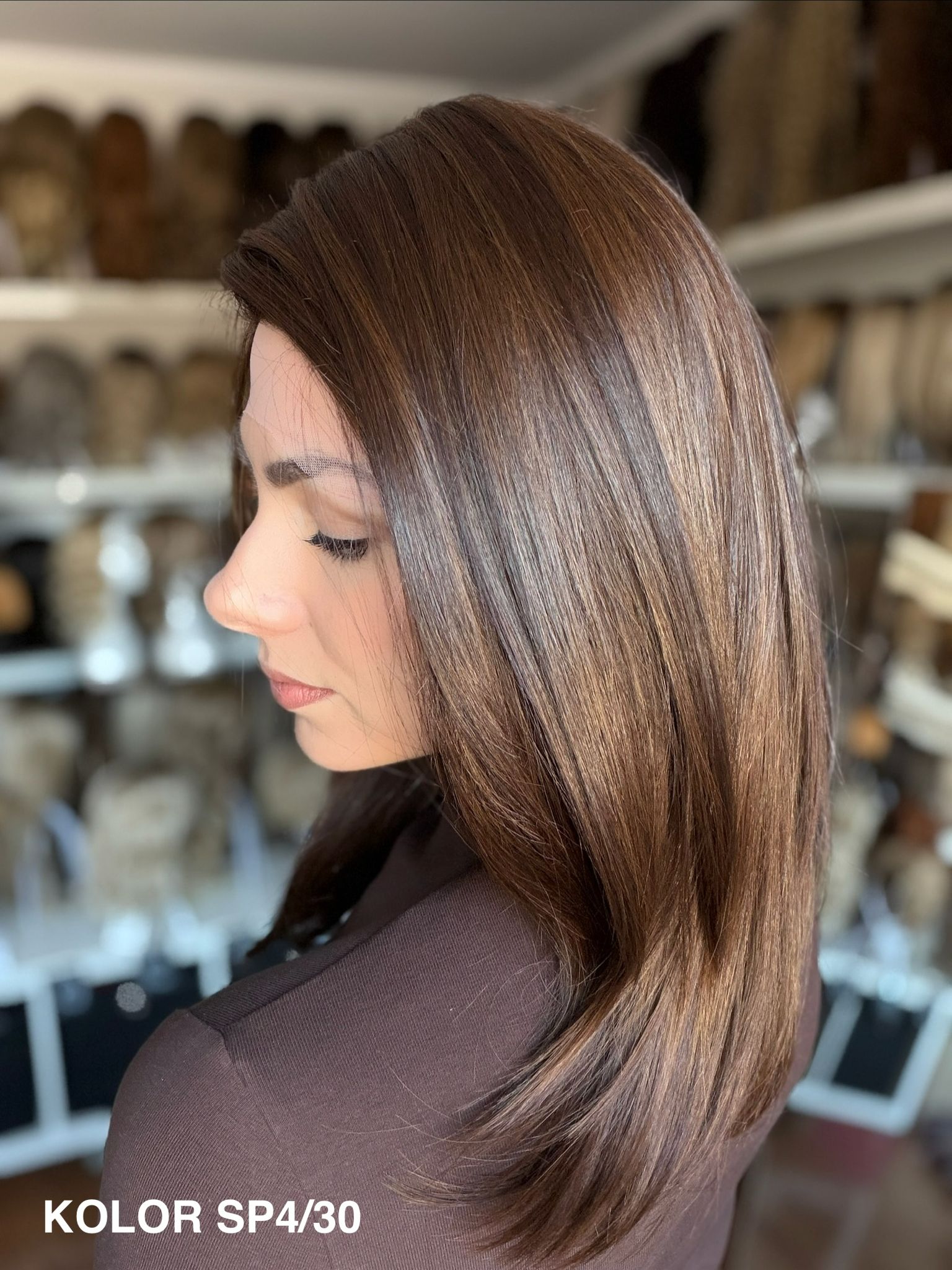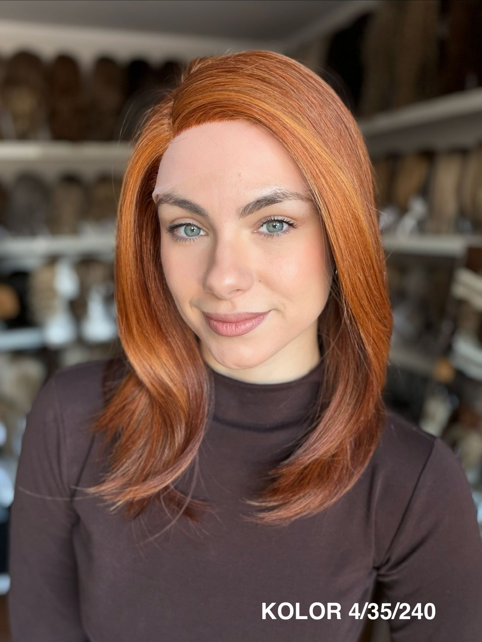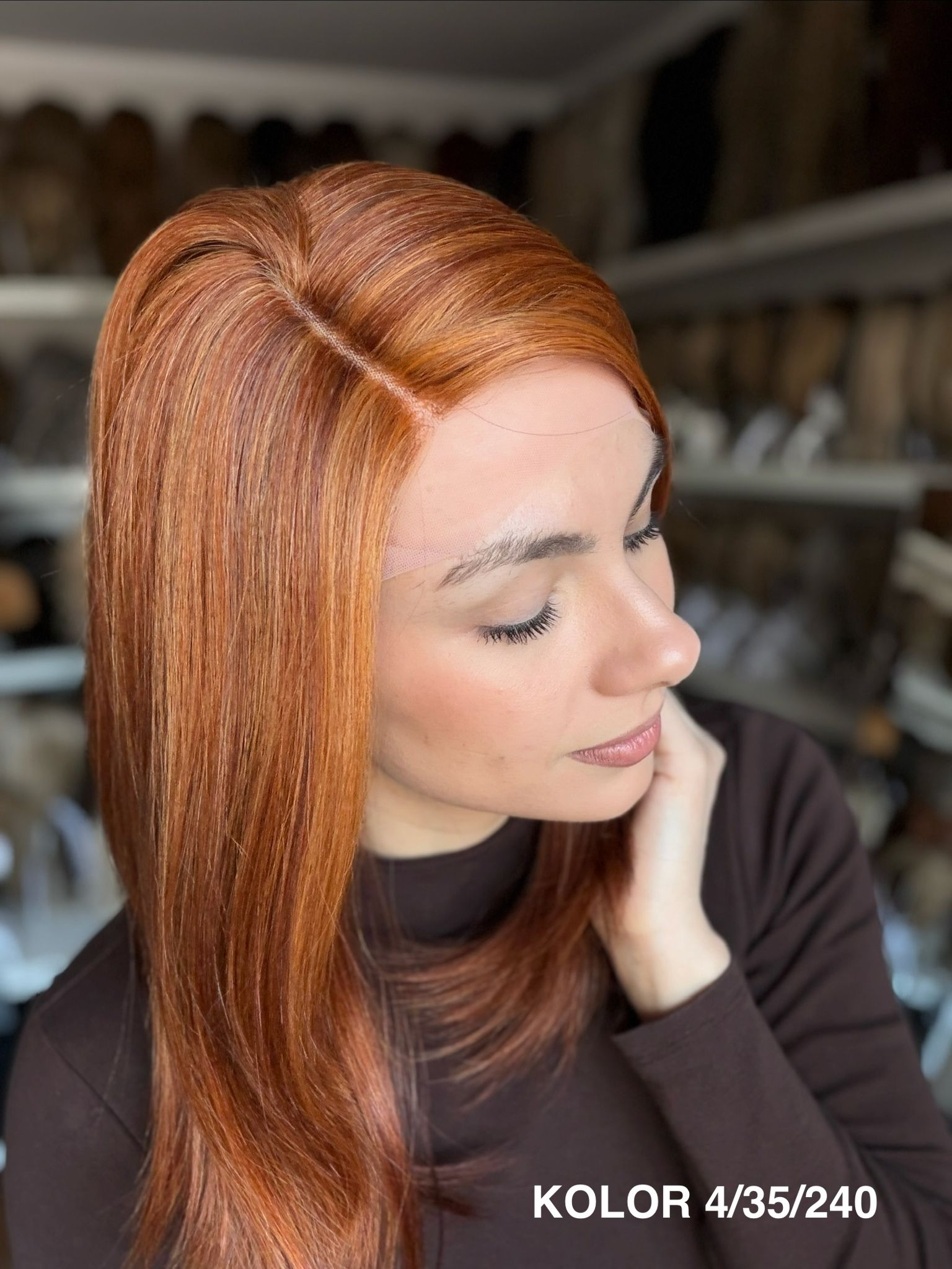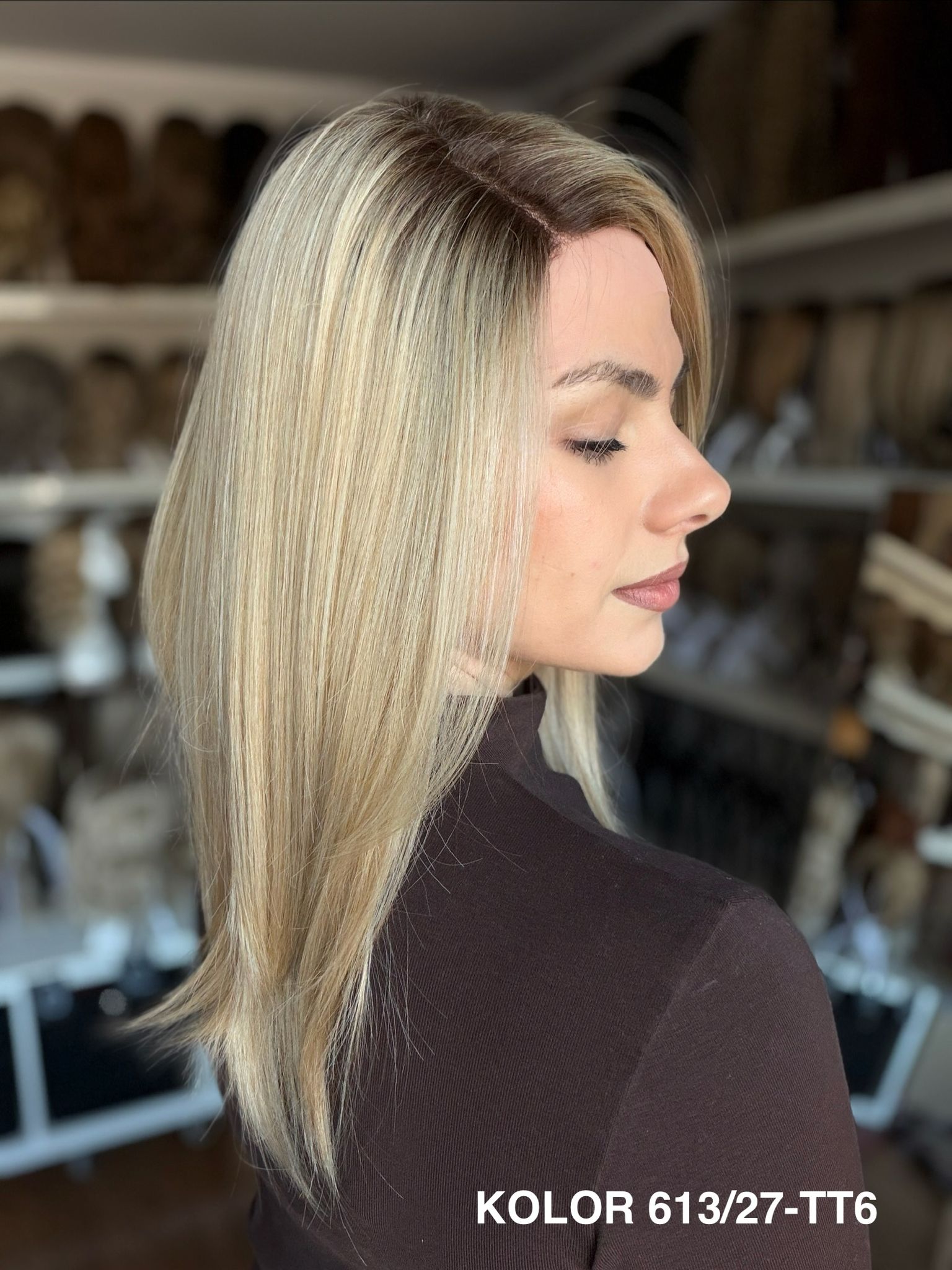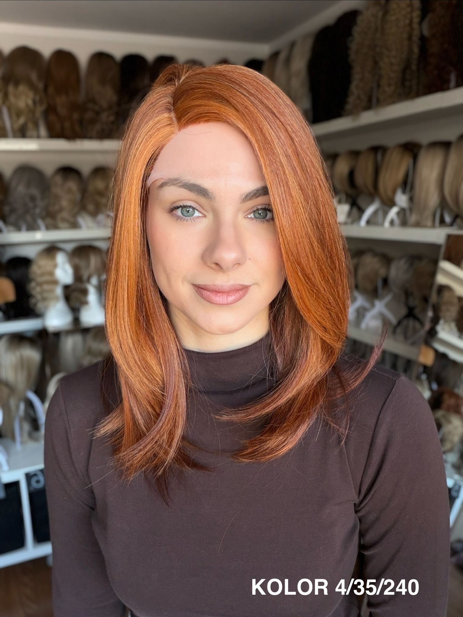 Peruka Nadia to klasyczna propozycja dla kobiet ceniących prostą, dopracowaną elegancję bez zbędnych ozdobników. Gładkie, proste włosy układają się naturalnie, a przedziałek po lewej stronie nadaje fryzurze harmonii i subtelnie wysmukla rysy twarzy. Choć przedziałek nie podlega zmianie, konstrukcja czepka pozwala na delikatne uniesienie włosów zarówno przy linii brzegowej czoła, jak i w miejscu przedziałka, co dodaje fryzurze lekkości i zapobiega efektowi nadmiernego przylegania do głowy. To model ponadczasowy – idealny do pracy, na co dzień, ale też jako eleganckie uzupełnienie bardziej formalnych stylizacji.