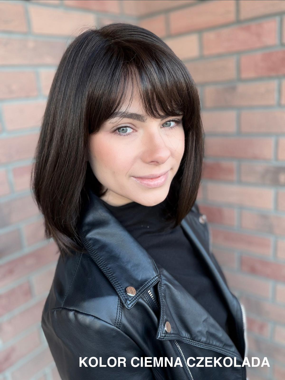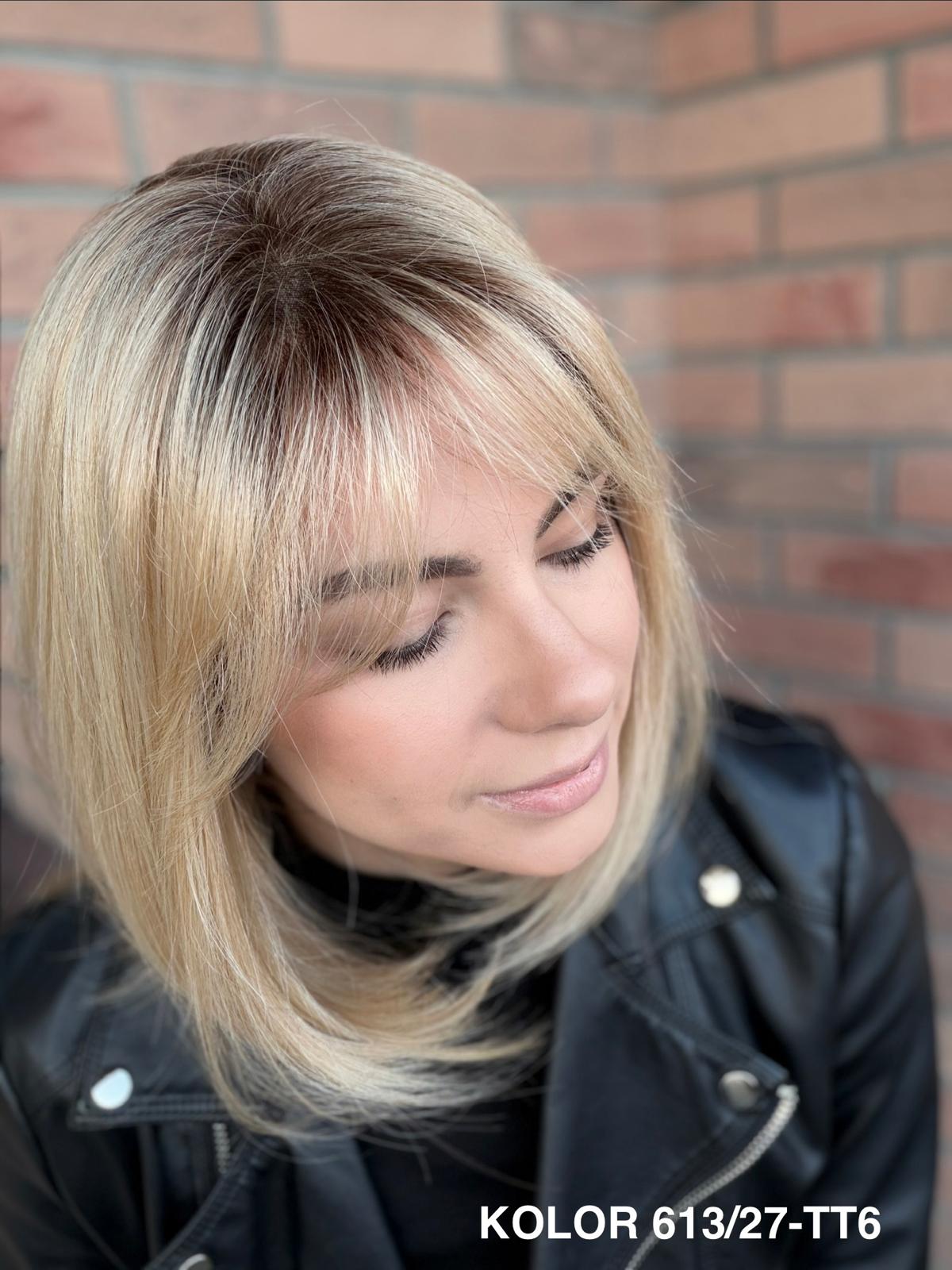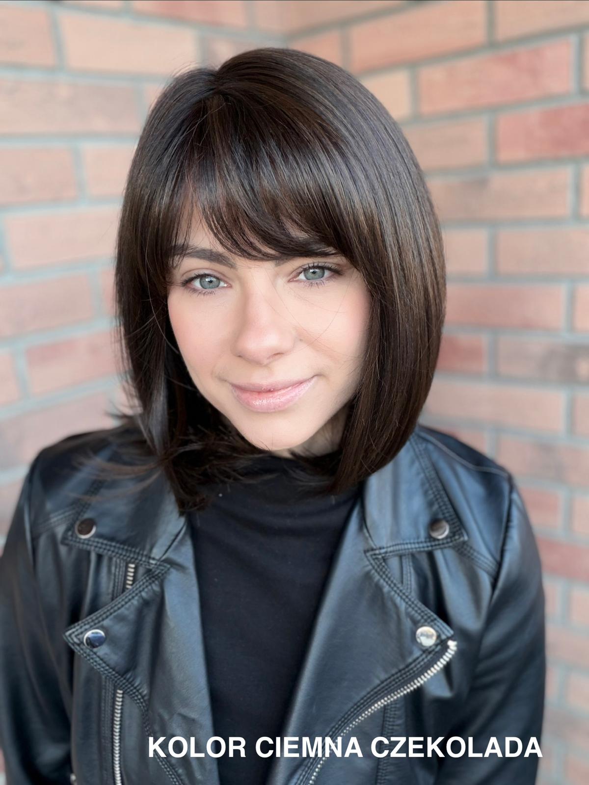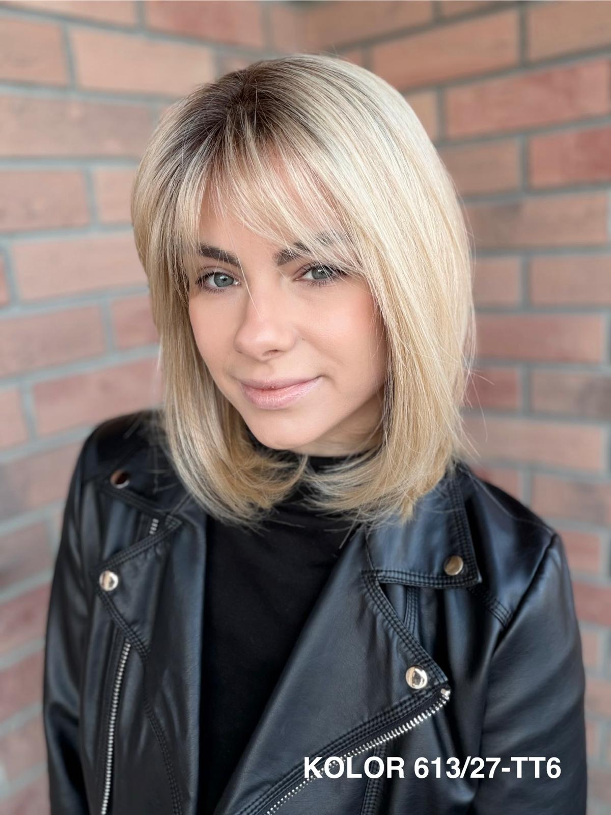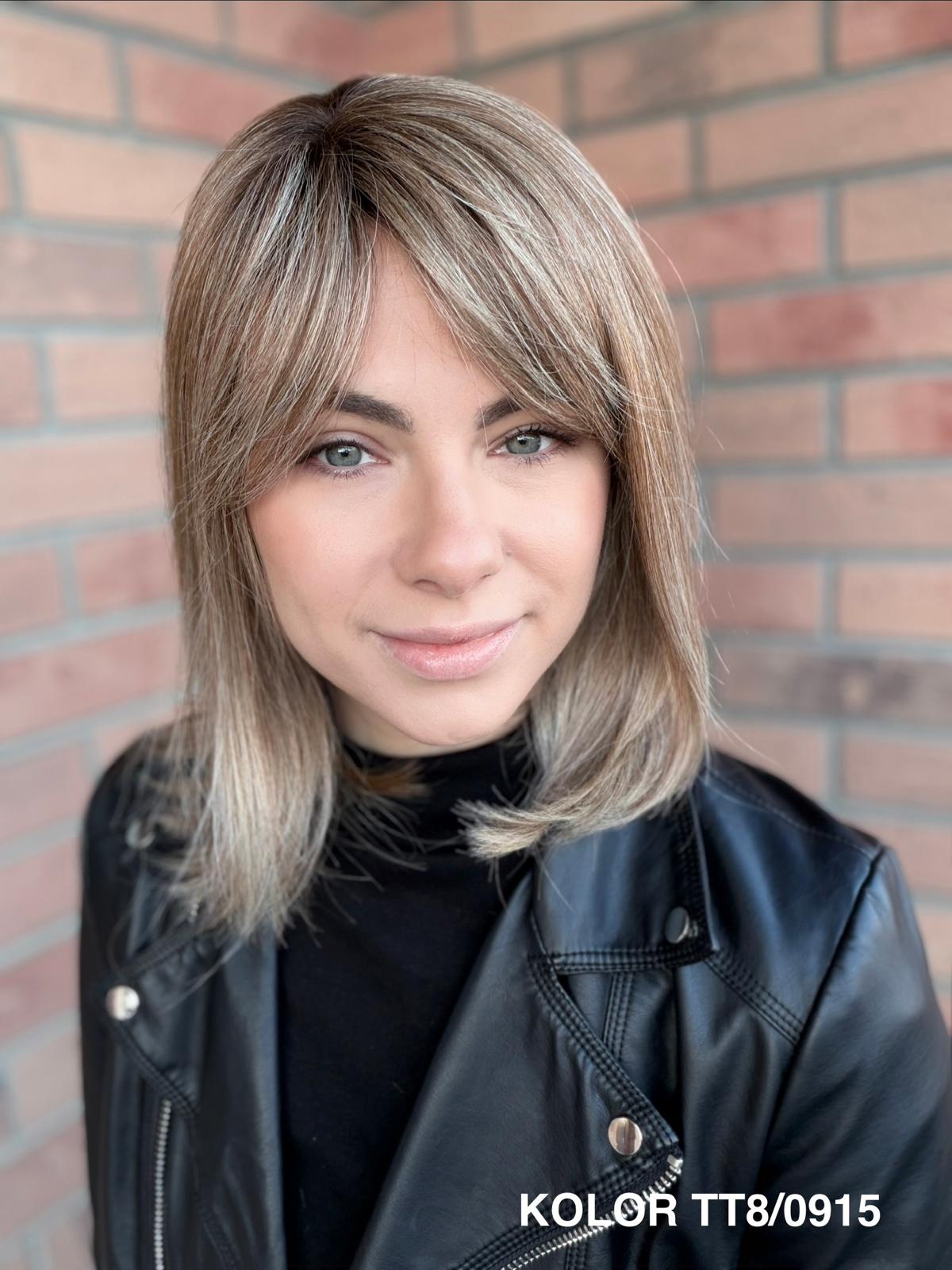 Serena to ponadczasowy, elegancki long bob z grzywką, który daje ogromną swobodę stylizacji i zawsze wygląda naturalnie. Dzięki czepkowi z wysokiej jakości mono top (mikroskóra) grzywkę oraz przedziałek można przekładać w dowolnym kierunku – nosić na prosto, na bok lub delikatnie unieść włosy u nasady, dokładnie tak, jak po profesjonalnej stylizacji. Linia brzegowa czoła jest pięknie rozmyta, subtelna i bardzo realistyczna, co sprawia, że odsłonięcie twarzy wygląda niezwykle naturalnie. To fryzura klasyczna, a jednocześnie świeża – idealna zarówno na co dzień, do pracy, jak i na eleganckie wyjścia.