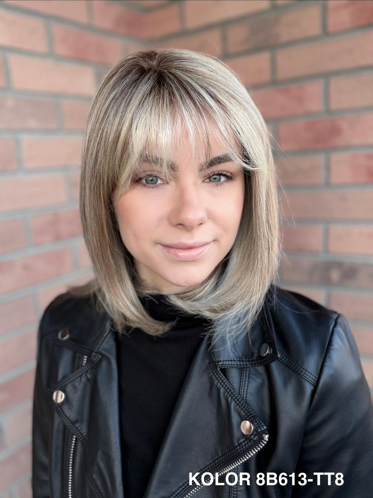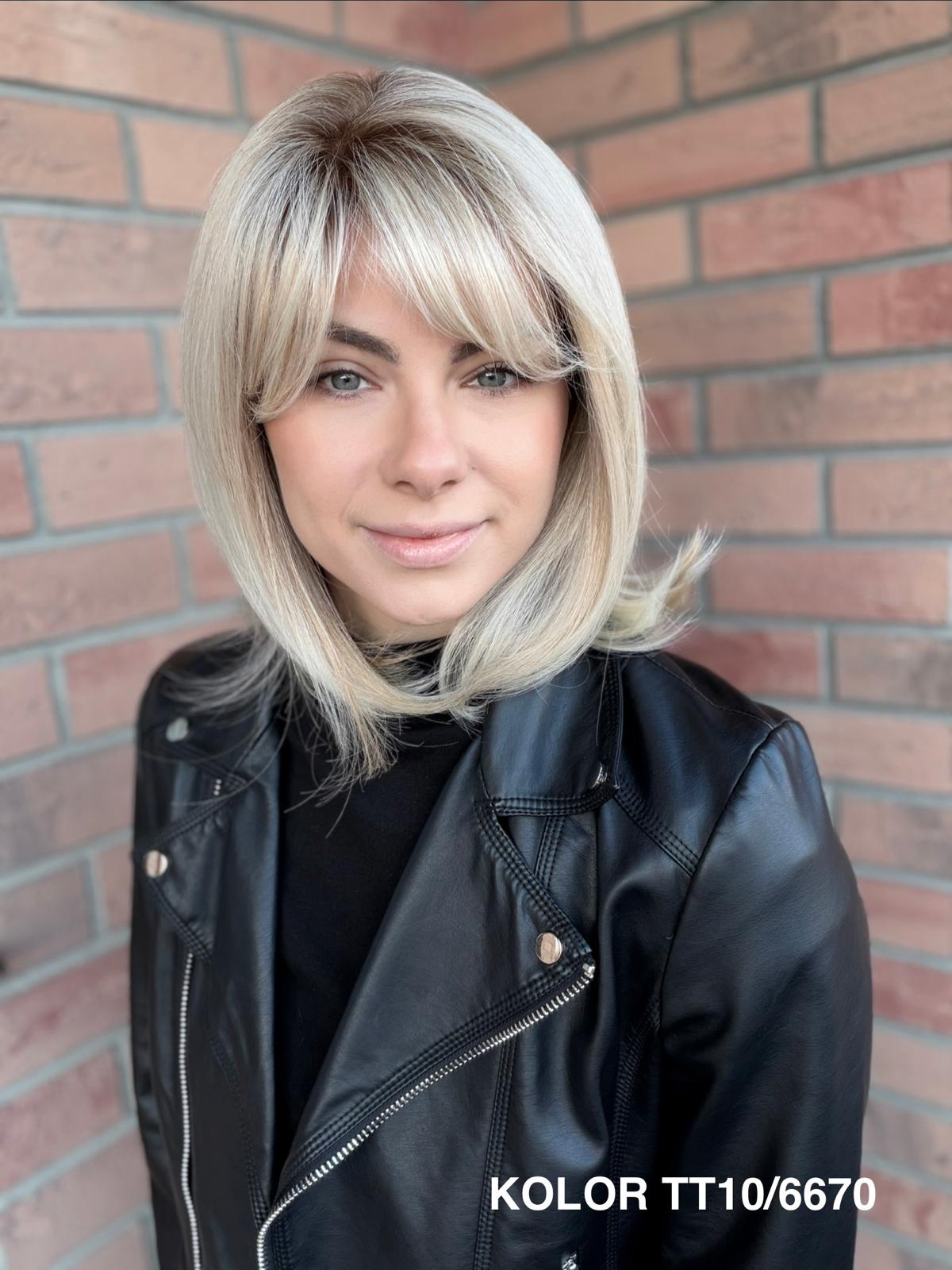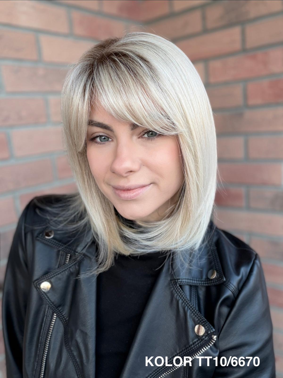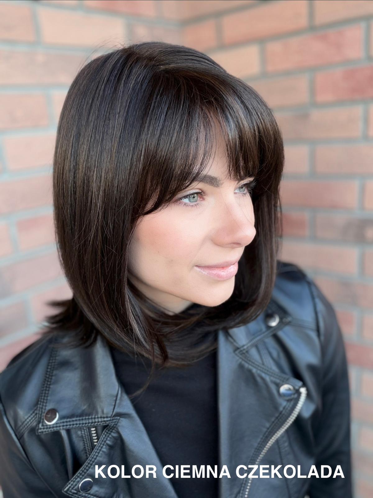Serena to ponadczasowy, elegancki long bob z grzywką, który daje ogromną swobodę stylizacji i zawsze wygląda naturalnie. Dzięki czepkowi z wysokiej jakości mono top (mikroskóra) grzywkę oraz przedziałek można przekładać w dowolnym kierunku – nosić na prosto, na bok lub delikatnie unieść włosy u nasady, dokładnie tak, jak po profesjonalnej stylizacji. Linia brzegowa czoła jest pięknie rozmyta, subtelna i bardzo realistyczna, co sprawia, że odsłonięcie twarzy wygląda niezwykle naturalnie. To fryzura klasyczna, a jednocześnie świeża – idealna zarówno na co dzień, do pracy, jak i na eleganckie wyjścia.