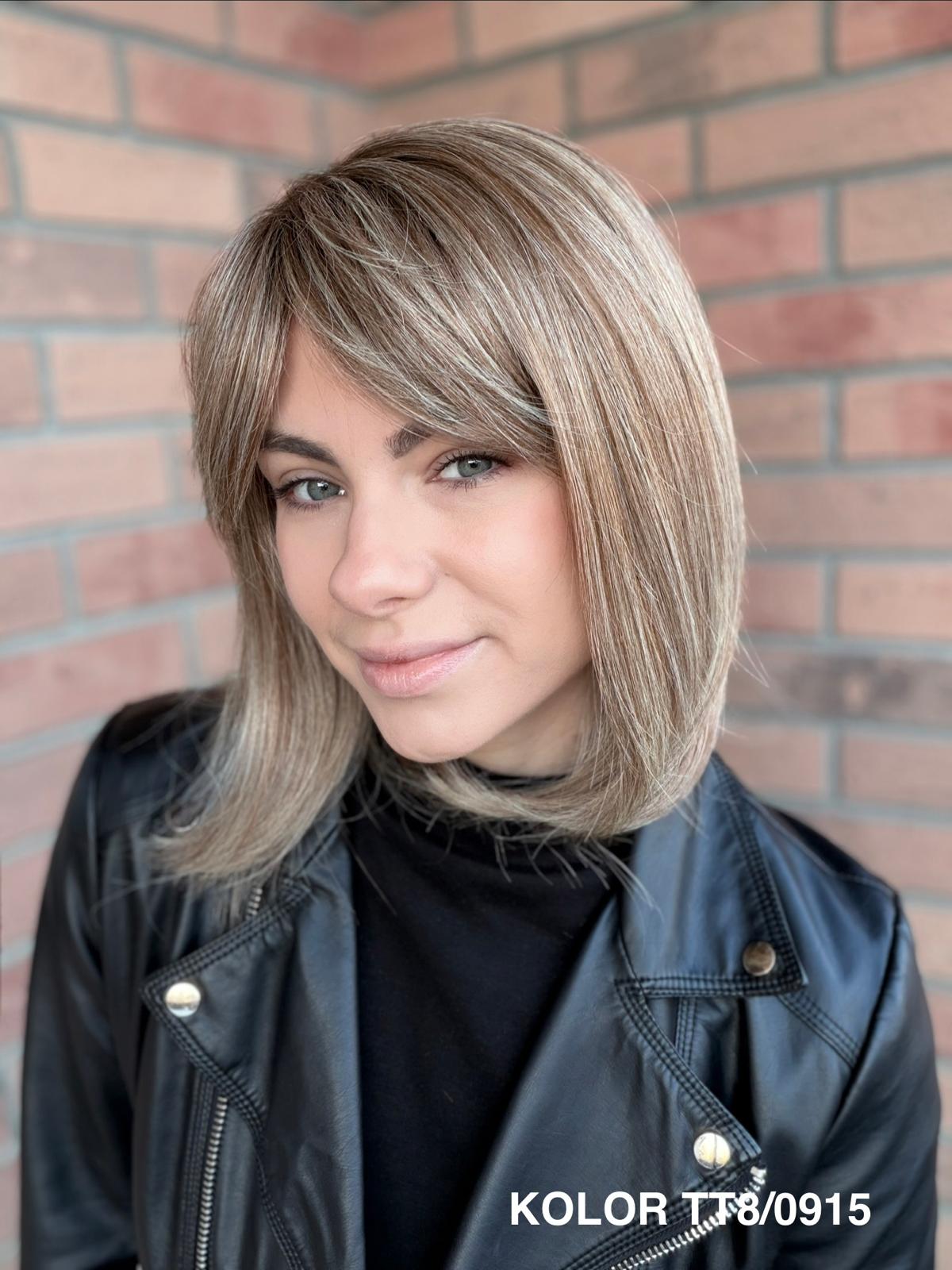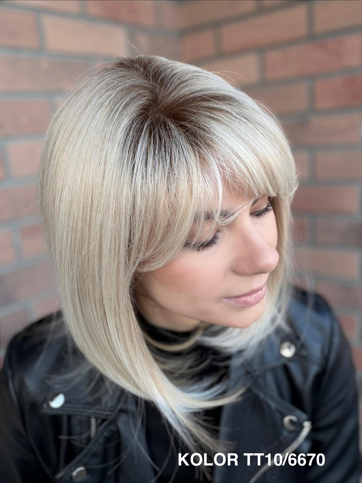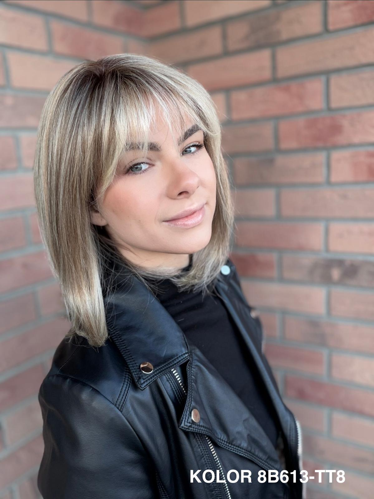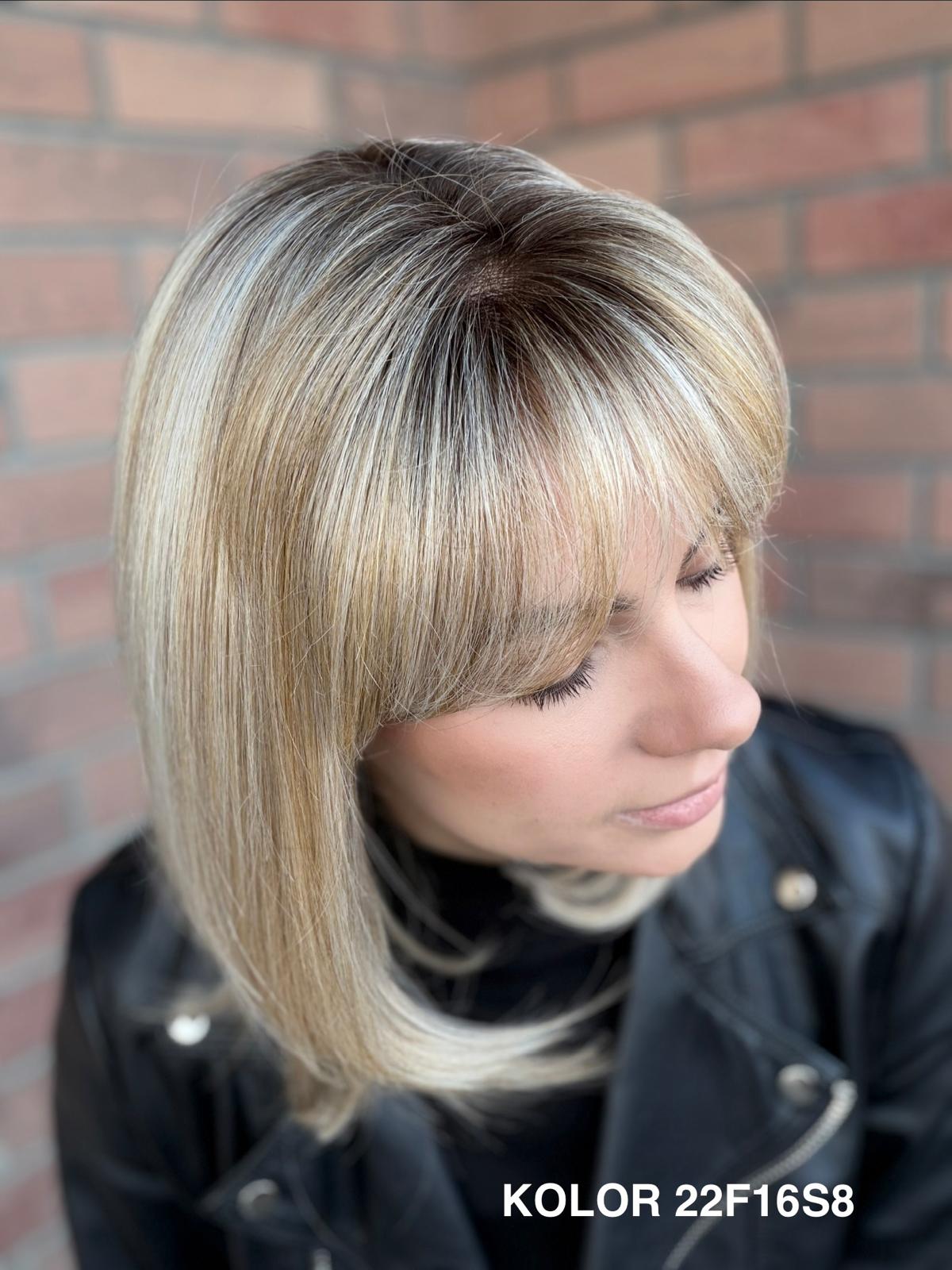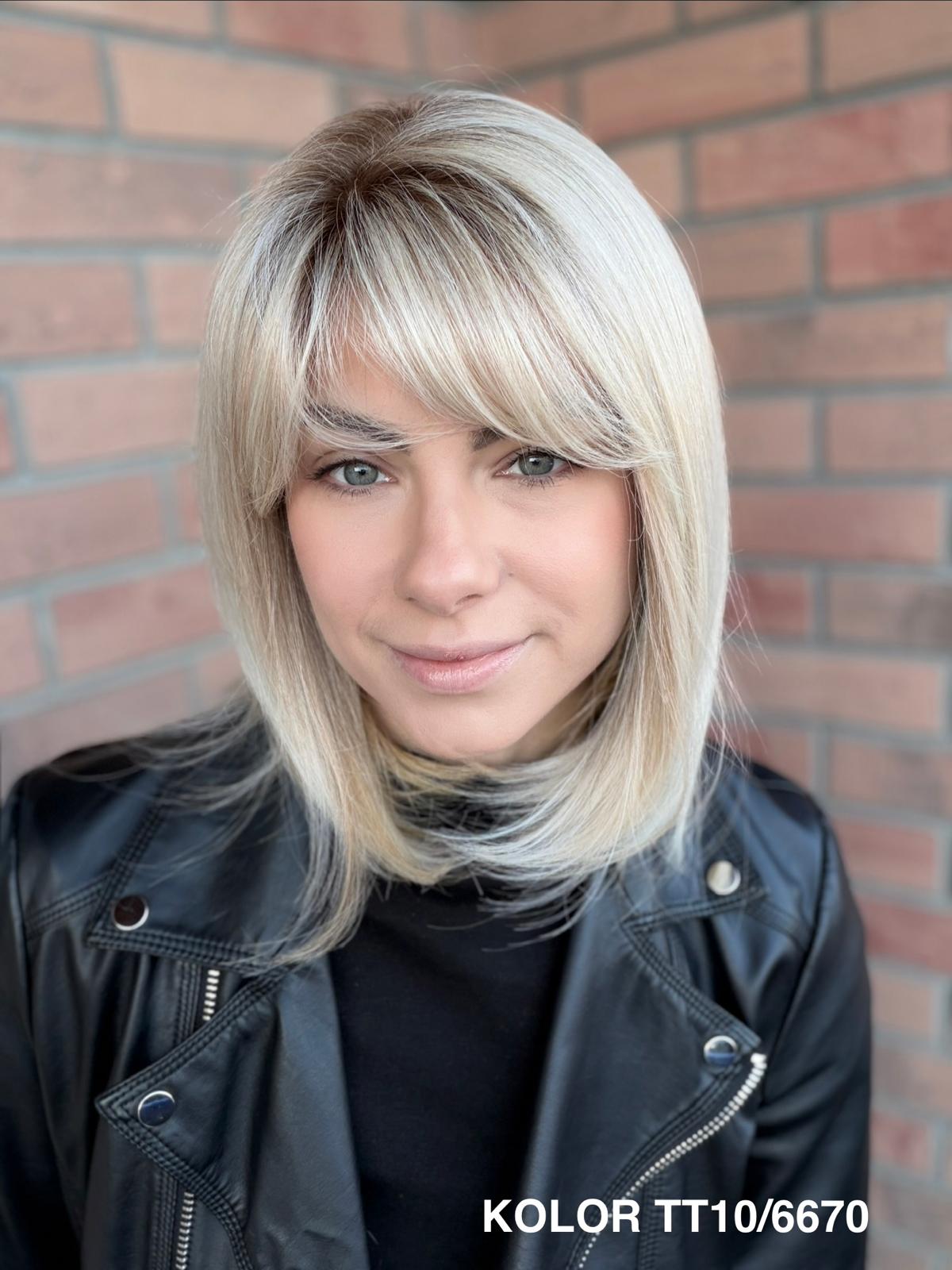Serena to ponadczasowy, elegancki long bob z grzywką, który daje ogromną swobodę stylizacji i zawsze wygląda naturalnie. Dzięki czepkowi z wysokiej jakości mono top (mikroskóra) grzywkę oraz przedziałek można przekładać w dowolnym kierunku – nosić na prosto, na bok lub delikatnie unieść włosy u nasady, dokładnie tak, jak po profesjonalnej stylizacji. Linia brzegowa czoła jest pięknie rozmyta, subtelna i bardzo realistyczna, co sprawia, że odsłonięcie twarzy wygląda niezwykle naturalnie. To fryzura klasyczna, a jednocześnie świeża – idealna zarówno na co dzień, do pracy, jak i na eleganckie wyjścia.