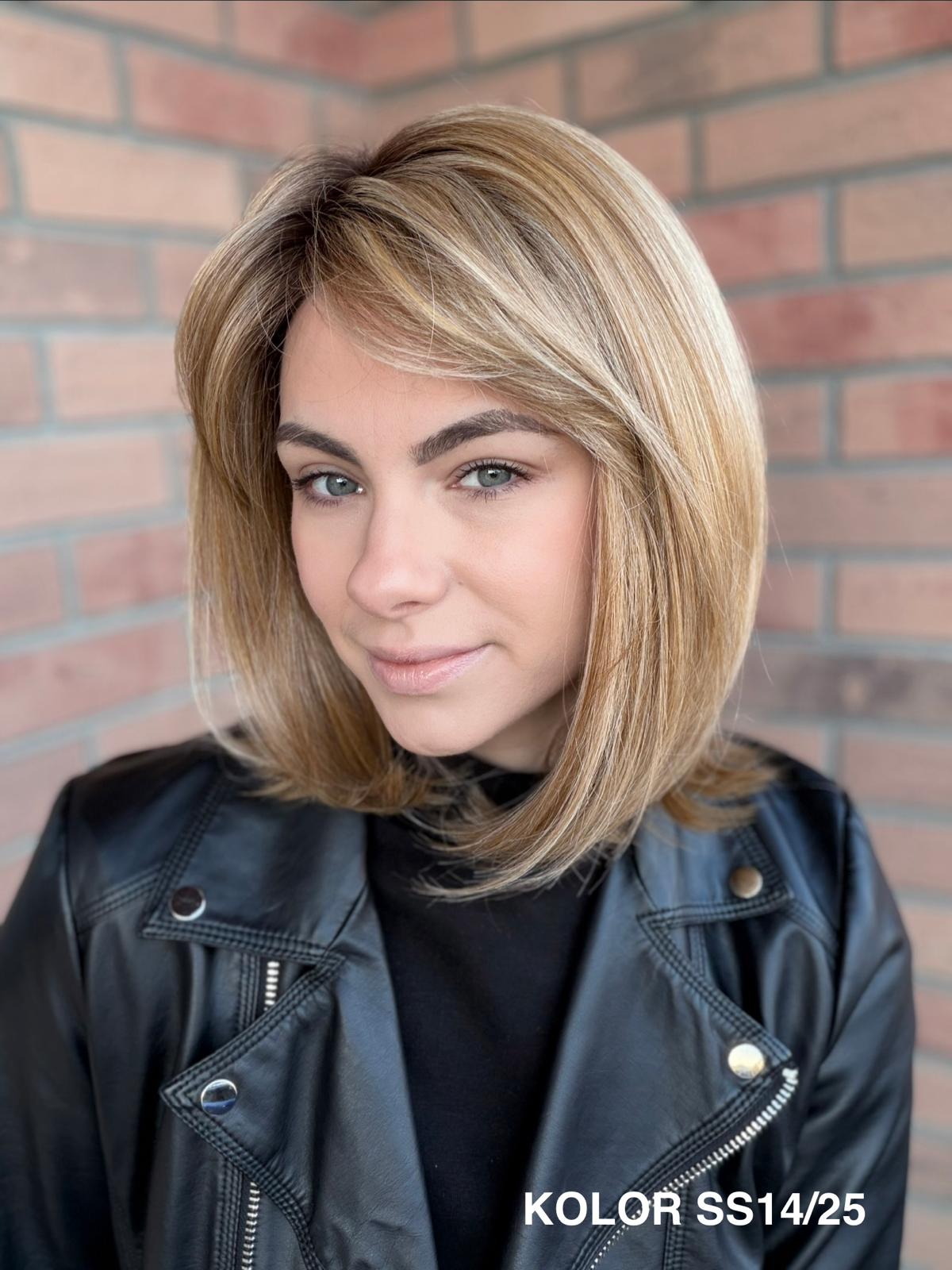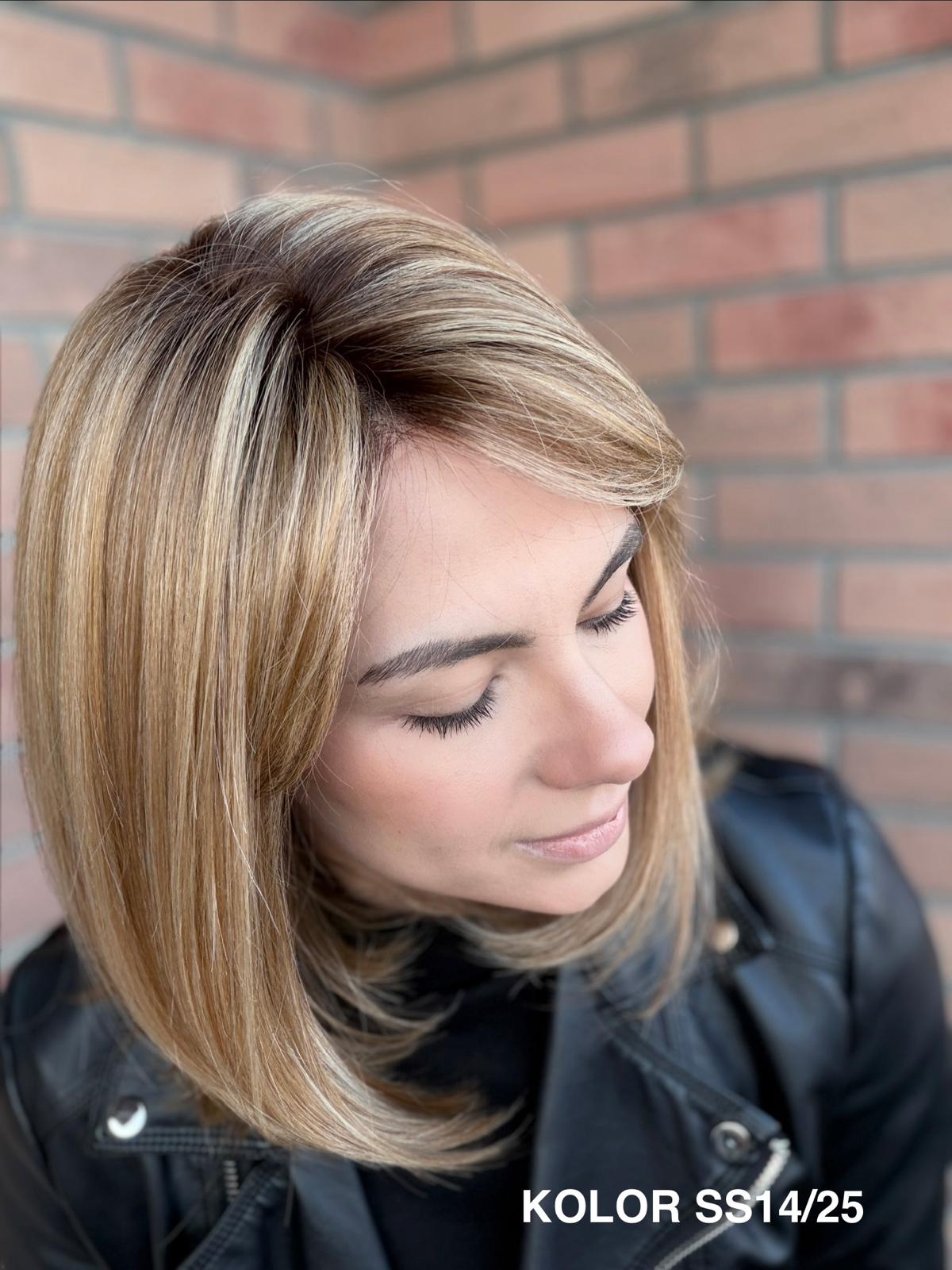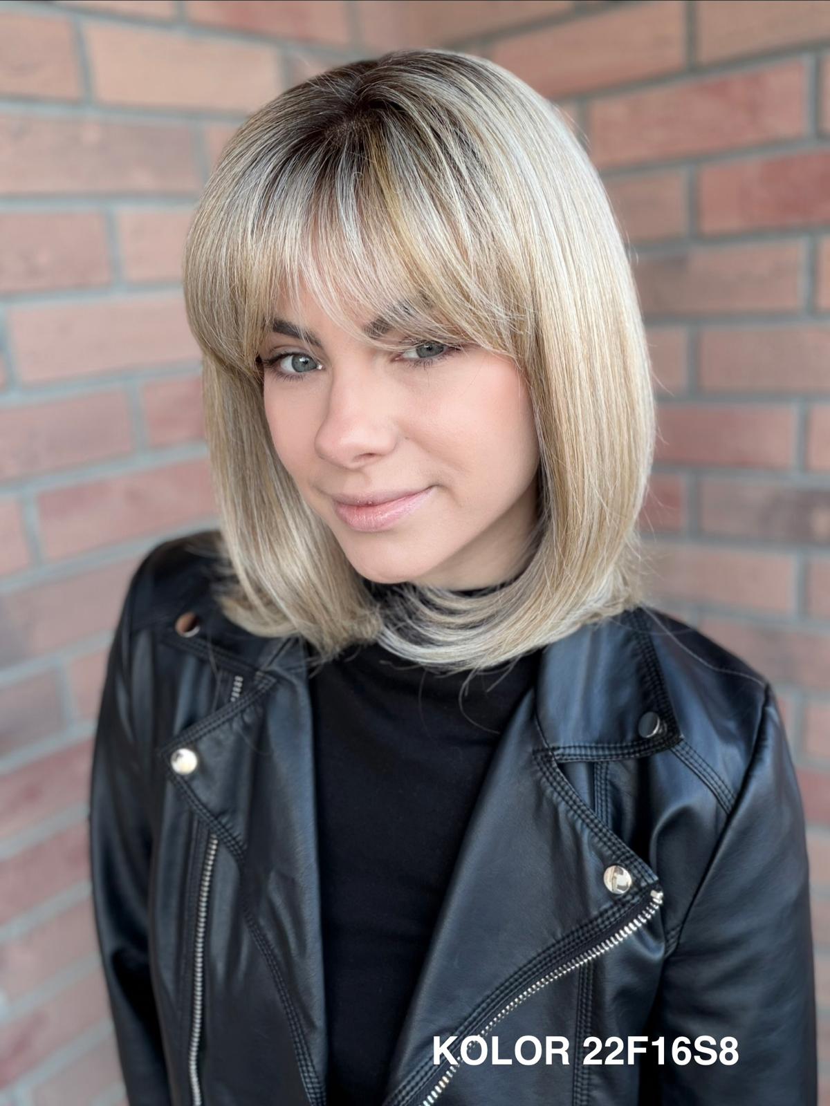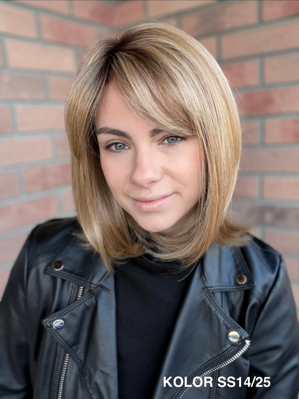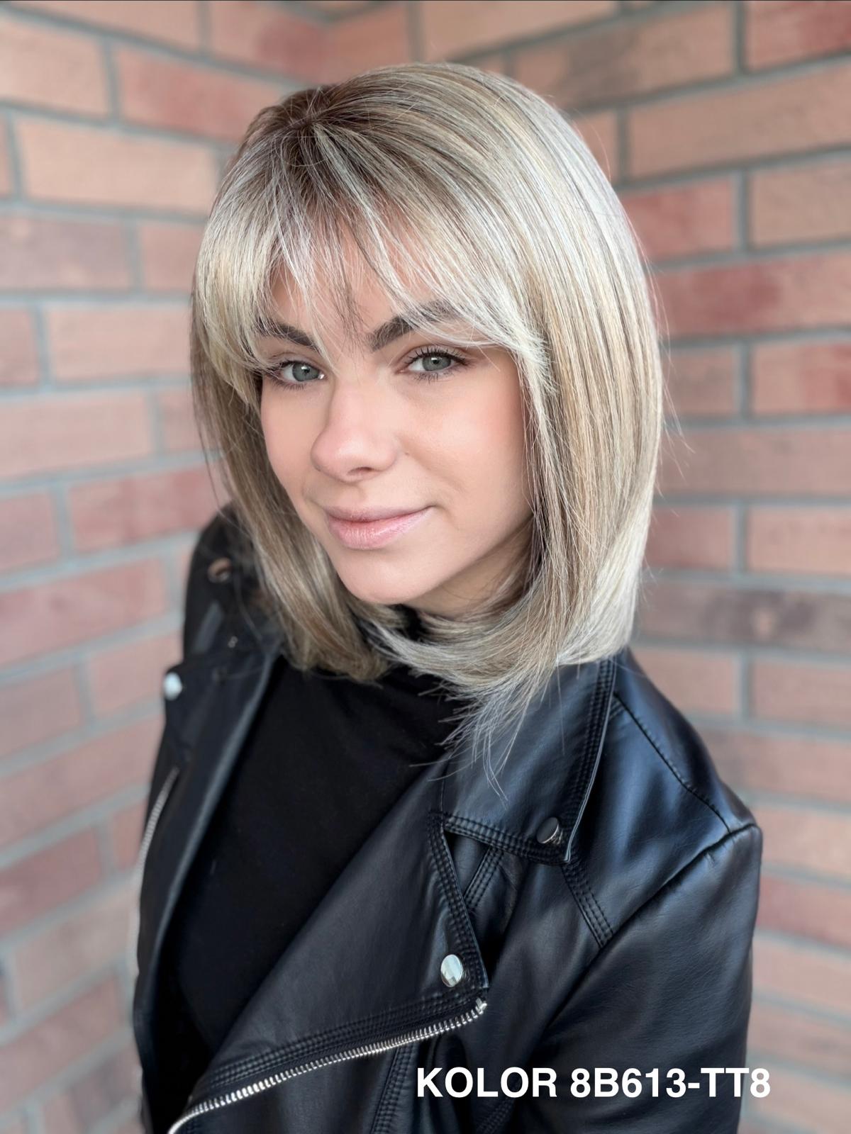 Serena to ponadczasowy, elegancki long bob z grzywką, który daje ogromną swobodę stylizacji i zawsze wygląda naturalnie. Dzięki czepkowi z wysokiej jakości mono top (mikroskóra) grzywkę oraz przedziałek można przekładać w dowolnym kierunku – nosić na prosto, na bok lub delikatnie unieść włosy u nasady, dokładnie tak, jak po profesjonalnej stylizacji. Linia brzegowa czoła jest pięknie rozmyta, subtelna i bardzo realistyczna, co sprawia, że odsłonięcie twarzy wygląda niezwykle naturalnie. To fryzura klasyczna, a jednocześnie świeża – idealna zarówno na co dzień, do pracy, jak i na eleganckie wyjścia.