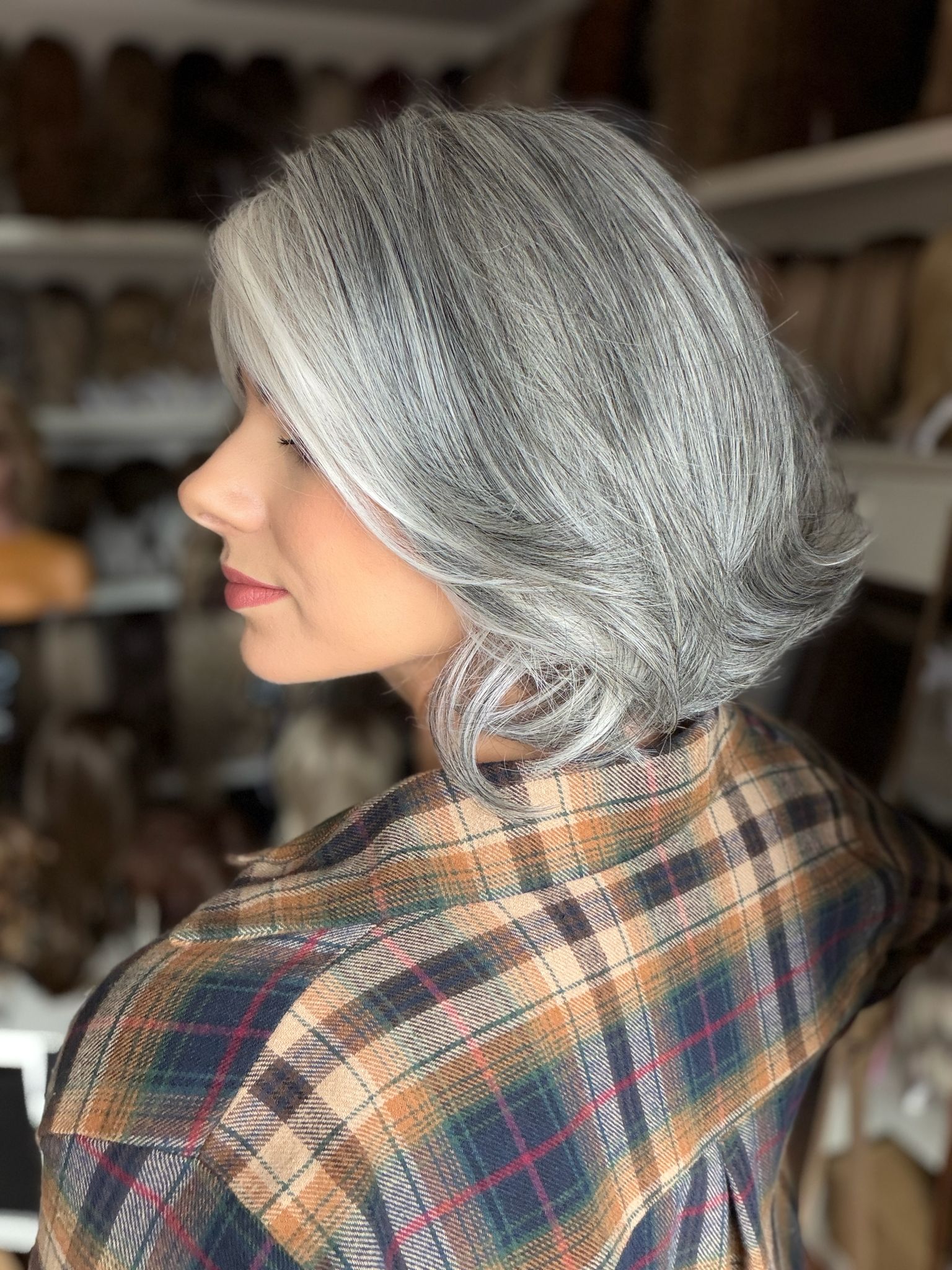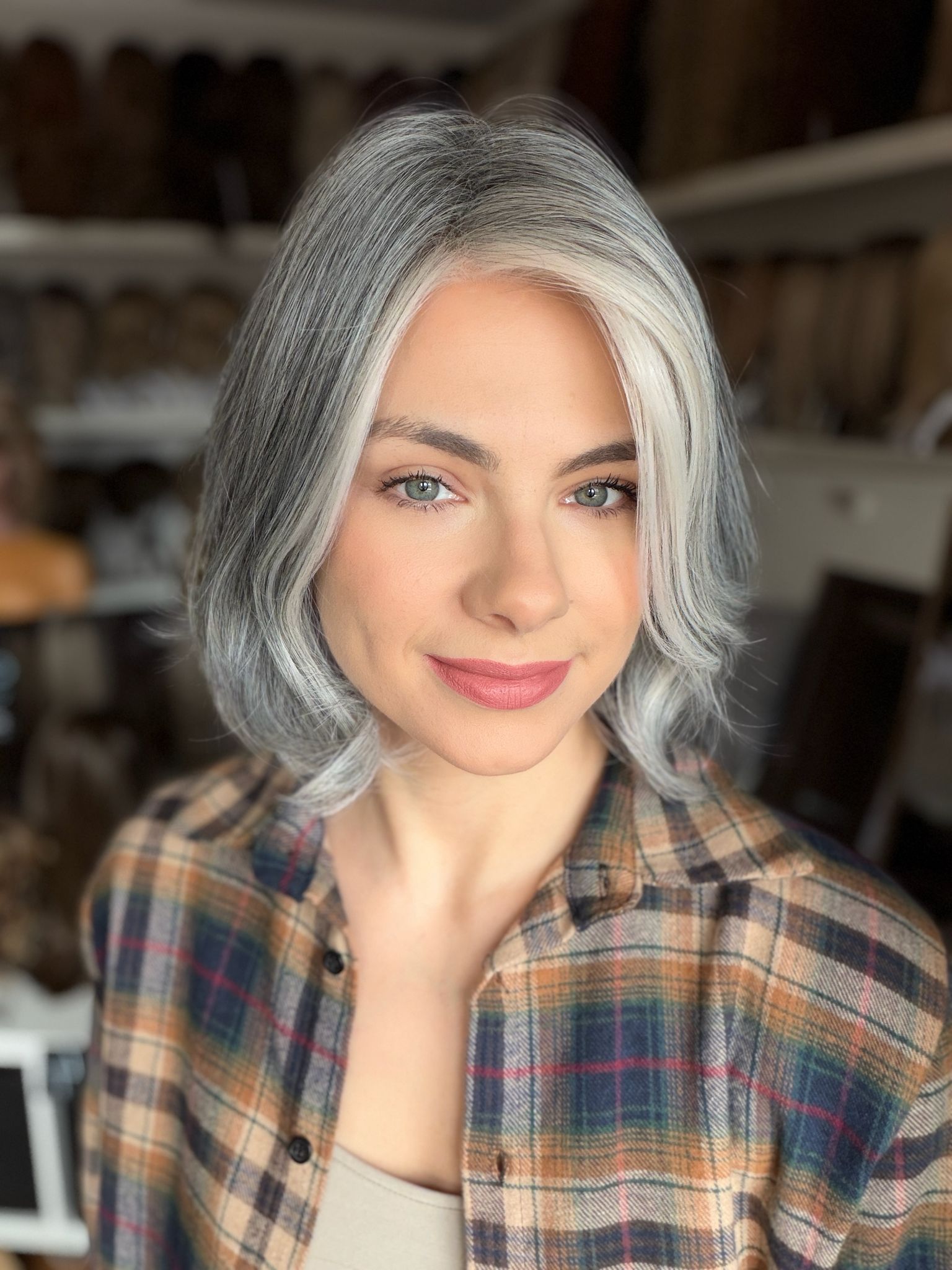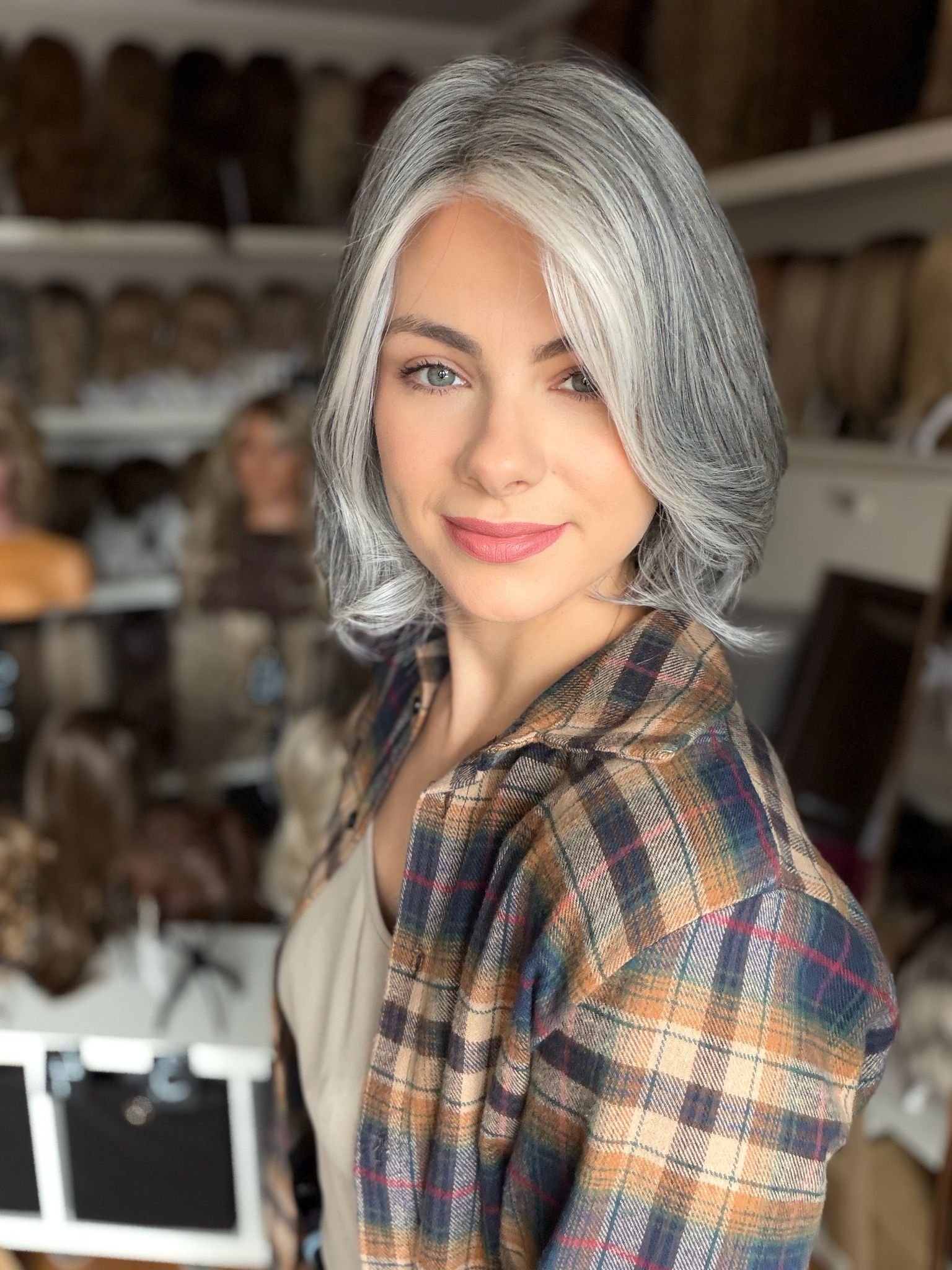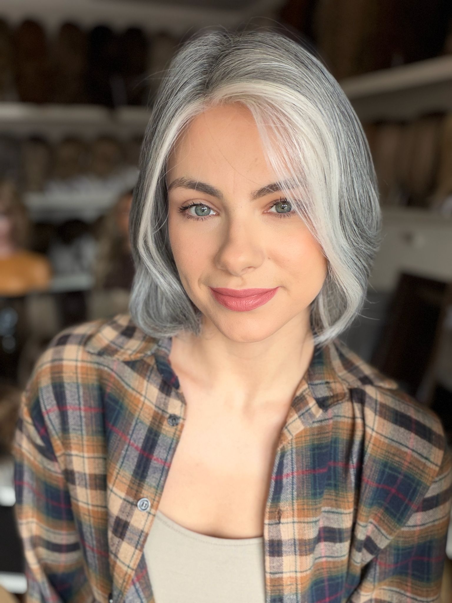 Peruka Sława to niezwykle szykowna, krótka fryzura w szlachetnym odcieniu siwego z subtelnie jaśniejszymi pasmami przy twarzy, które pięknie ją rozświetlają i nadają świeżości. Kolor jest wyrafinowany i bardzo stylowy – podkreśla rysy, dodaje klasy i przyciąga spojrzenia w niezwykle subtelny sposób. Długość ok. 25 cm sprawia, że fryzura jest lekka, harmonijna i łatwa w codziennym noszeniu. Pełny mono top zapewnia swobodę zmiany przedziałka oraz unoszenia włosów u nasady, dzięki czemu całość wygląda naturalnie i dynamicznie. Rozmyta linia brzegowa sprawia, że włosy miękko przechodzą w skórę, tworząc efekt bardzo realistycznej fryzury. To model dla kobiet, które cenią ponadczasową elegancję i dopracowane detale.