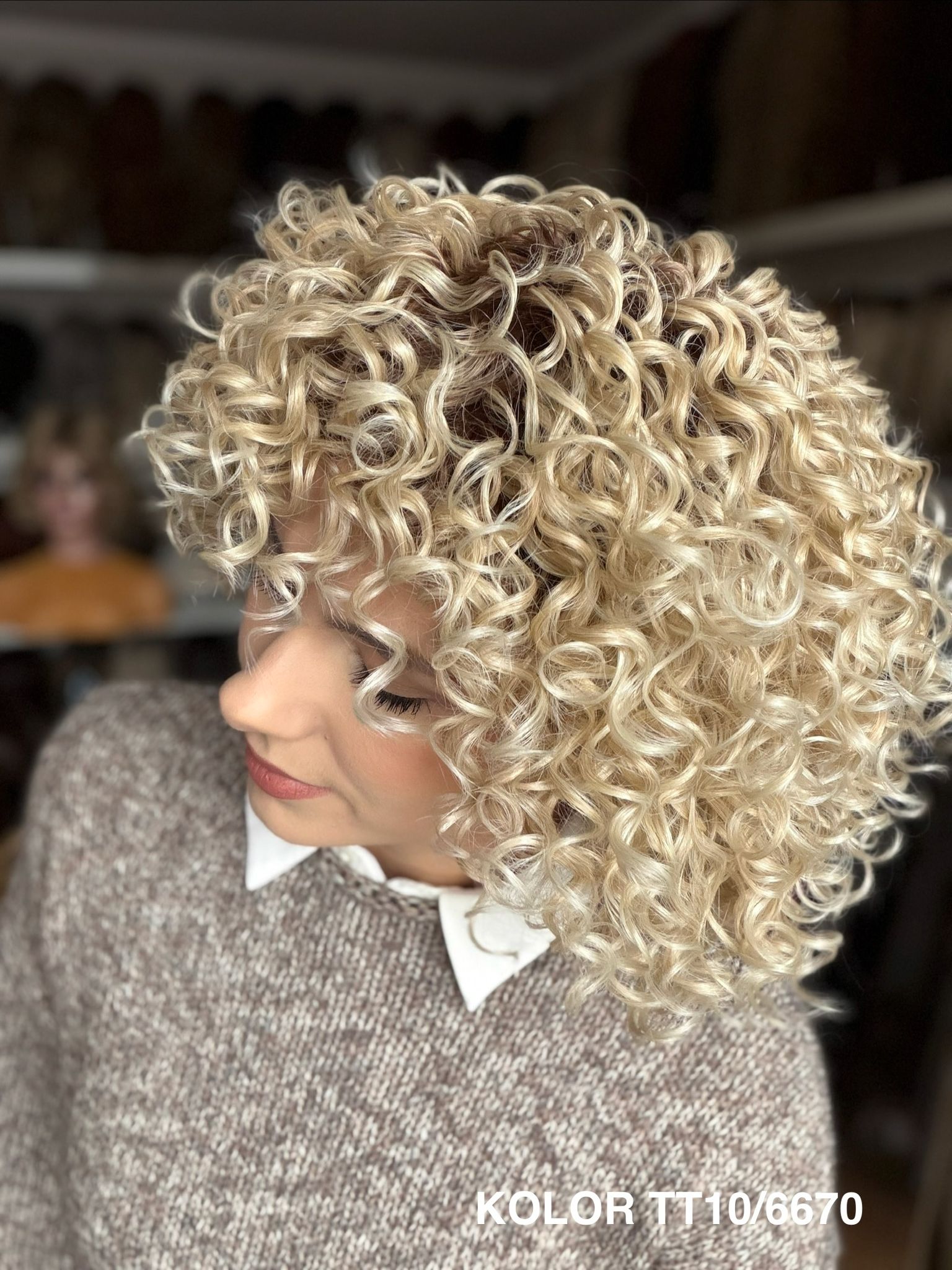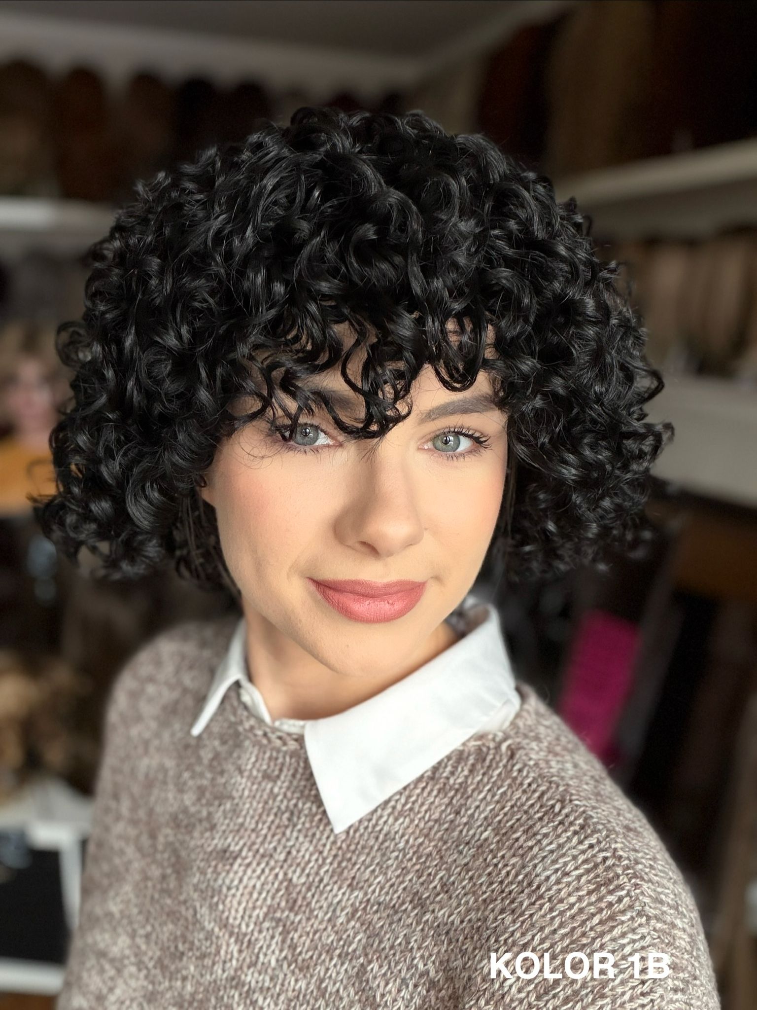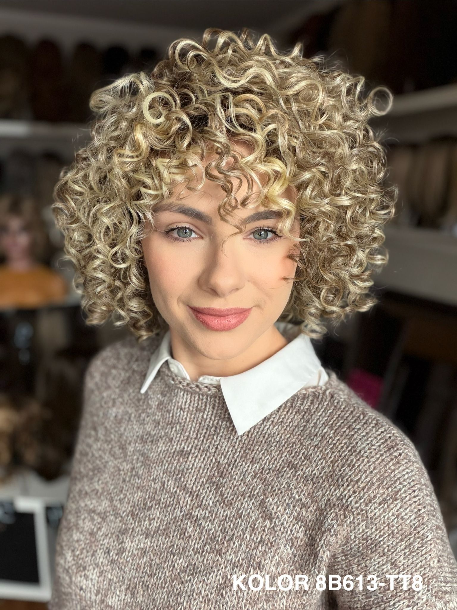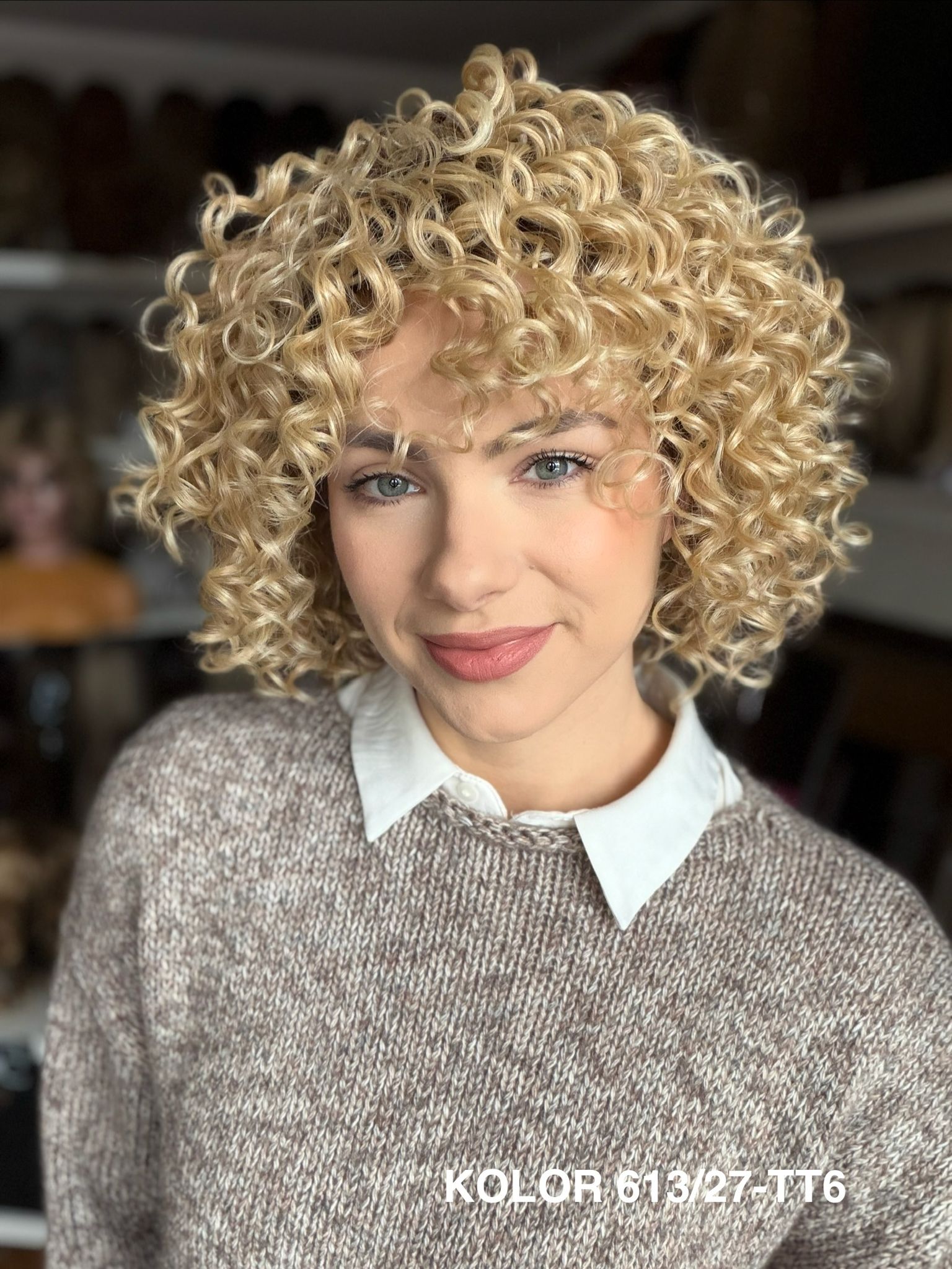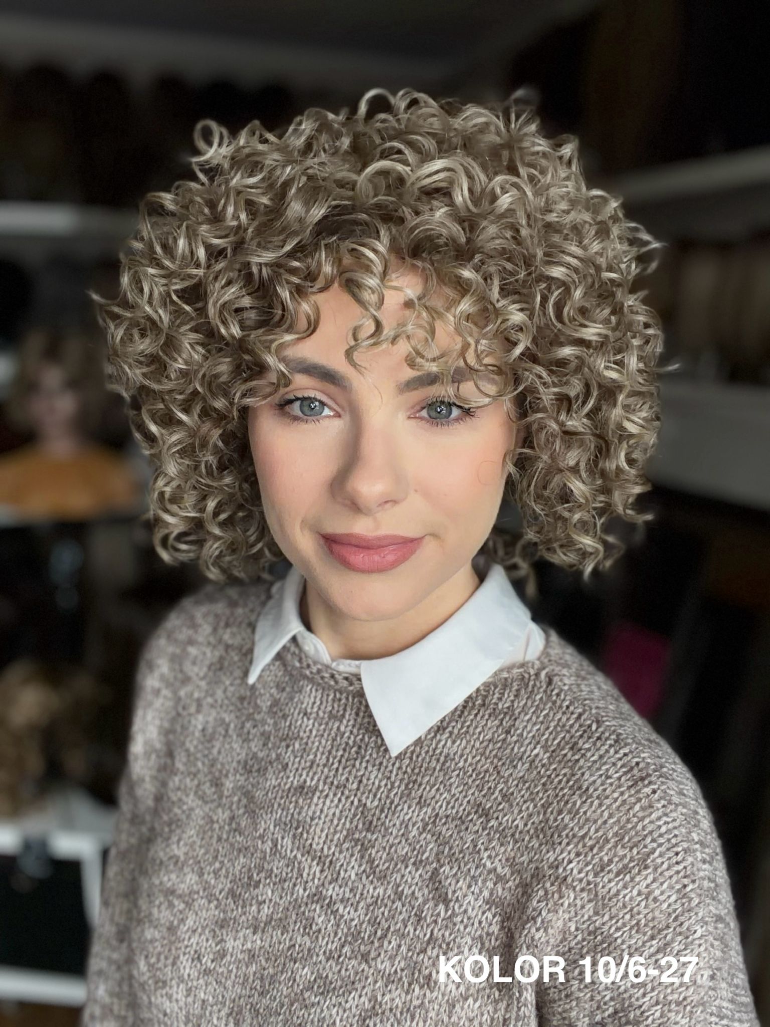 Tami to krótka peruka w stylu afro z pięknymi, sprężystymi lokami o długości około 25 cm. Loki są gęste, równomiernie rozłożone, tworzą naturalnie wyglądającą fryzurę z objętością i lekkością. Przedziałek wykonany z lateksu doskonale imituje skórę głowy, zapewniając realistyczny efekt. Fryzura idealnie podkreśla rysy twarzy i nadaje młodzieńczy, energiczny wygląd. To świetna propozycja zarówno dla miłośniczek klasyki w nowoczesnym wydaniu, jak i odważnych stylizacji z pazurem.