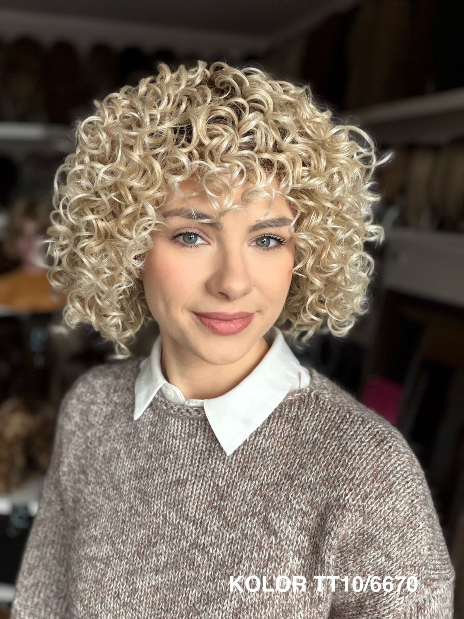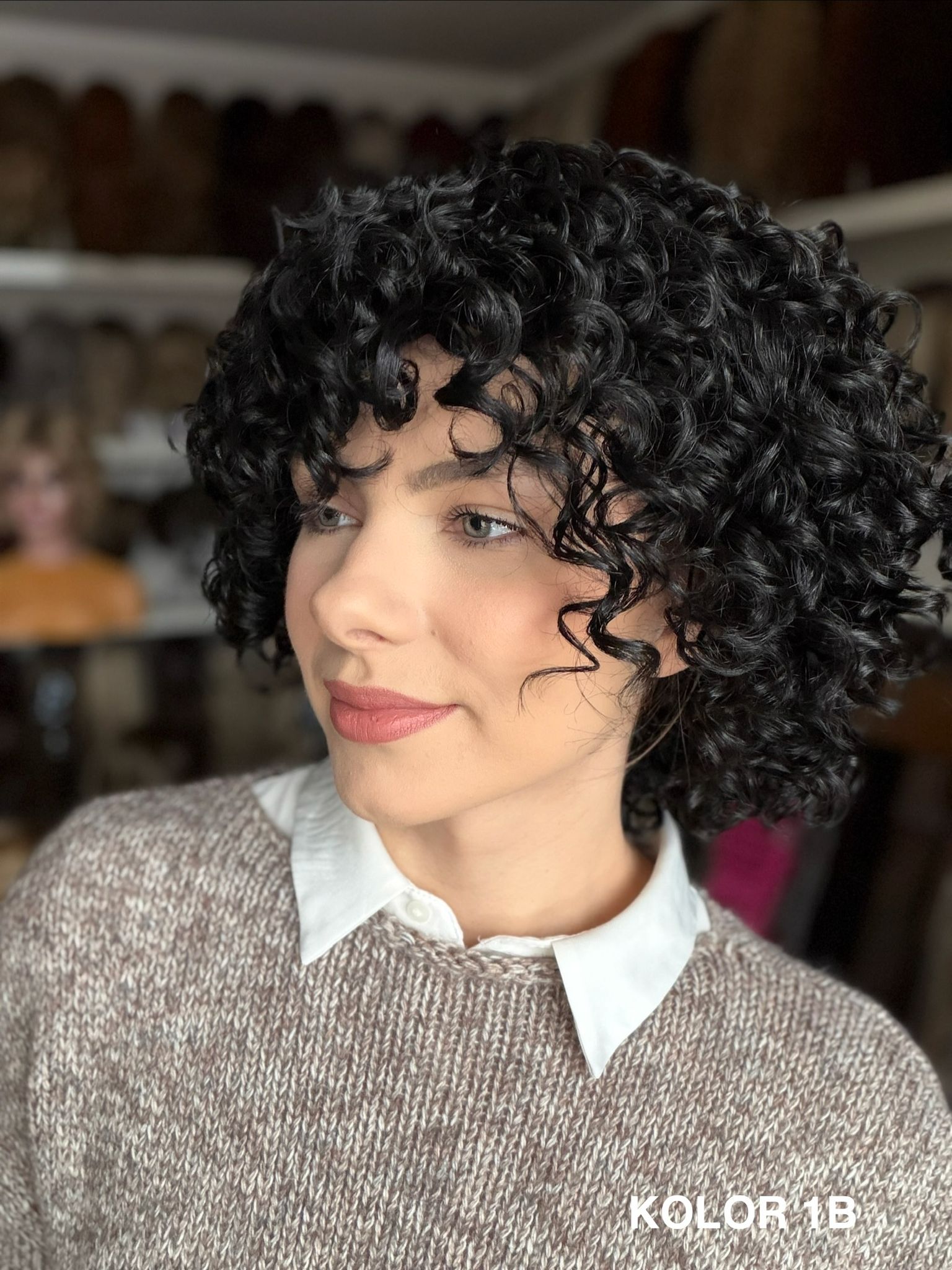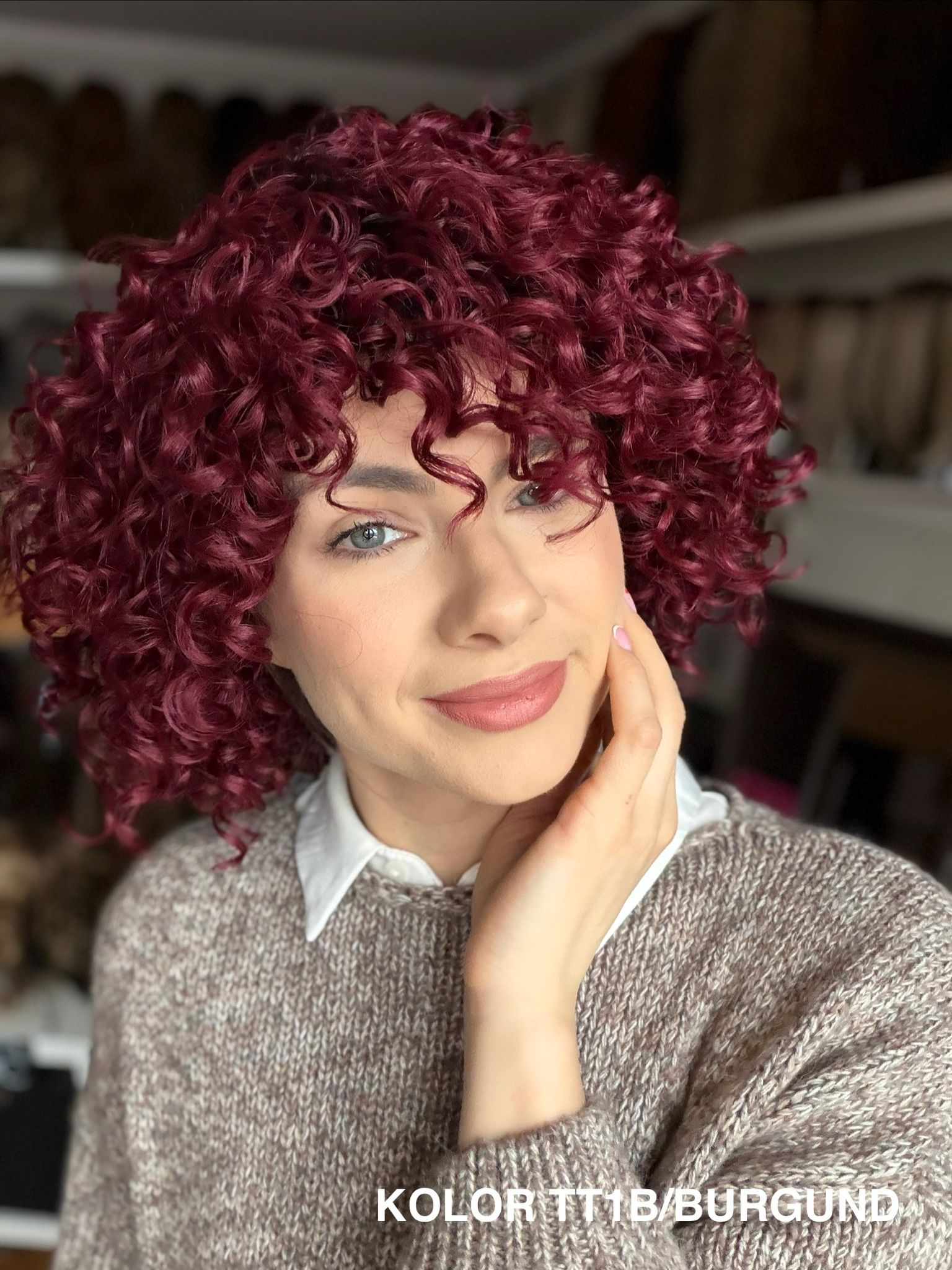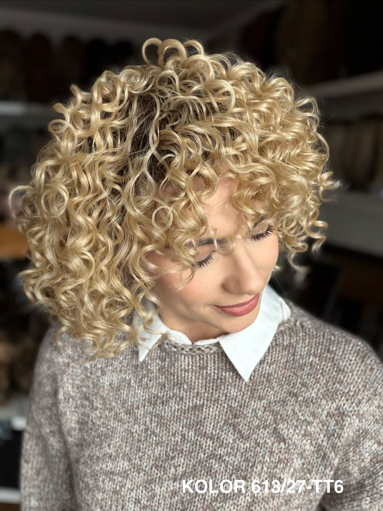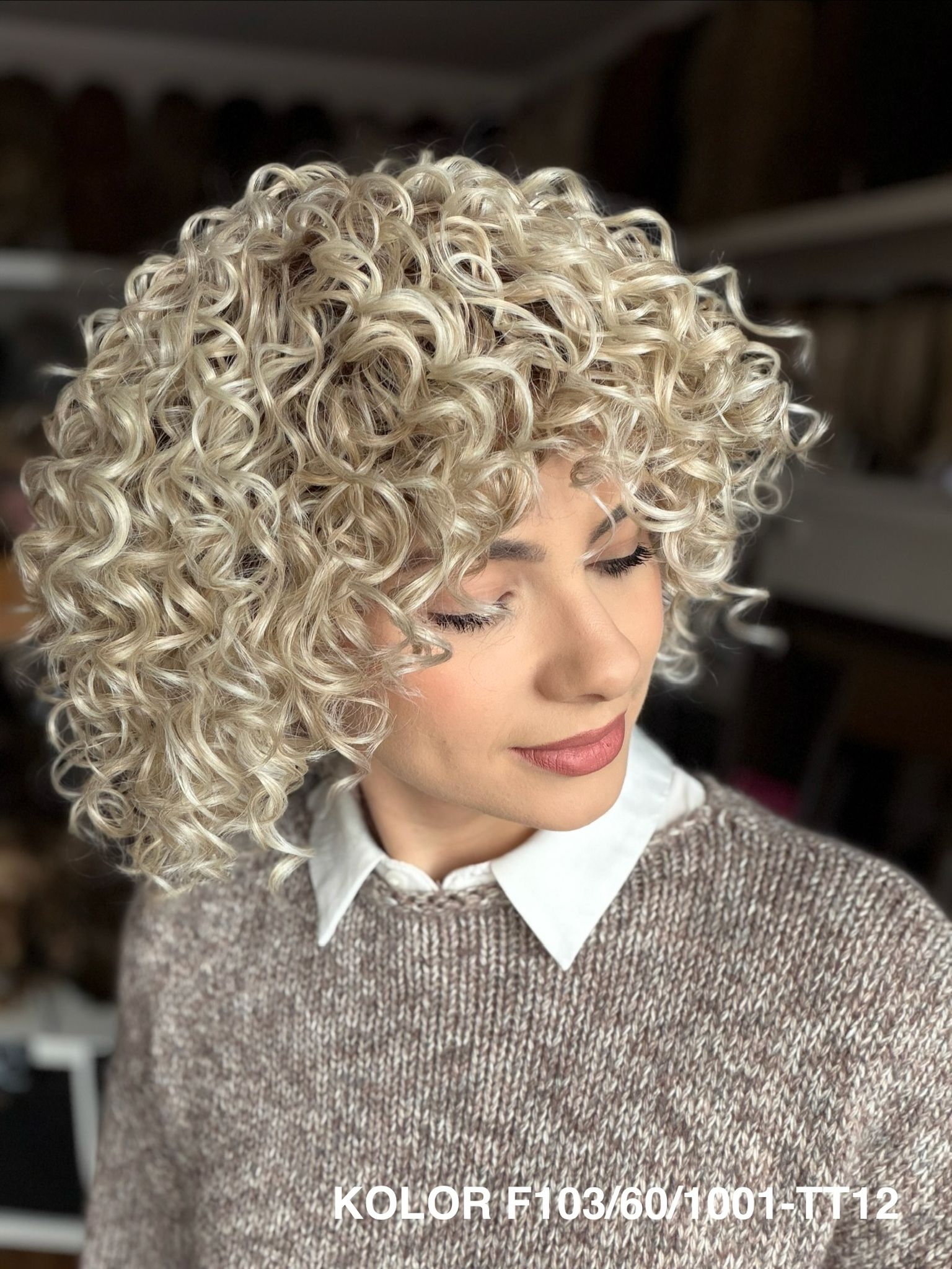 Tami to krótka peruka w stylu afro z pięknymi, sprężystymi lokami o długości około 25 cm. Loki są gęste, równomiernie rozłożone, tworzą naturalnie wyglądającą fryzurę z objętością i lekkością. Przedziałek wykonany z lateksu doskonale imituje skórę głowy, zapewniając realistyczny efekt. Fryzura idealnie podkreśla rysy twarzy i nadaje młodzieńczy, energiczny wygląd. To świetna propozycja zarówno dla miłośniczek klasyki w nowoczesnym wydaniu, jak i odważnych stylizacji z pazurem.