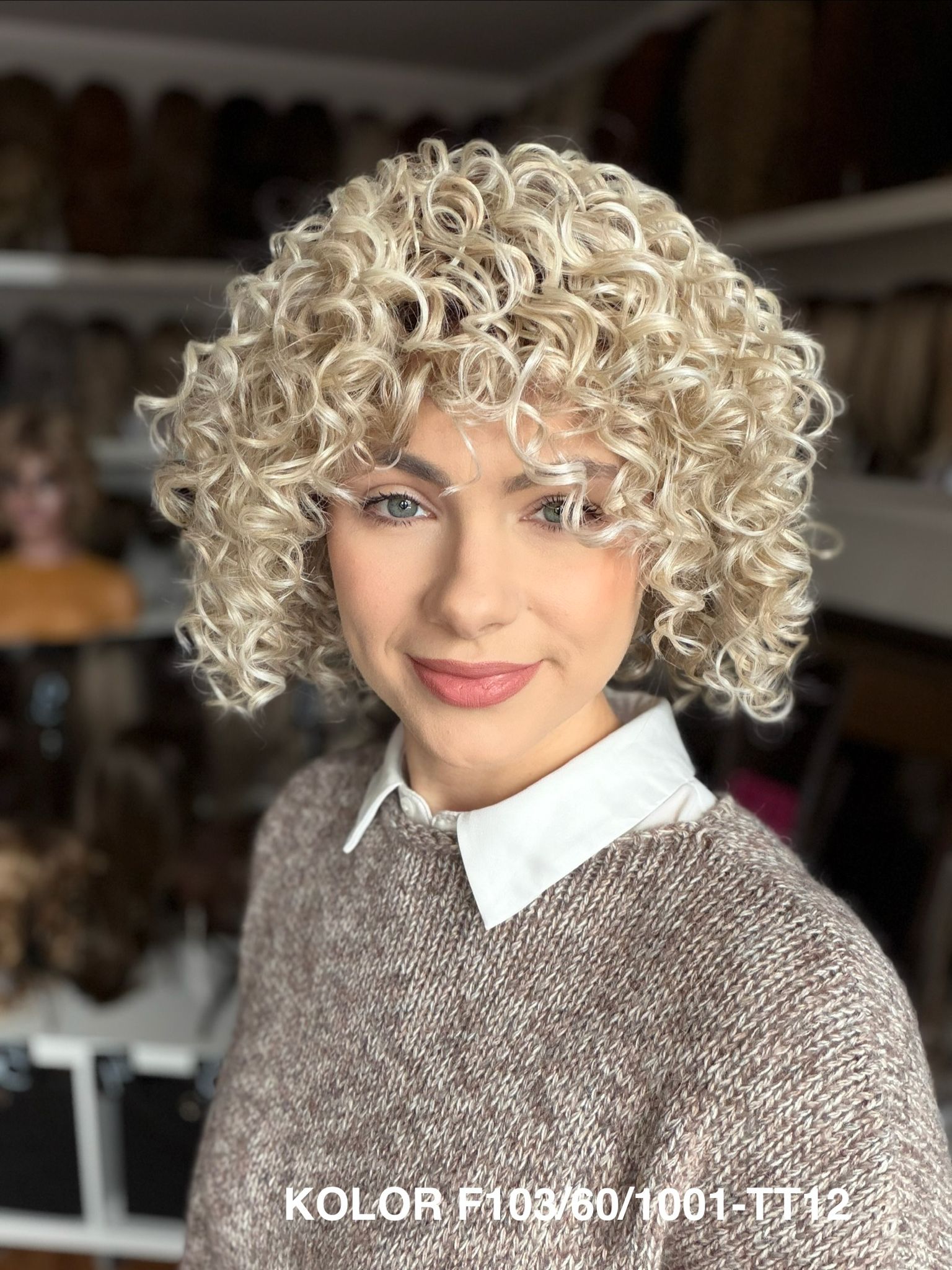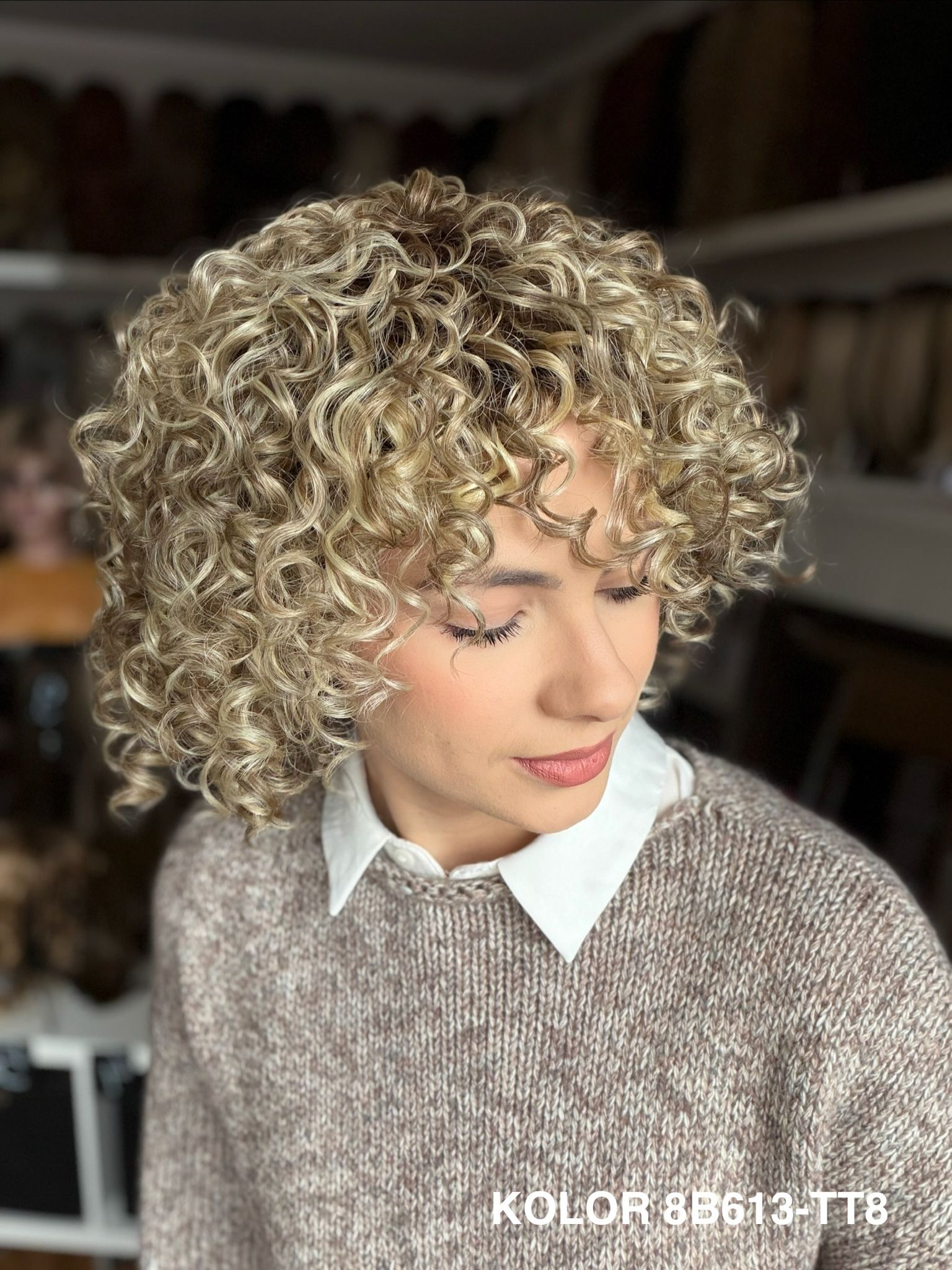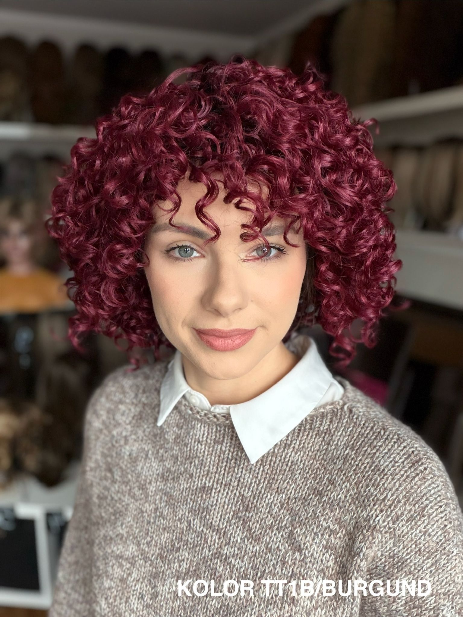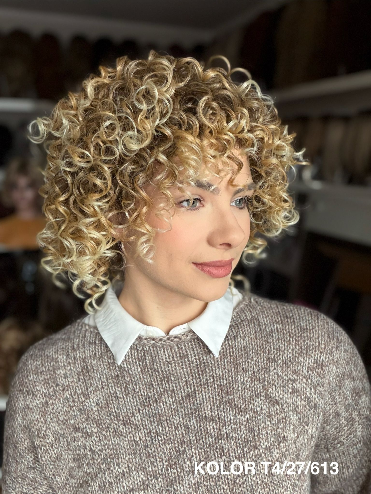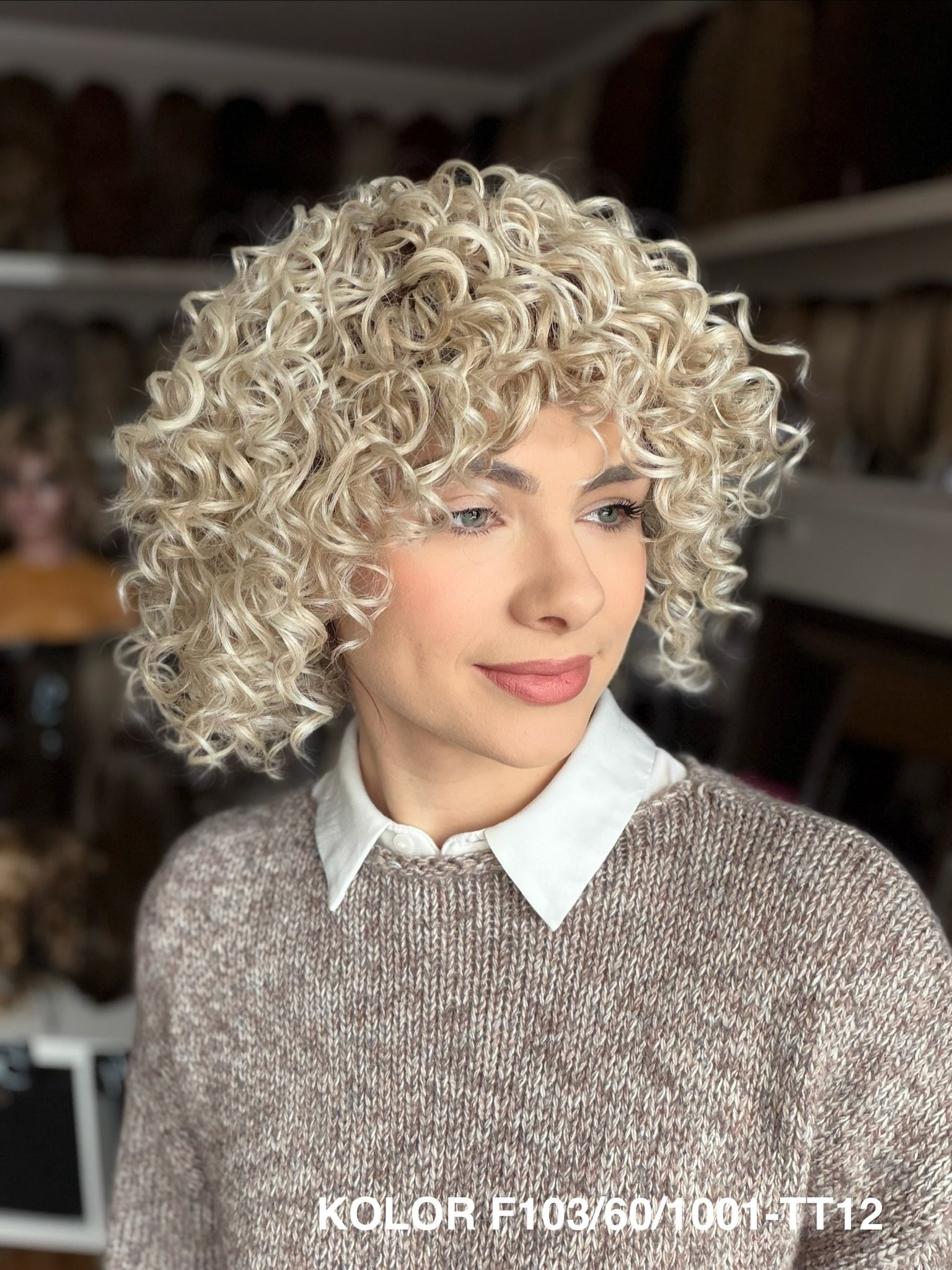 Tami to krótka peruka w stylu afro z pięknymi, sprężystymi lokami o długości około 25 cm. Loki są gęste, równomiernie rozłożone, tworzą naturalnie wyglądającą fryzurę z objętością i lekkością. Przedziałek wykonany z lateksu doskonale imituje skórę głowy, zapewniając realistyczny efekt. Fryzura idealnie podkreśla rysy twarzy i nadaje młodzieńczy, energiczny wygląd. To świetna propozycja zarówno dla miłośniczek klasyki w nowoczesnym wydaniu, jak i odważnych stylizacji z pazurem.