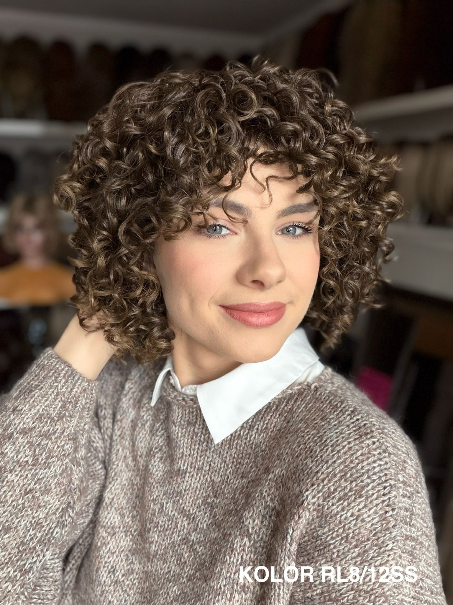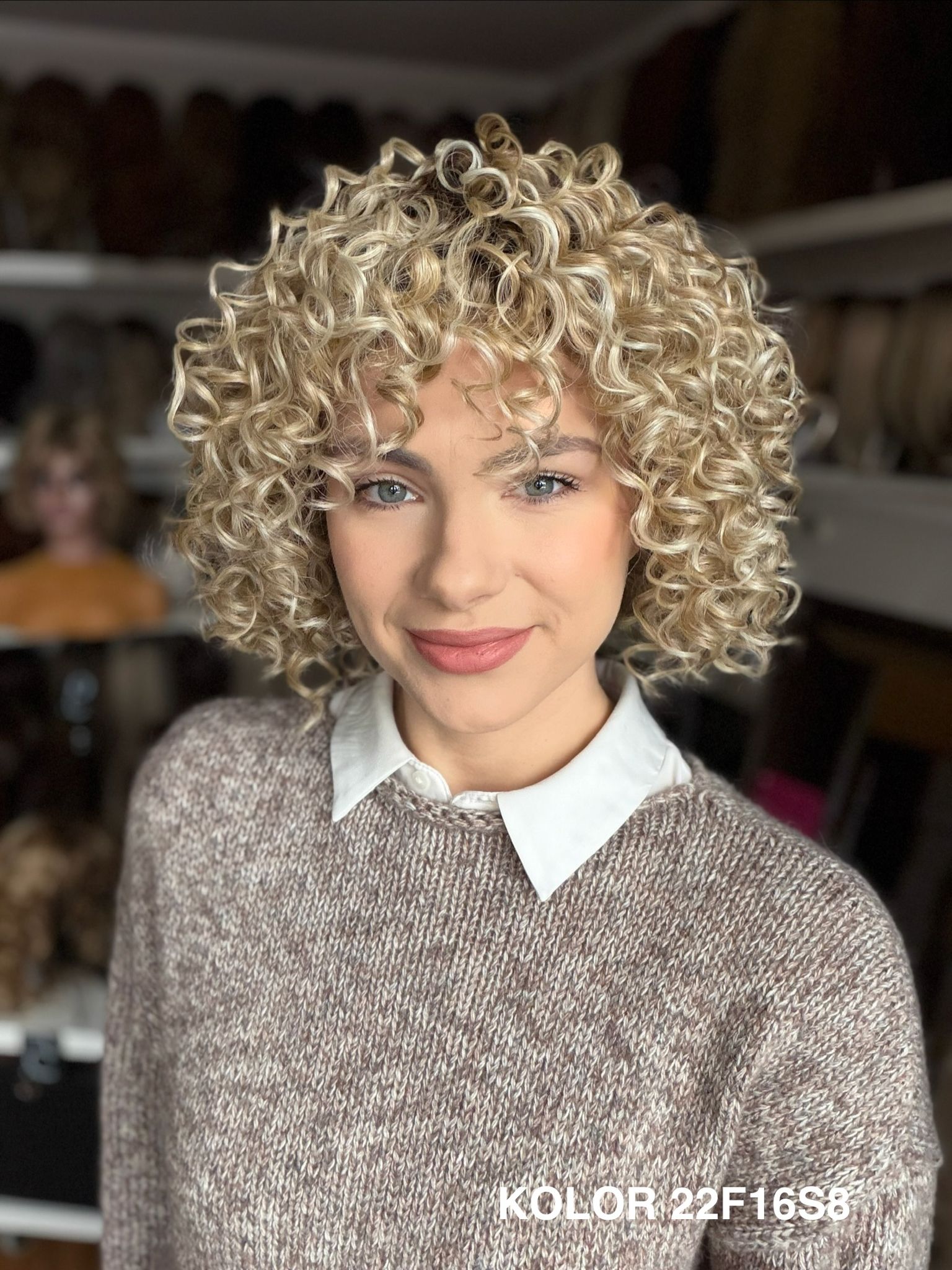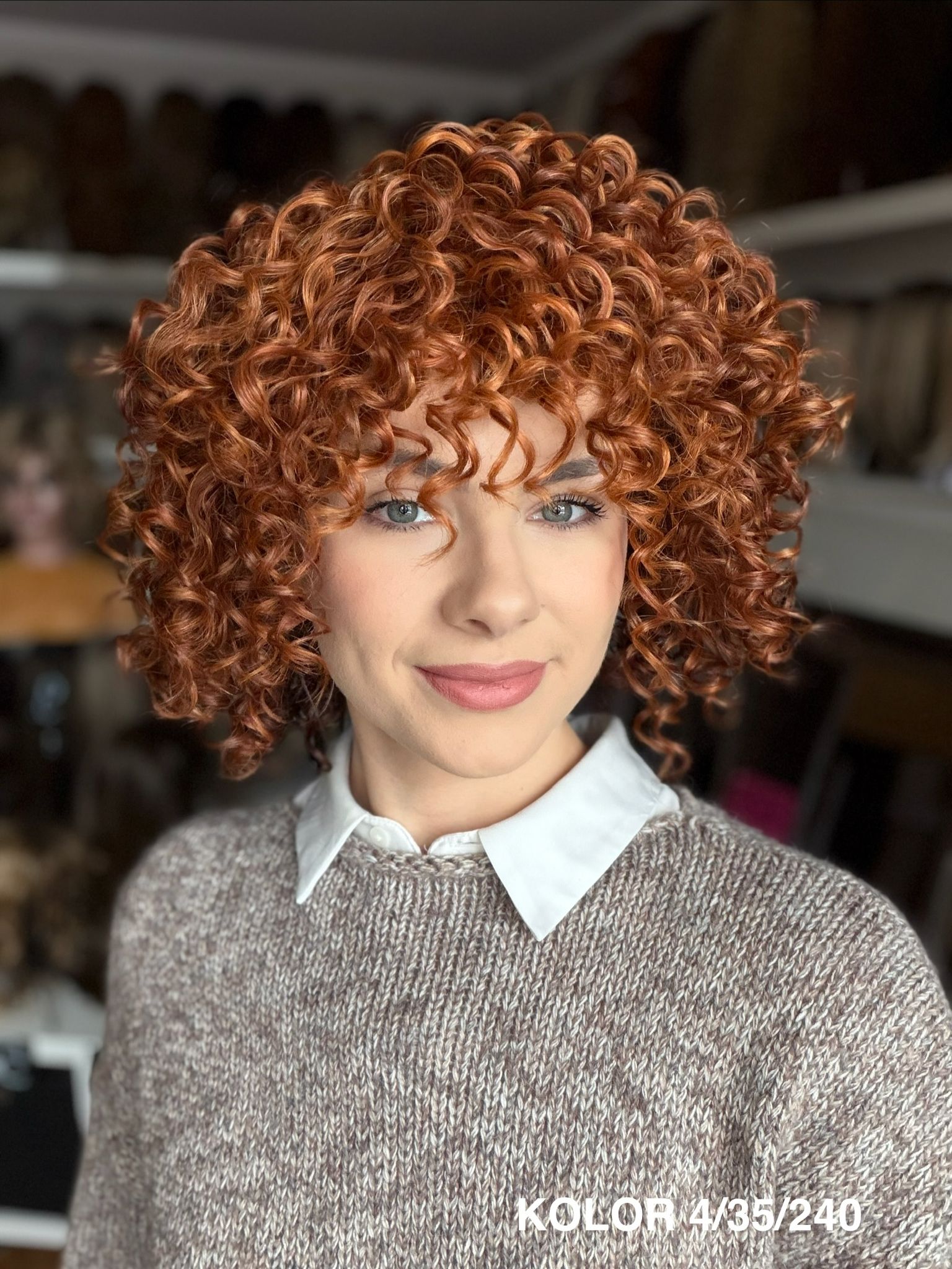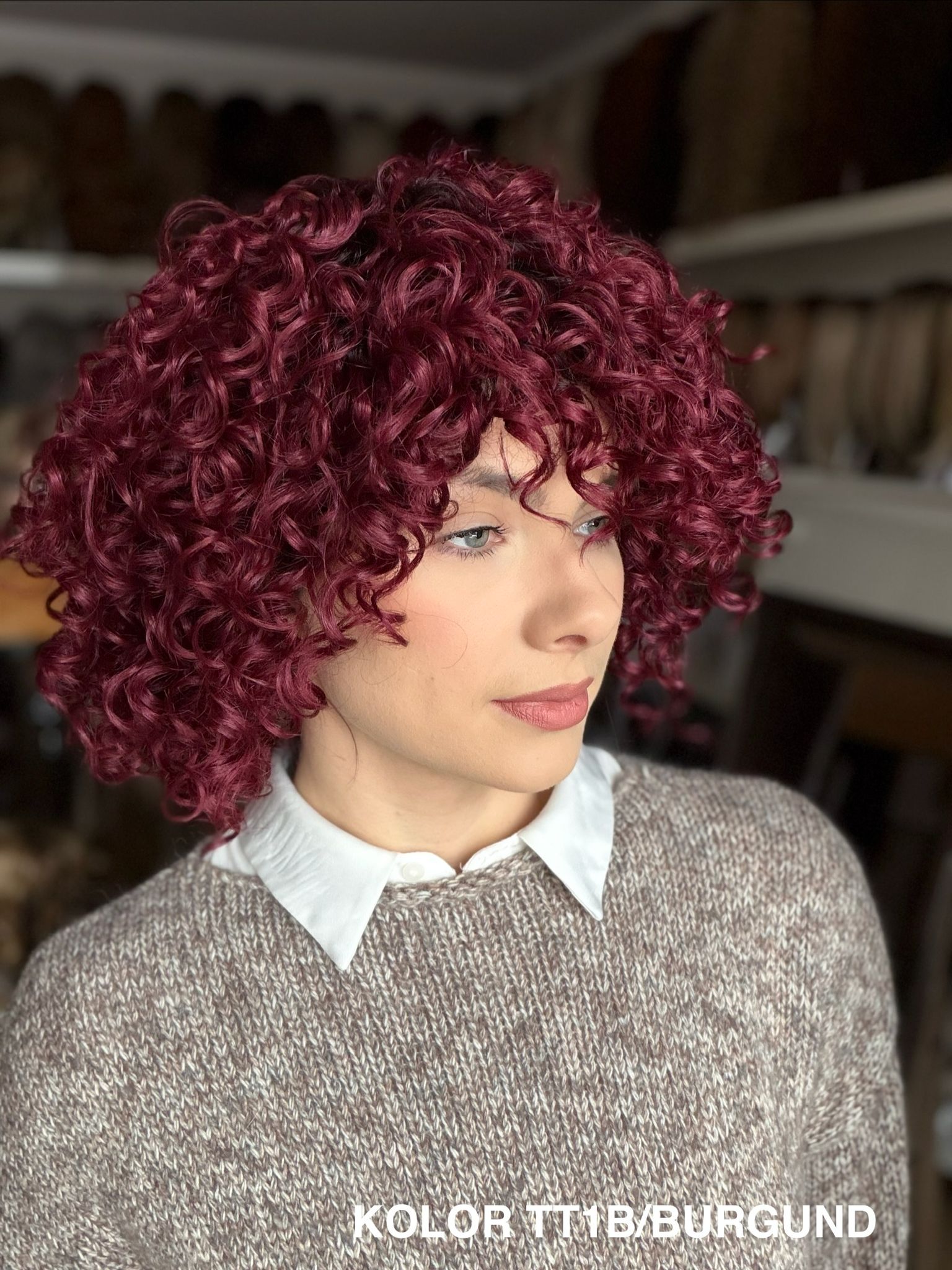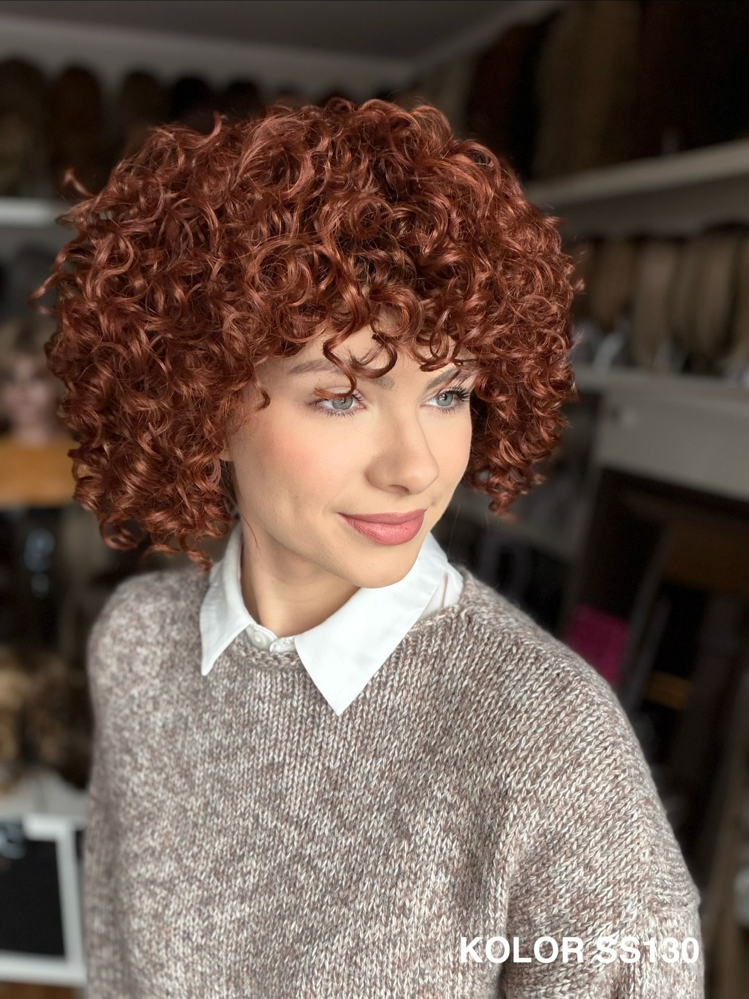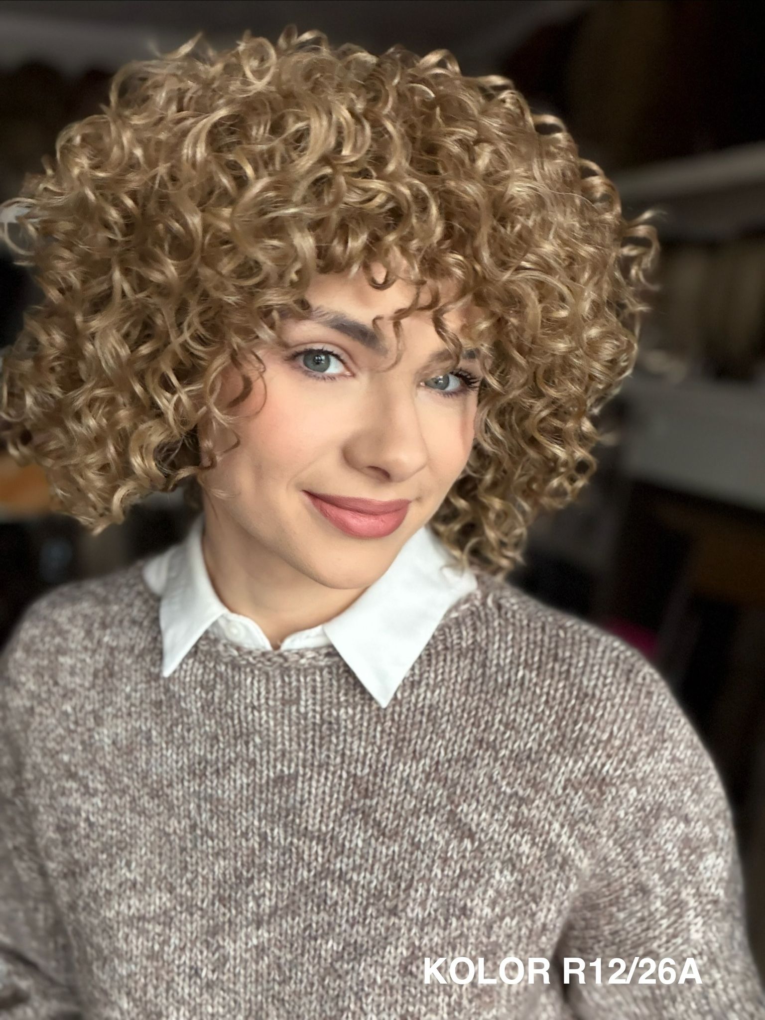 Tami to krótka peruka w stylu afro z pięknymi, sprężystymi lokami o długości około 25 cm. Loki są gęste, równomiernie rozłożone, tworzą naturalnie wyglądającą fryzurę z objętością i lekkością. Przedziałek wykonany z lateksu doskonale imituje skórę głowy, zapewniając realistyczny efekt. Fryzura idealnie podkreśla rysy twarzy i nadaje młodzieńczy, energiczny wygląd. To świetna propozycja zarówno dla miłośniczek klasyki w nowoczesnym wydaniu, jak i odważnych stylizacji z pazurem.