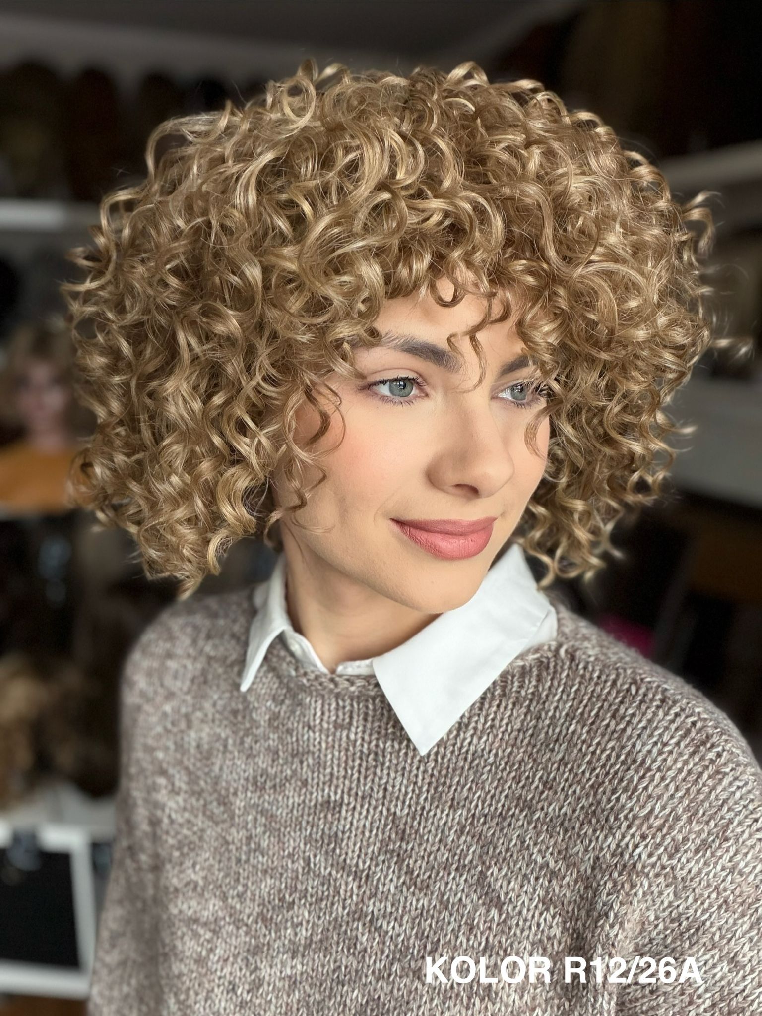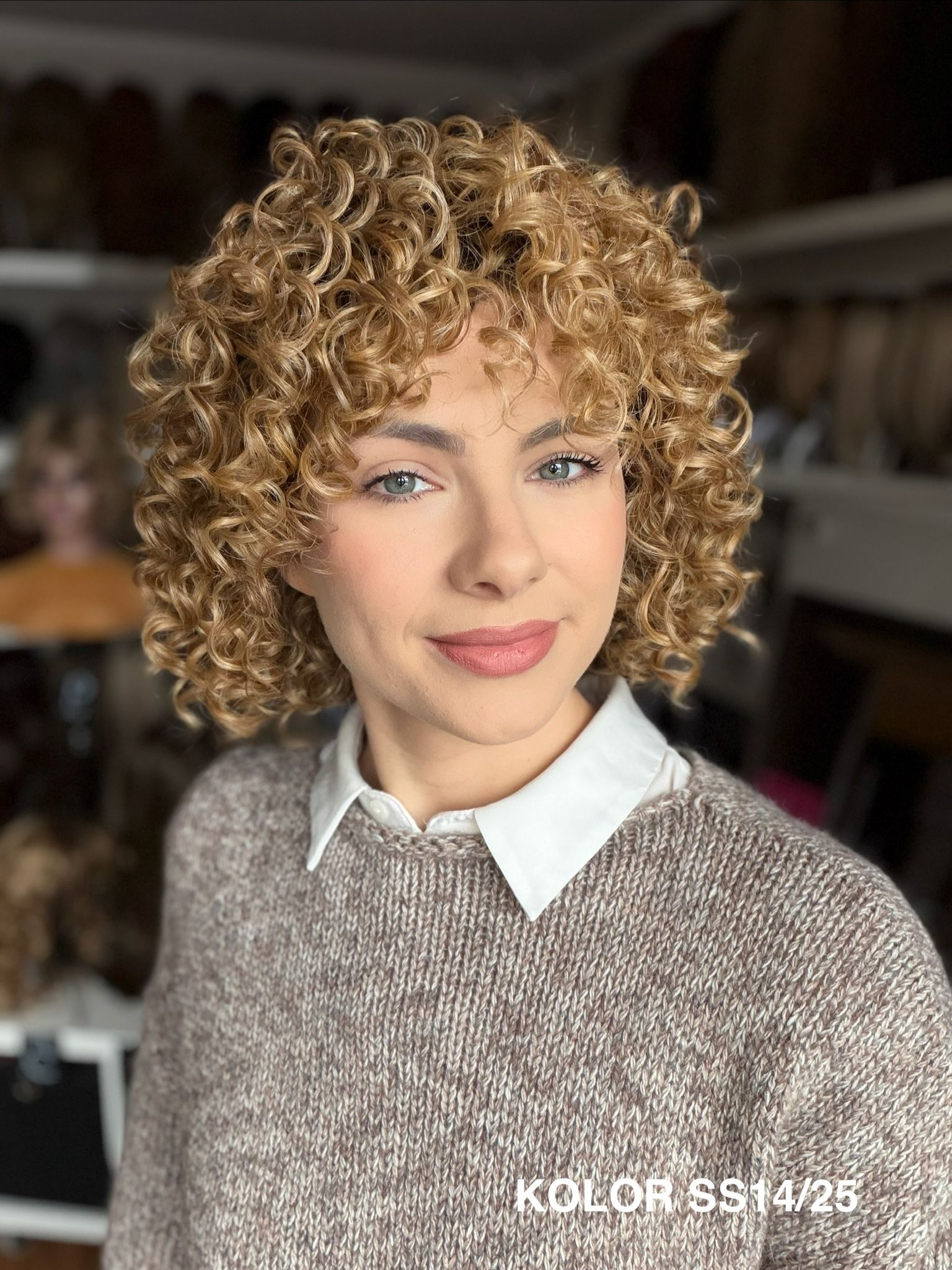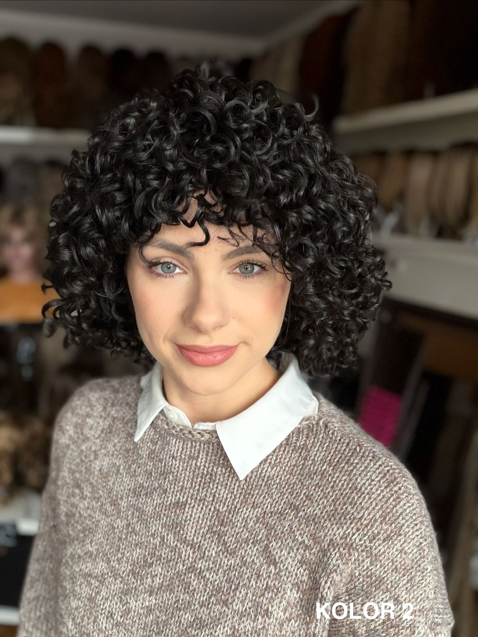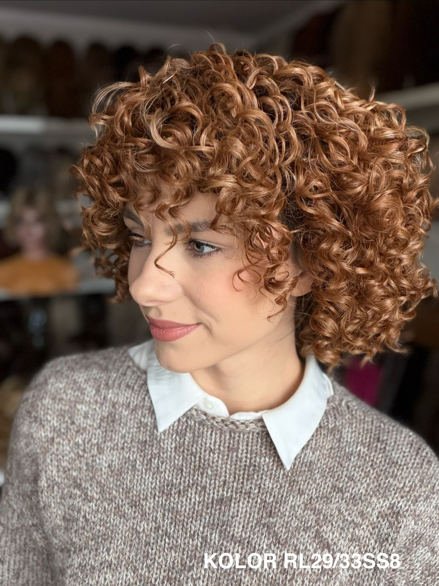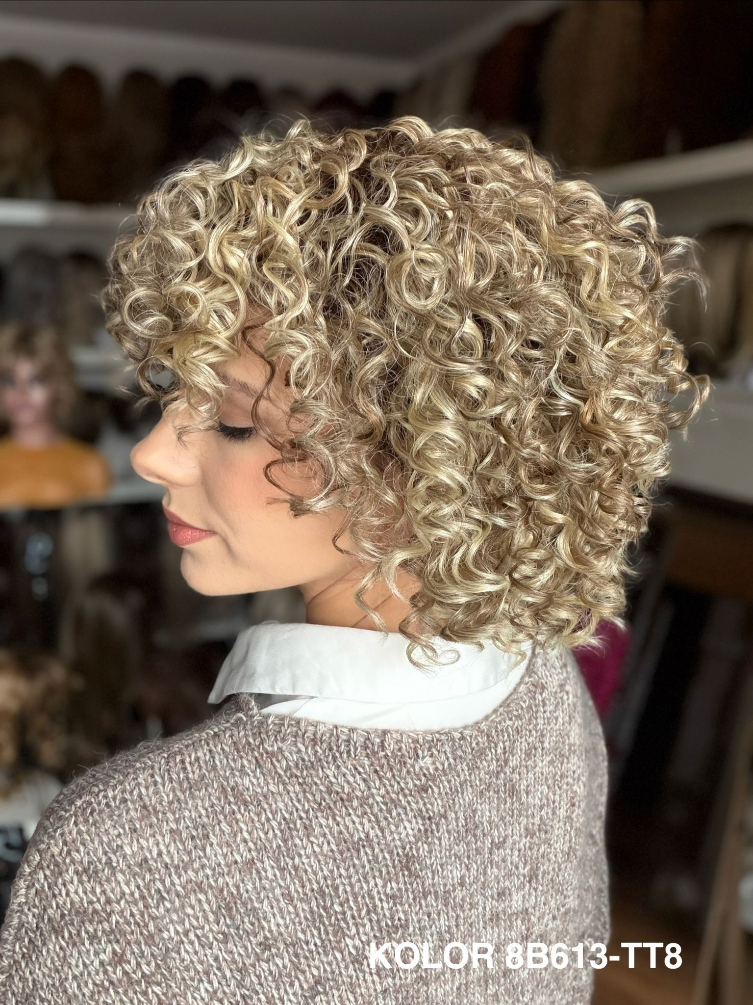 Tami to krótka peruka w stylu afro z pięknymi, sprężystymi lokami o długości około 25 cm. Loki są gęste, równomiernie rozłożone, tworzą naturalnie wyglądającą fryzurę z objętością i lekkością. Przedziałek wykonany z lateksu doskonale imituje skórę głowy, zapewniając realistyczny efekt. Fryzura idealnie podkreśla rysy twarzy i nadaje młodzieńczy, energiczny wygląd. To świetna propozycja zarówno dla miłośniczek klasyki w nowoczesnym wydaniu, jak i odważnych stylizacji z pazurem.
