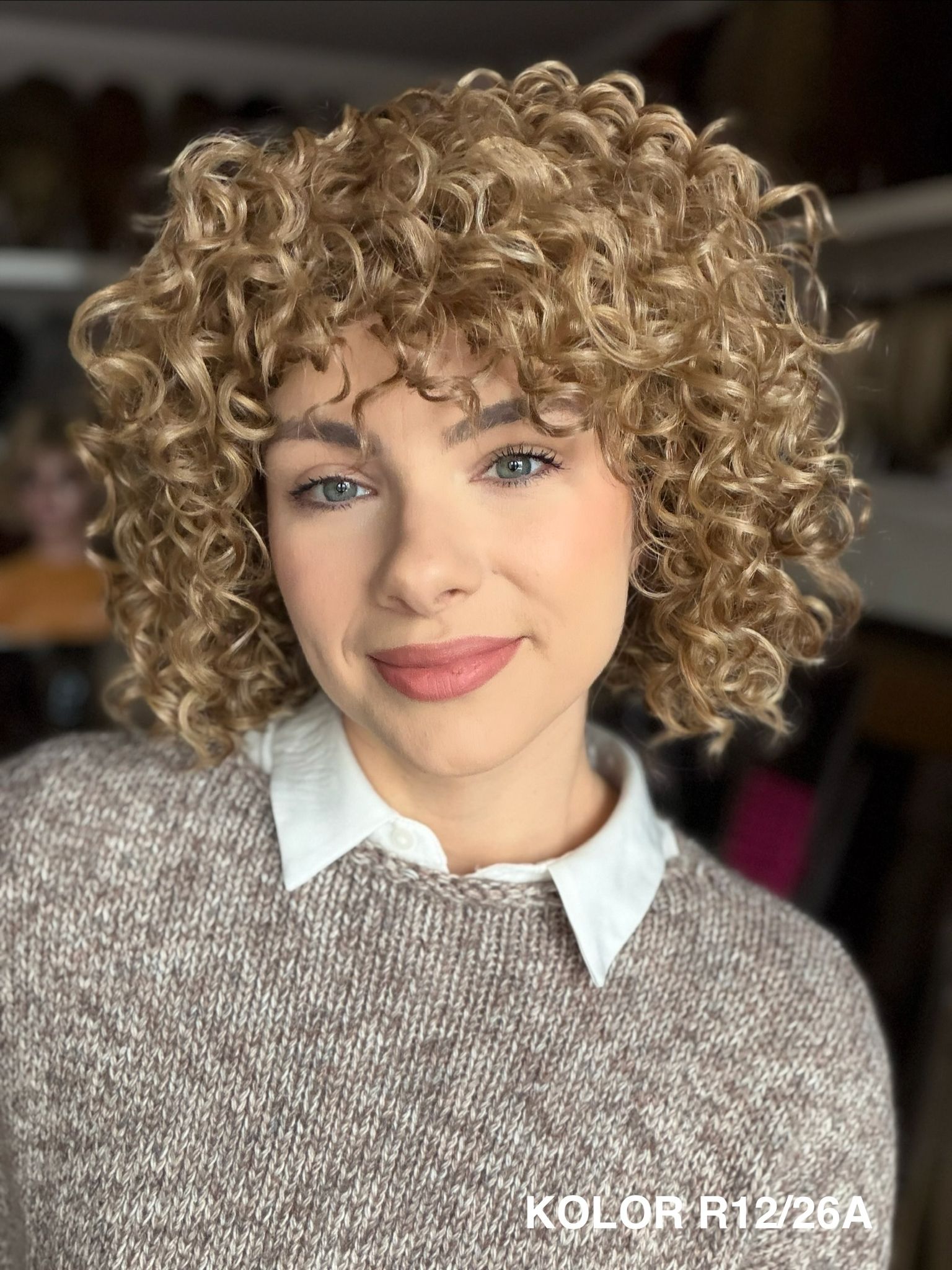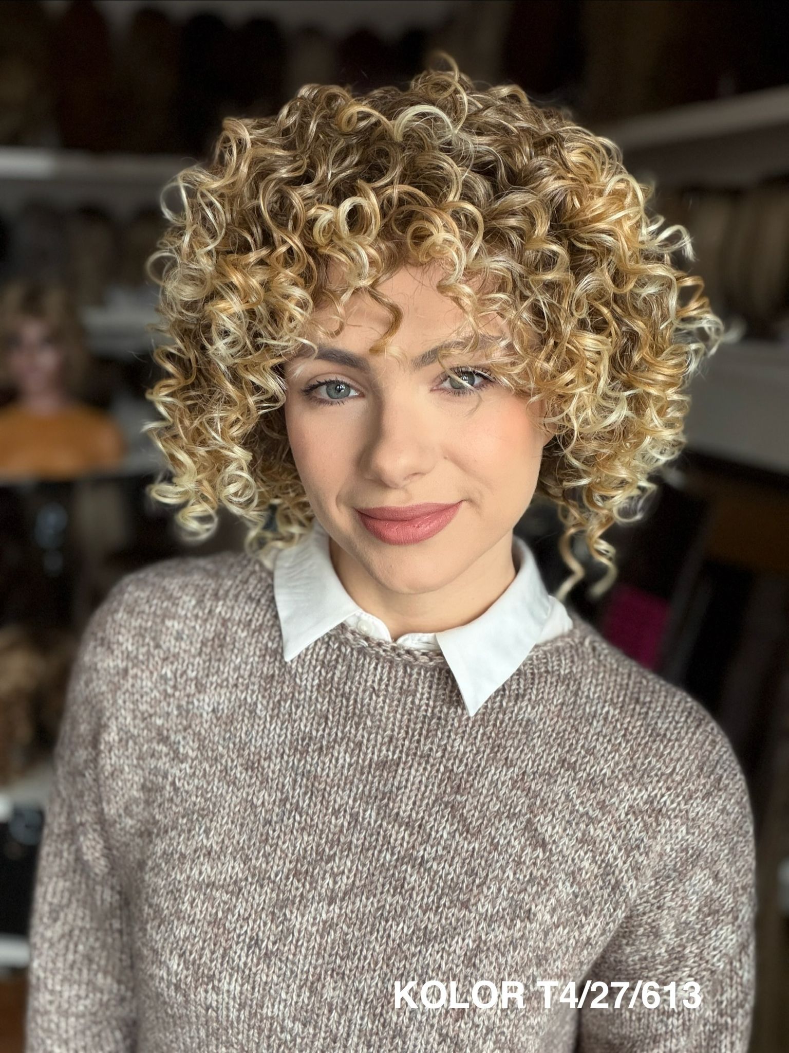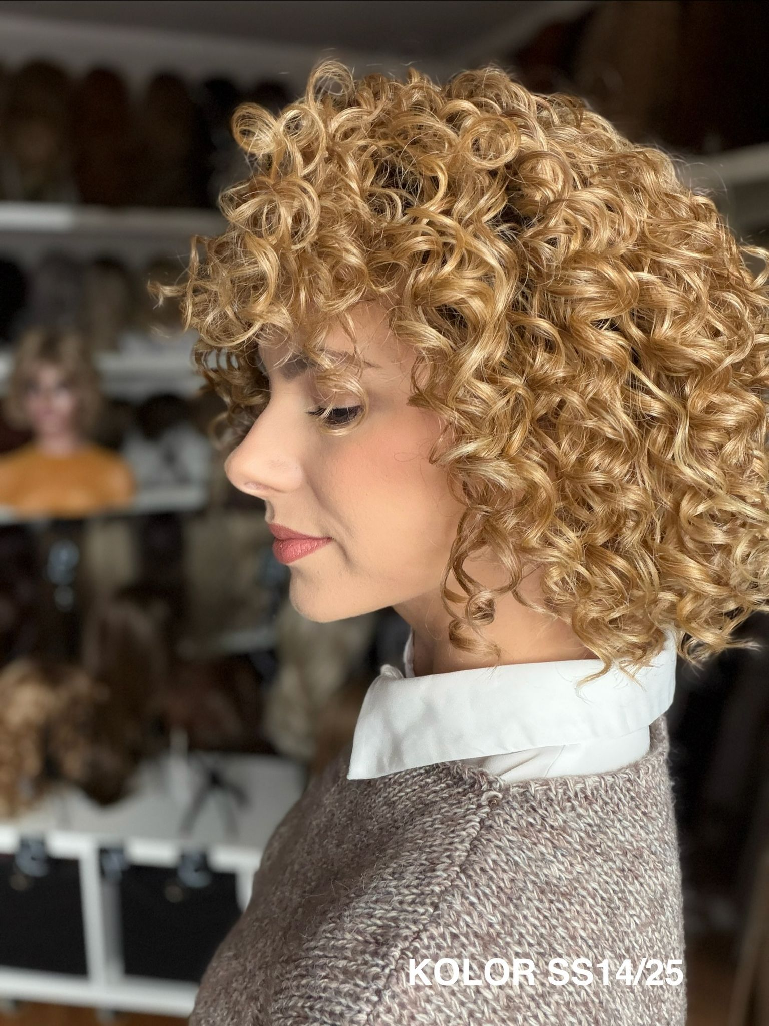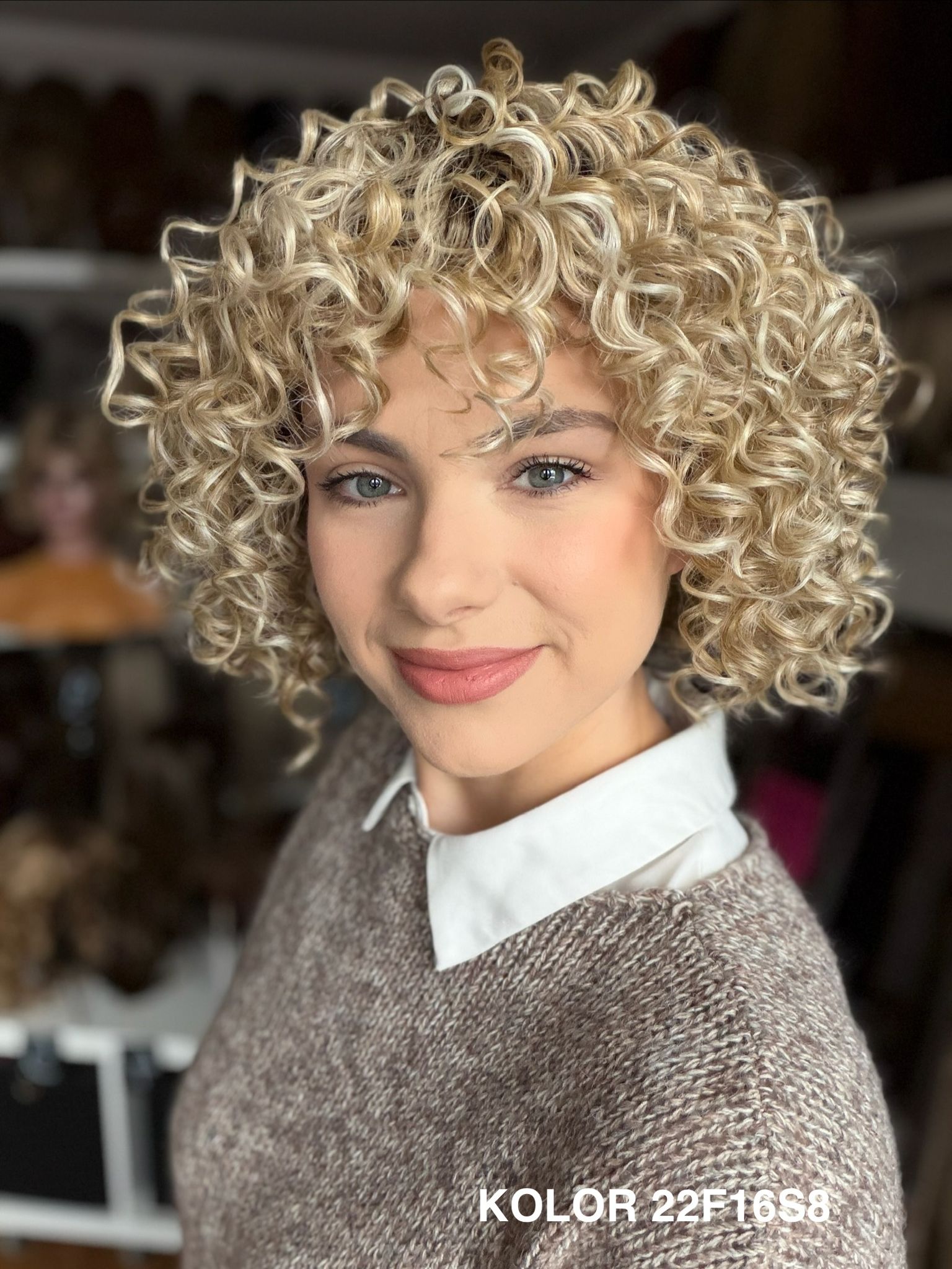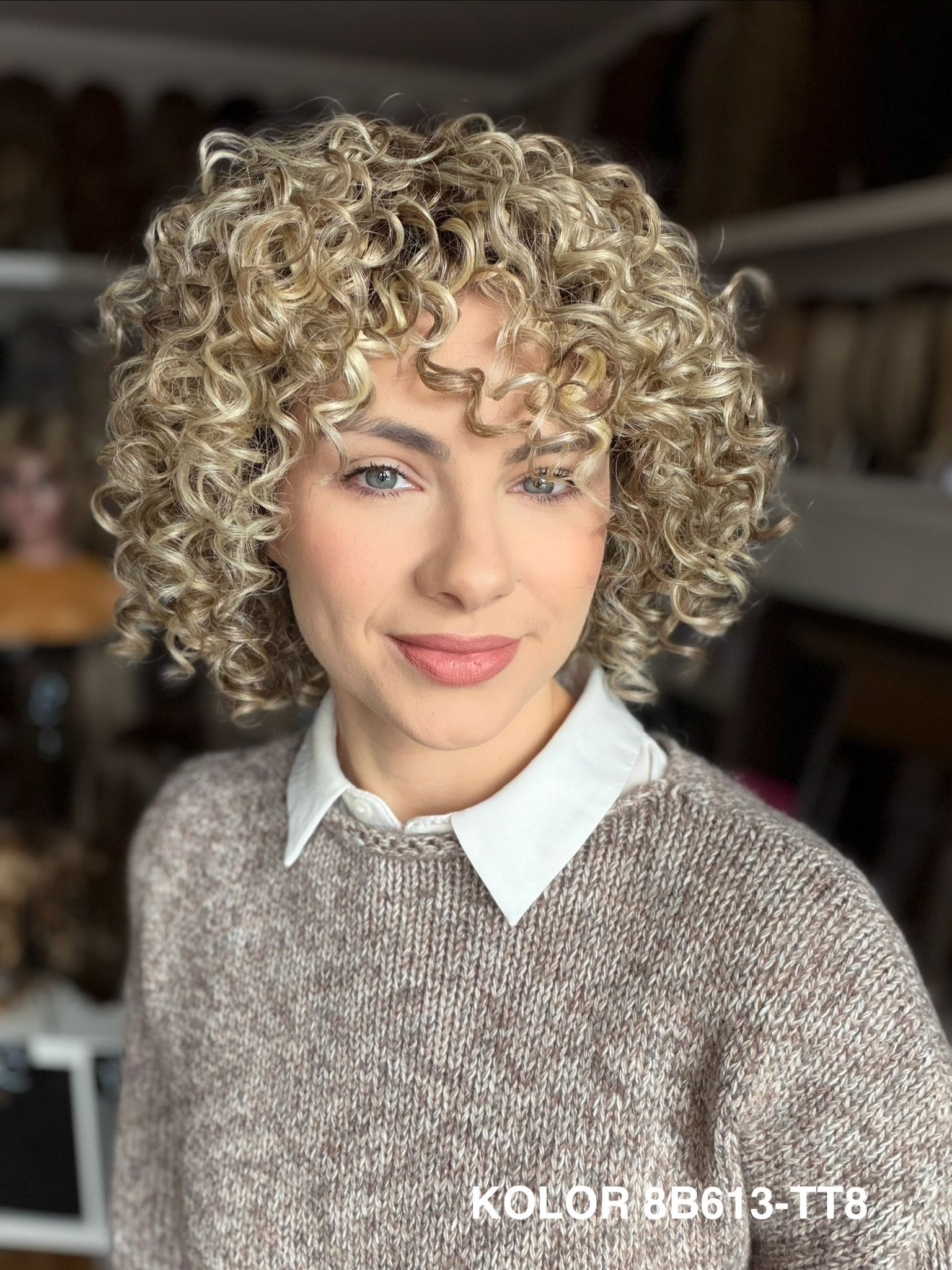 Tami to krótka peruka w stylu afro z pięknymi, sprężystymi lokami o długości około 25 cm. Loki są gęste, równomiernie rozłożone, tworzą naturalnie wyglądającą fryzurę z objętością i lekkością. Przedziałek wykonany z lateksu doskonale imituje skórę głowy, zapewniając realistyczny efekt. Fryzura idealnie podkreśla rysy twarzy i nadaje młodzieńczy, energiczny wygląd. To świetna propozycja zarówno dla miłośniczek klasyki w nowoczesnym wydaniu, jak i odważnych stylizacji z pazurem.