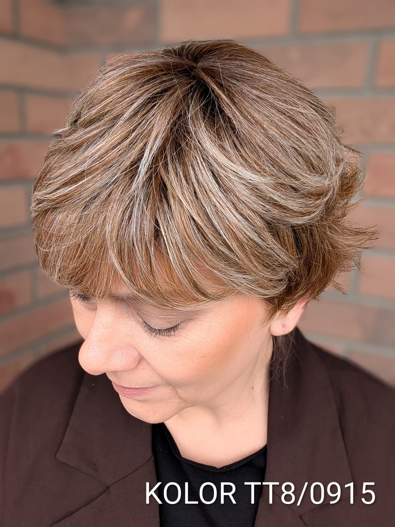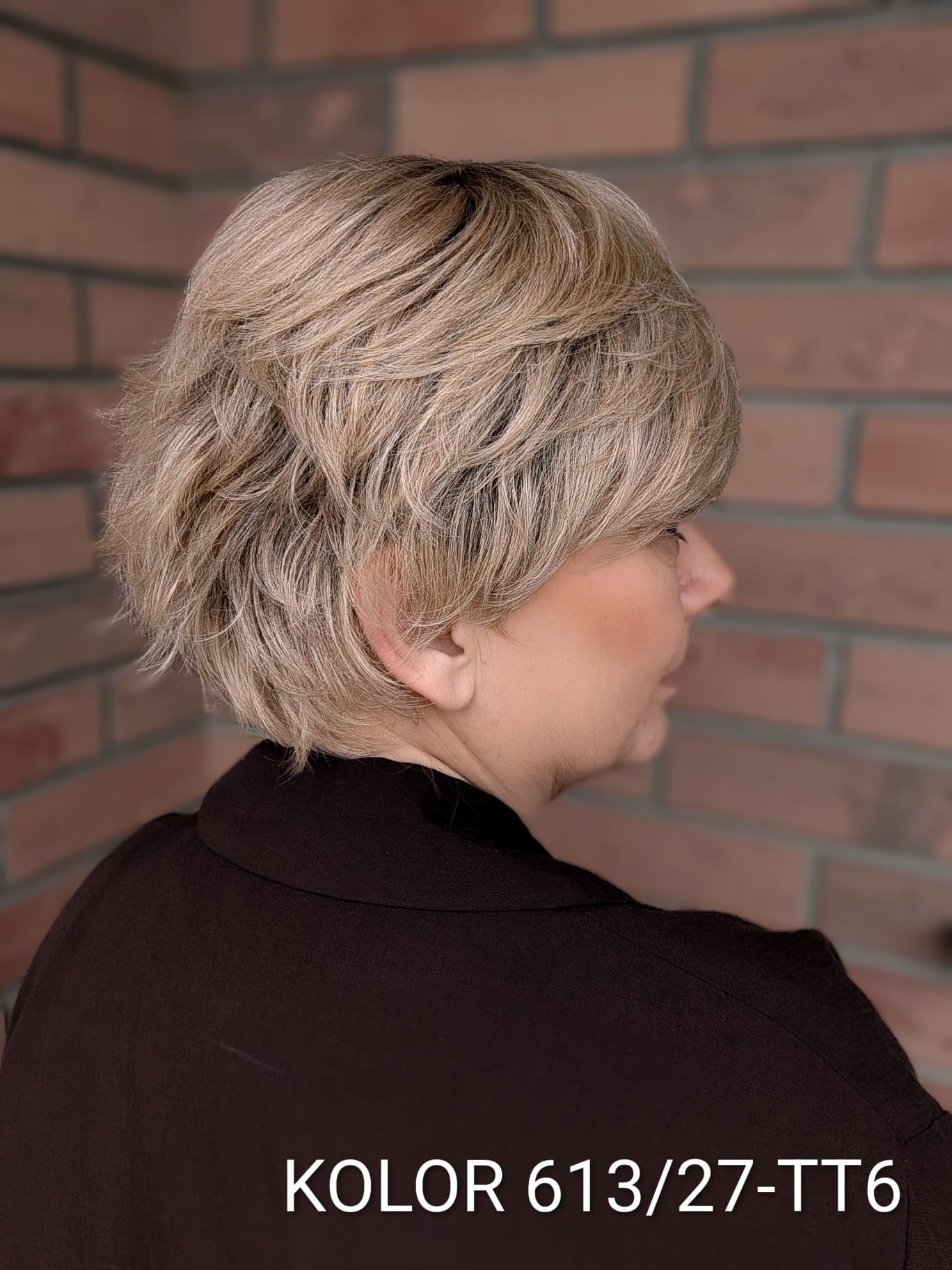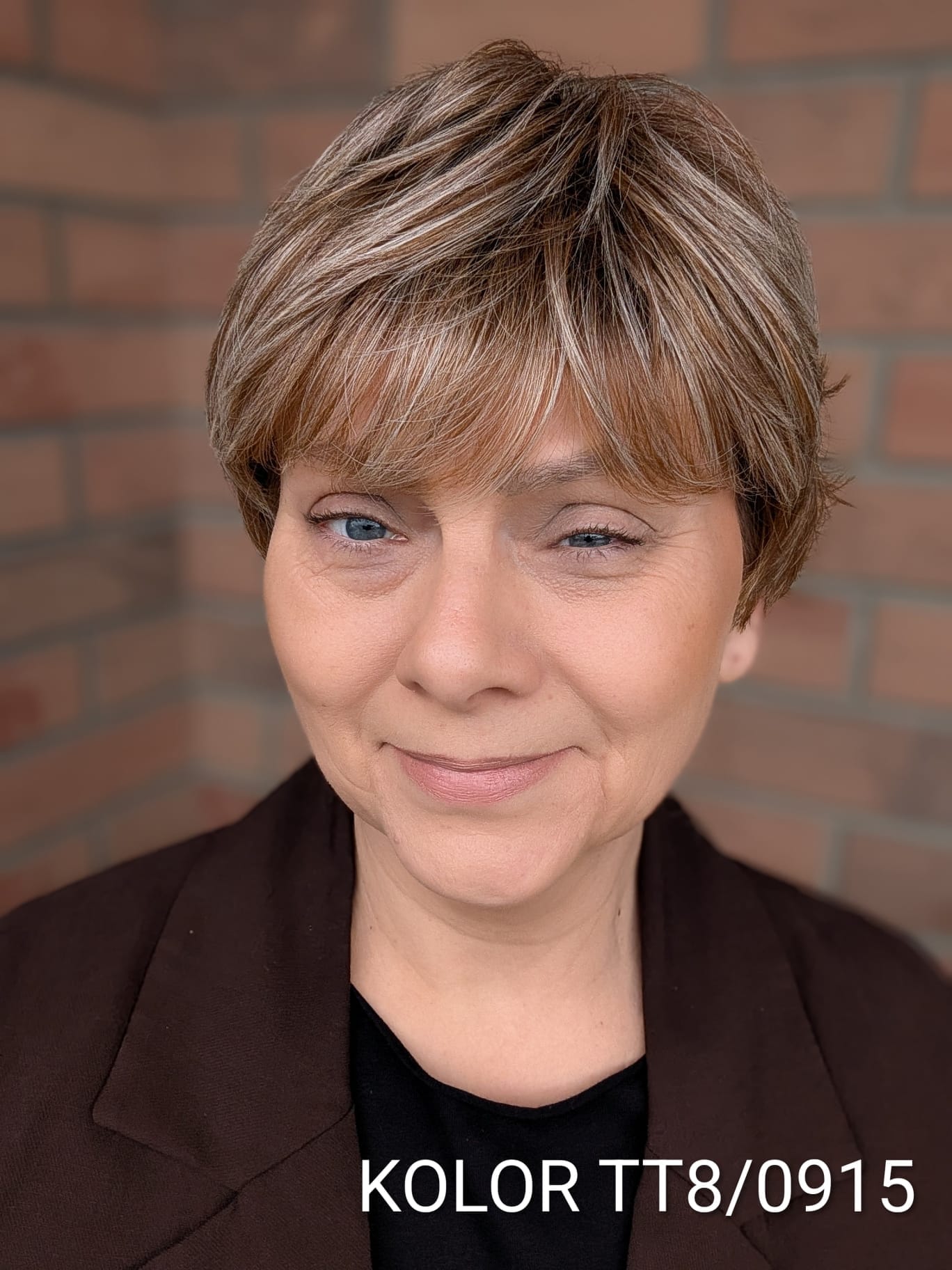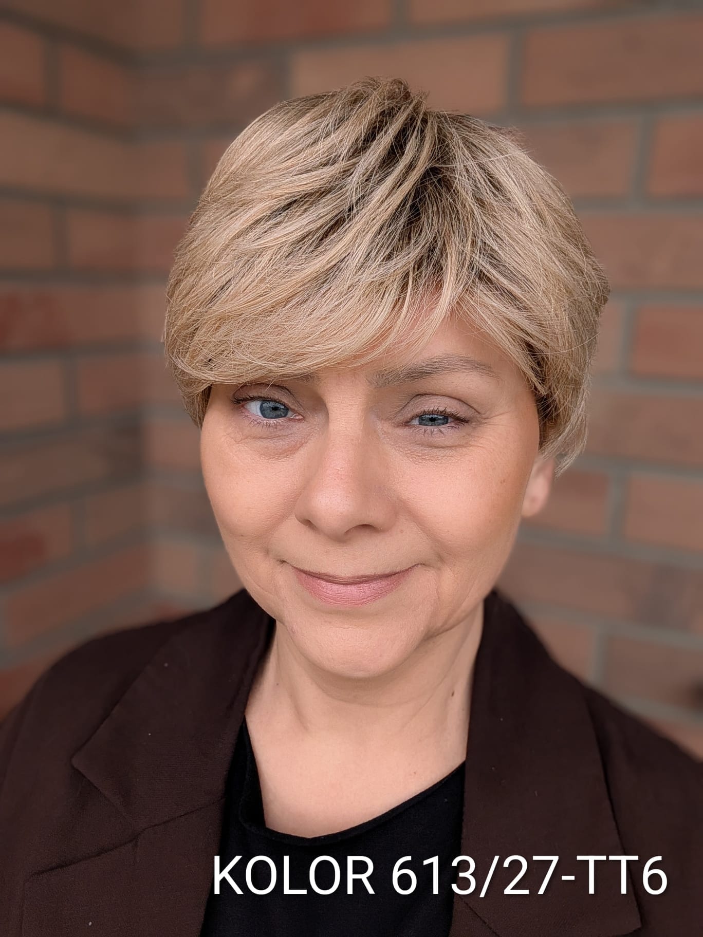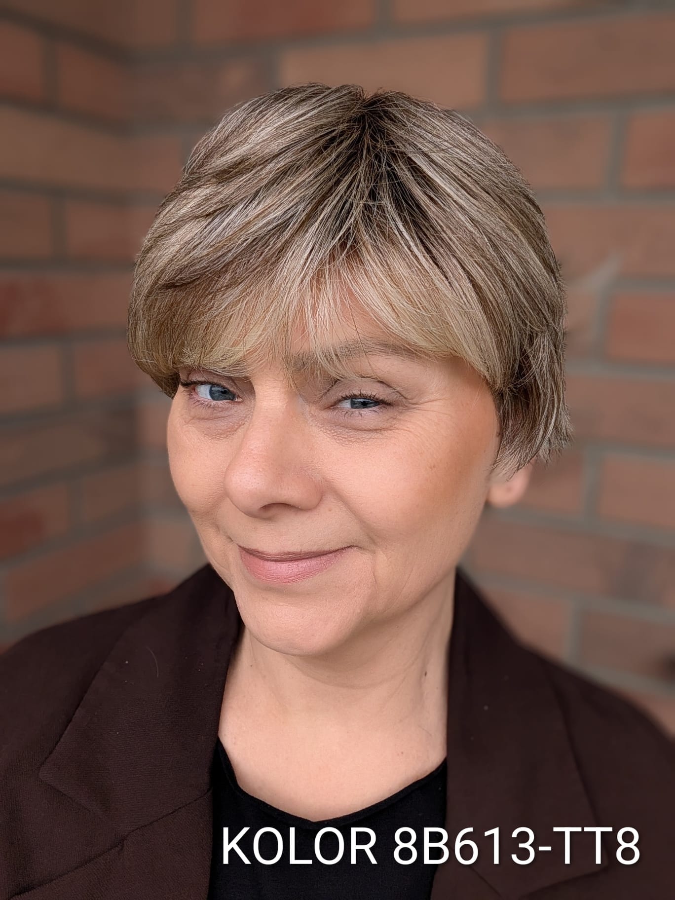 Peruka Wanda to krótka fryzura z pazurem – stworzona dla kobiet, które chcą dodać sobie charakteru i energii. Dzięki wstawce Mono Top włosy wyglądają, jakby wyrastały bezpośrednio z głowy, a efekt przejścia na linii czoła jest całkowicie niewidoczny. Peruka jest niezwykle lekka i komfortowa, co sprawia, że noszenie jej przez cały dzień to czysta przyjemność. Ta fryzura to połączenie swobody, realizmu i klasy – dla kobiet, które chcą wyglądać naturalnie i czuć się pewnie każdego dnia.