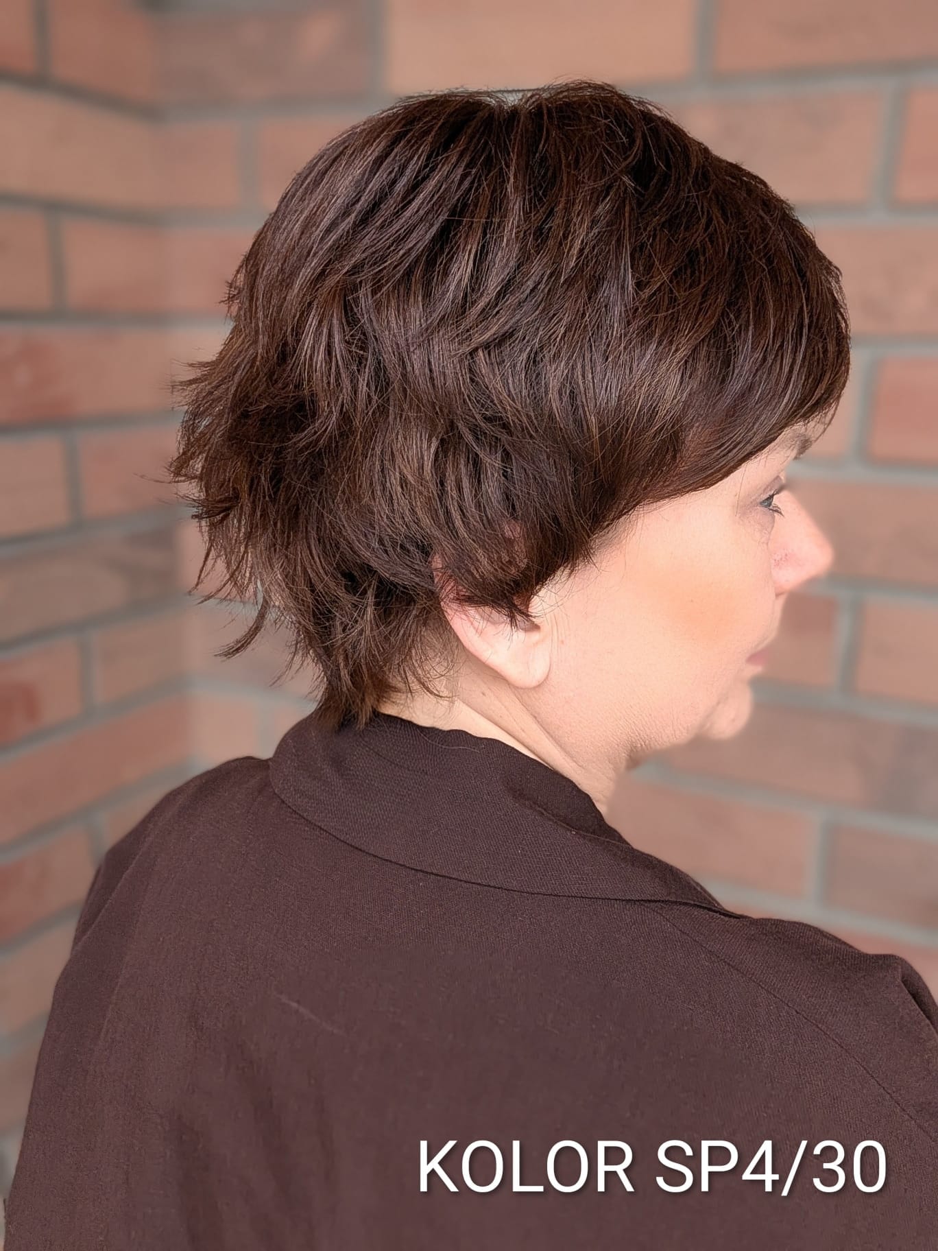 - Rodzaj fryzury: Włosy krótkie z zadziornymi pazurkami, z grzywką.