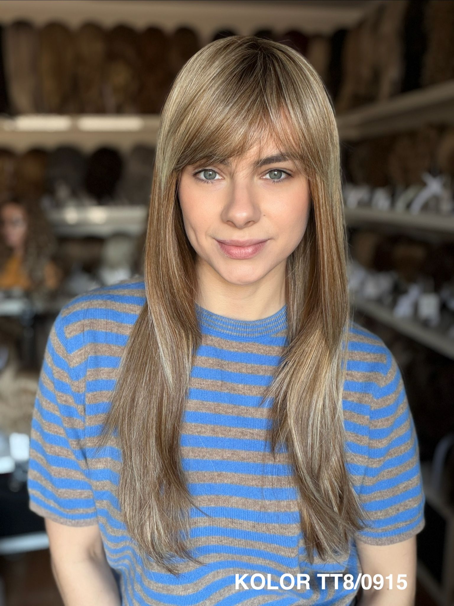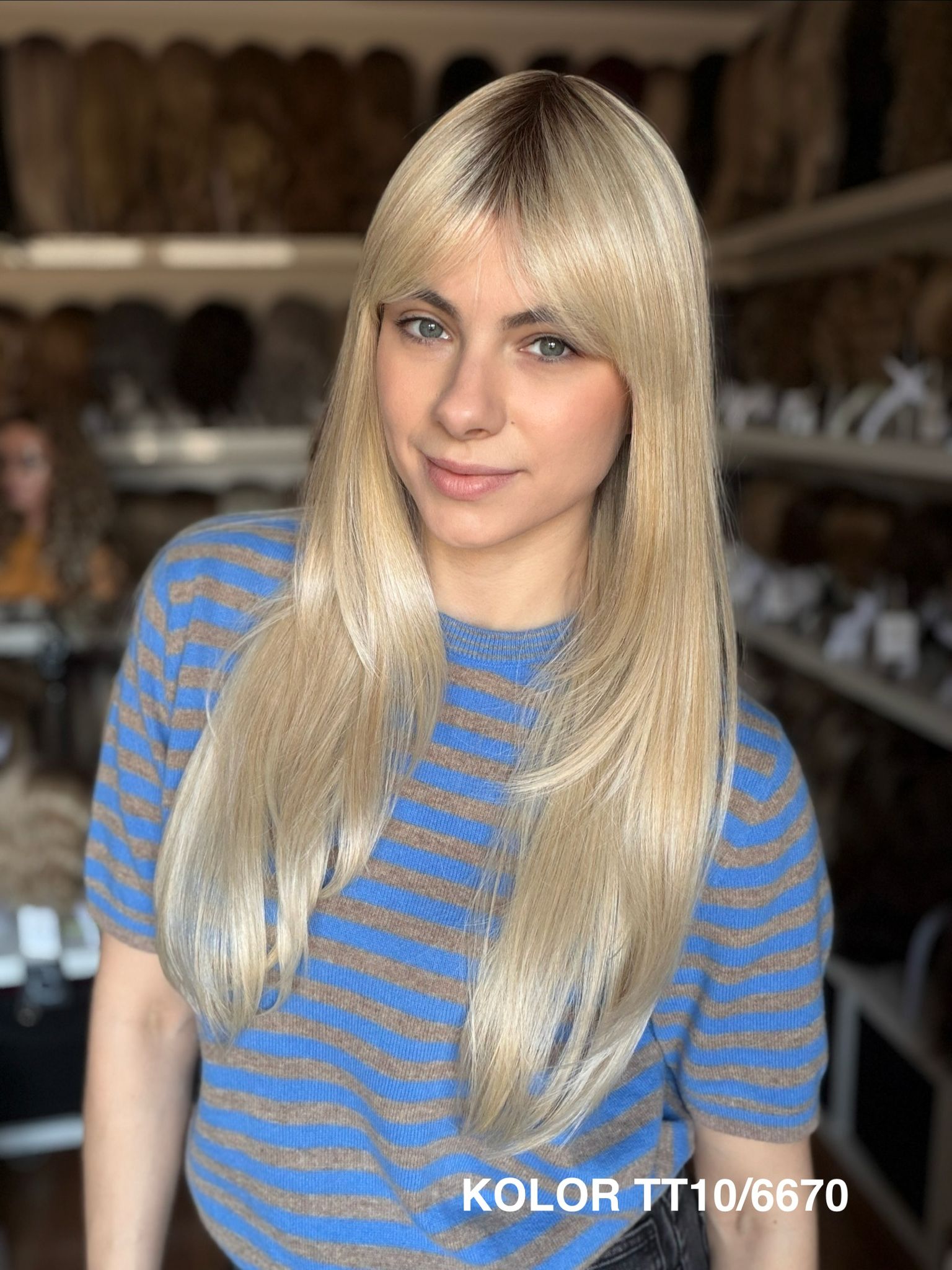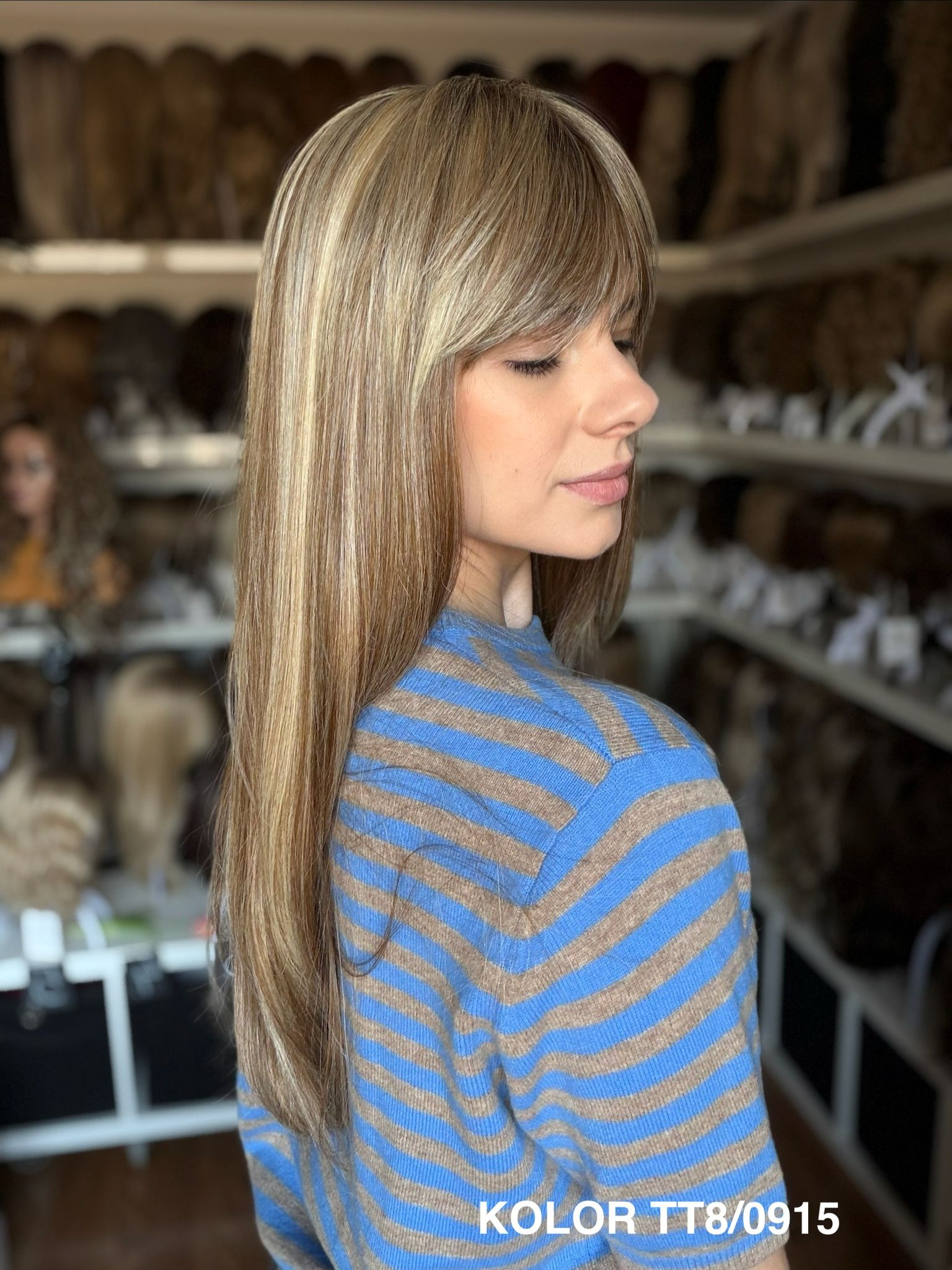Wiktoria to długa, lekka i niezwykle naturalnie wyglądająca peruka, wykonana z syntetyczno-termicznego włókna na bazie wysokiej jakości włókna japońskiego. Włosy mają około 65 cm długości, są gładkie, miękkie i subtelnie opadają na ramiona oraz plecy, tworząc efekt delikatnej, klasycznej fryzury. Model jest bardzo komfortowy w noszeniu — włosy są lekkie i do złudzenia przypominają naturalne. Czepek posiada regulację objętości, dzięki czemu można go łatwo dopasować.