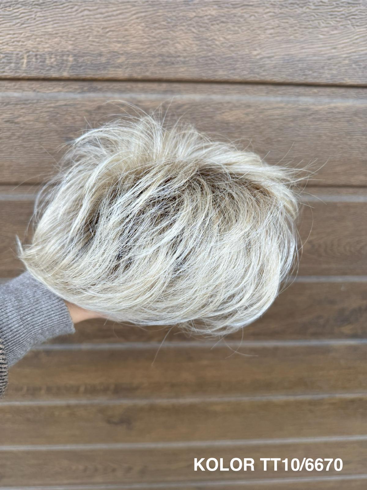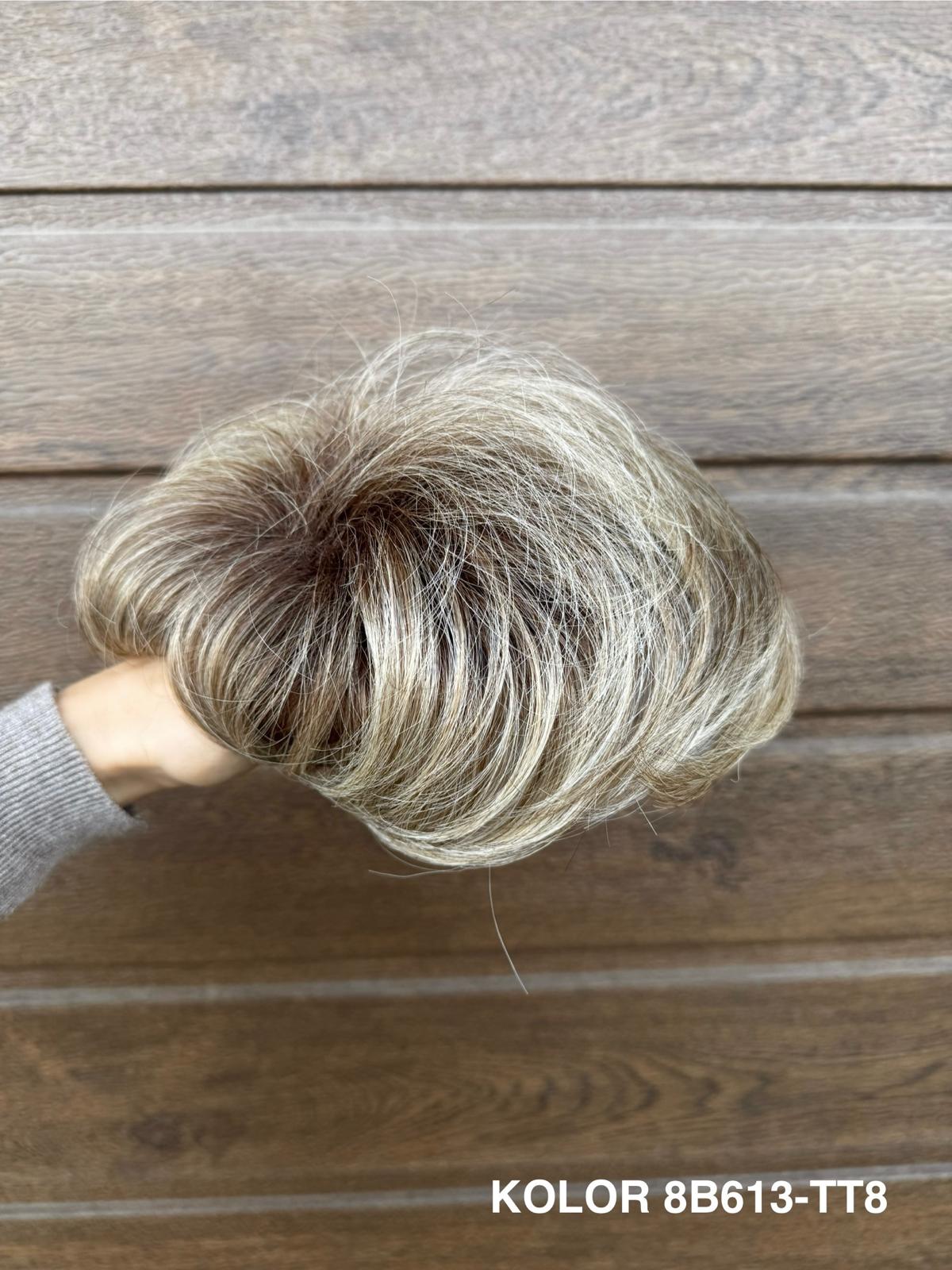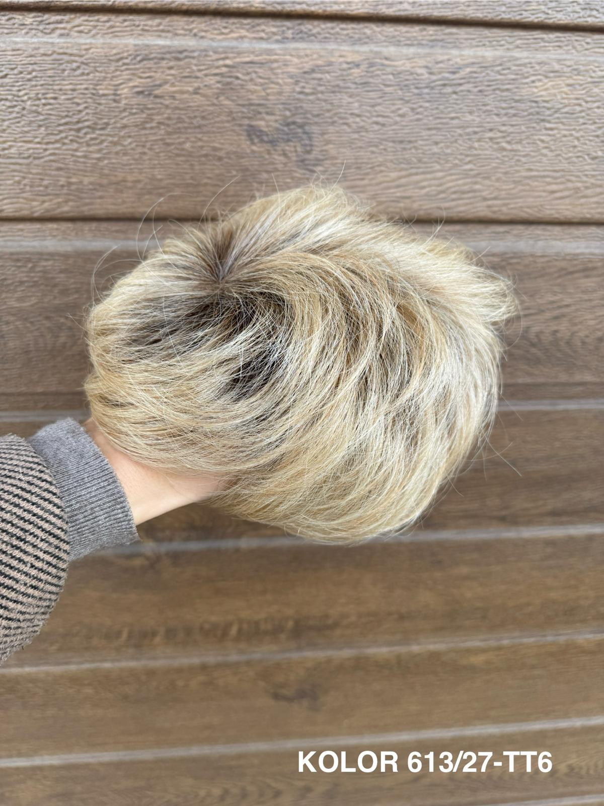 - Cechy specjalne: Topper posiada efekt delikatnego tapiru u nasady, co nadaje fryzurze naturalną objętość i lekko uniesiony kształt bez konieczności stylizacji