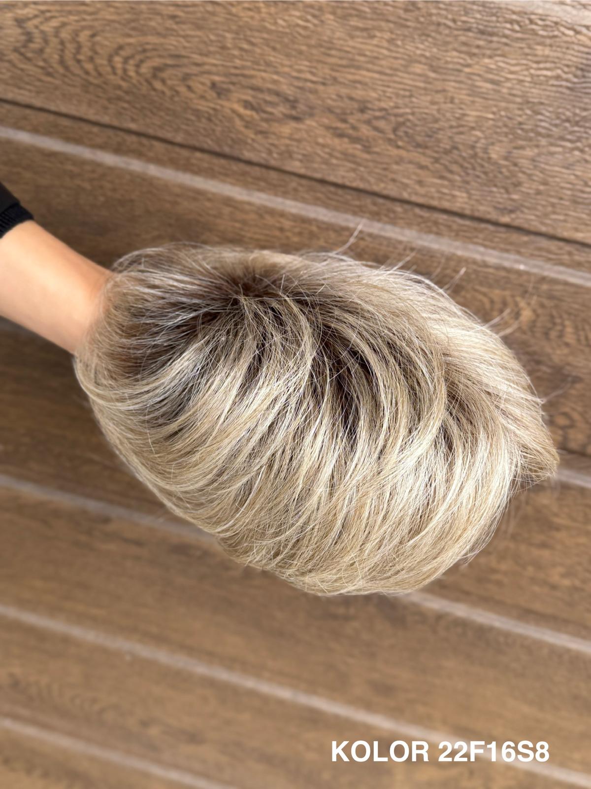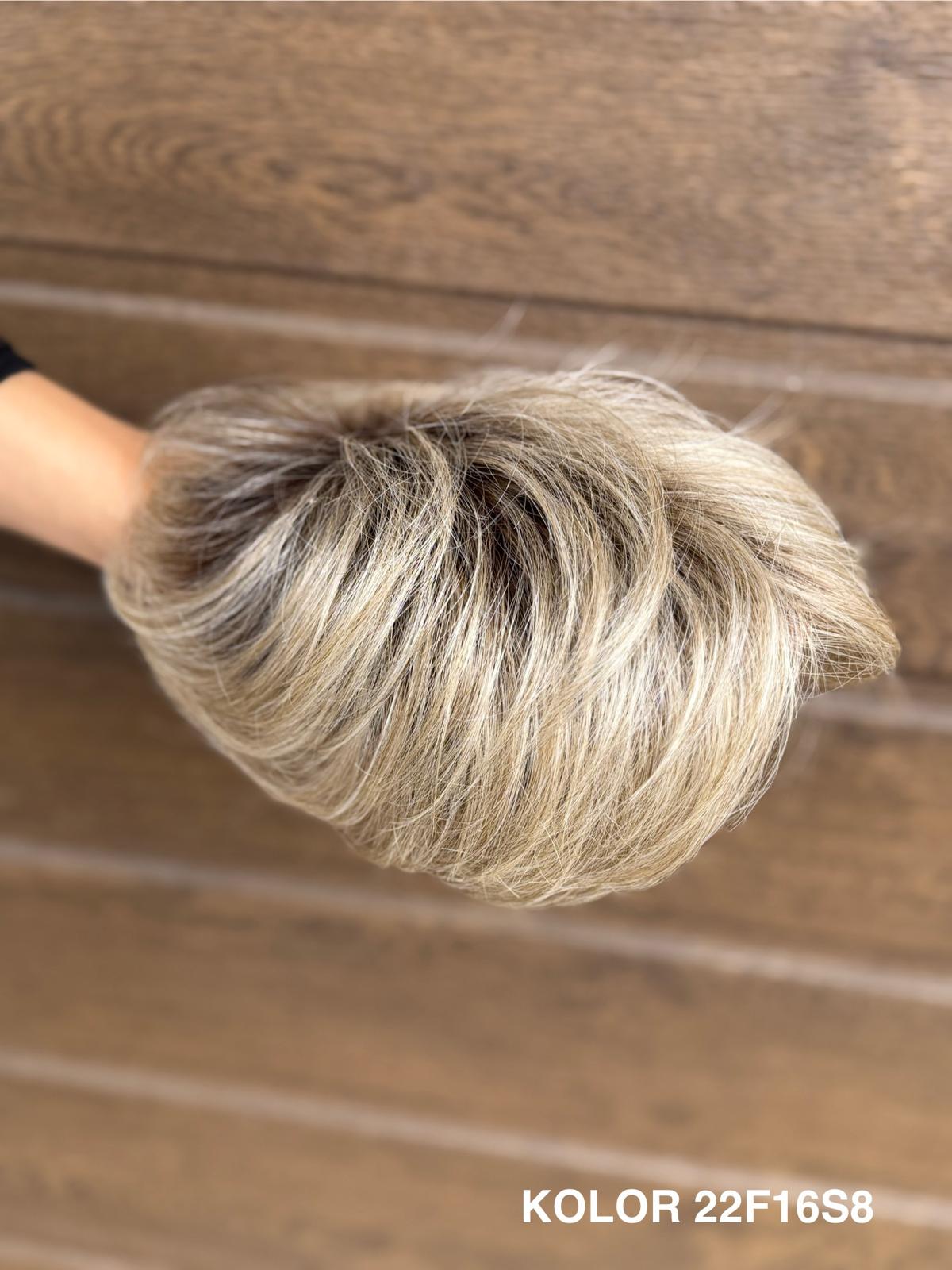 Fryzura Gaja to klasyczna, krótka stylizacja w eleganckim chłodnym blondzie z subtelnym odrostem. Włosy są miękkie i dobrze się układają, a efekt tapiru delikatnie unosi je u nasady, dodając fryzurze naturalnej objętości. Topper idealnie komponuje się zarówno z rozpuszczonymi włosami, jak i spiętymi w kok lub kucyk, umożliwiając stworzenie lekkiej i zadbanej fryzury w kilka sekund. Doskonały wybór na co dzień i na wyjątkowe okazje.