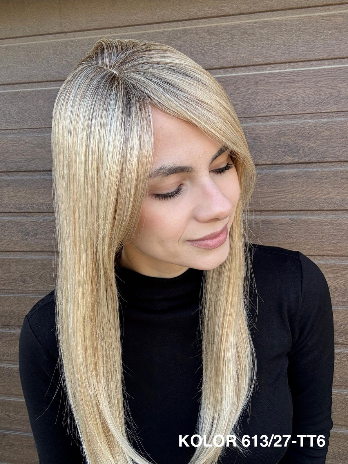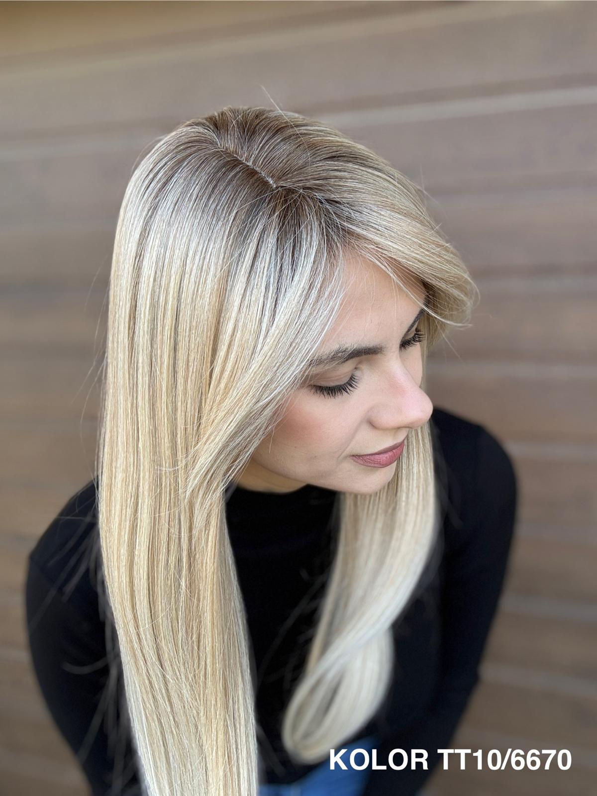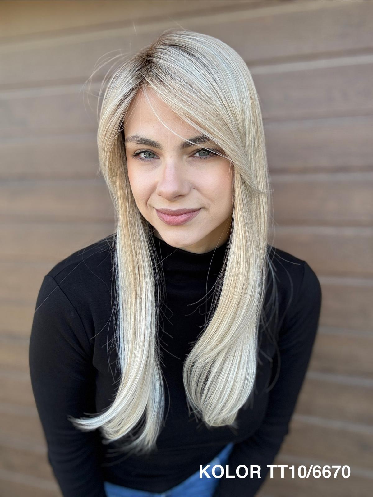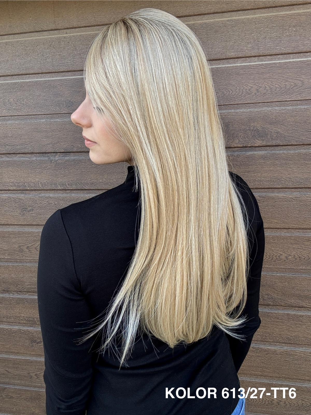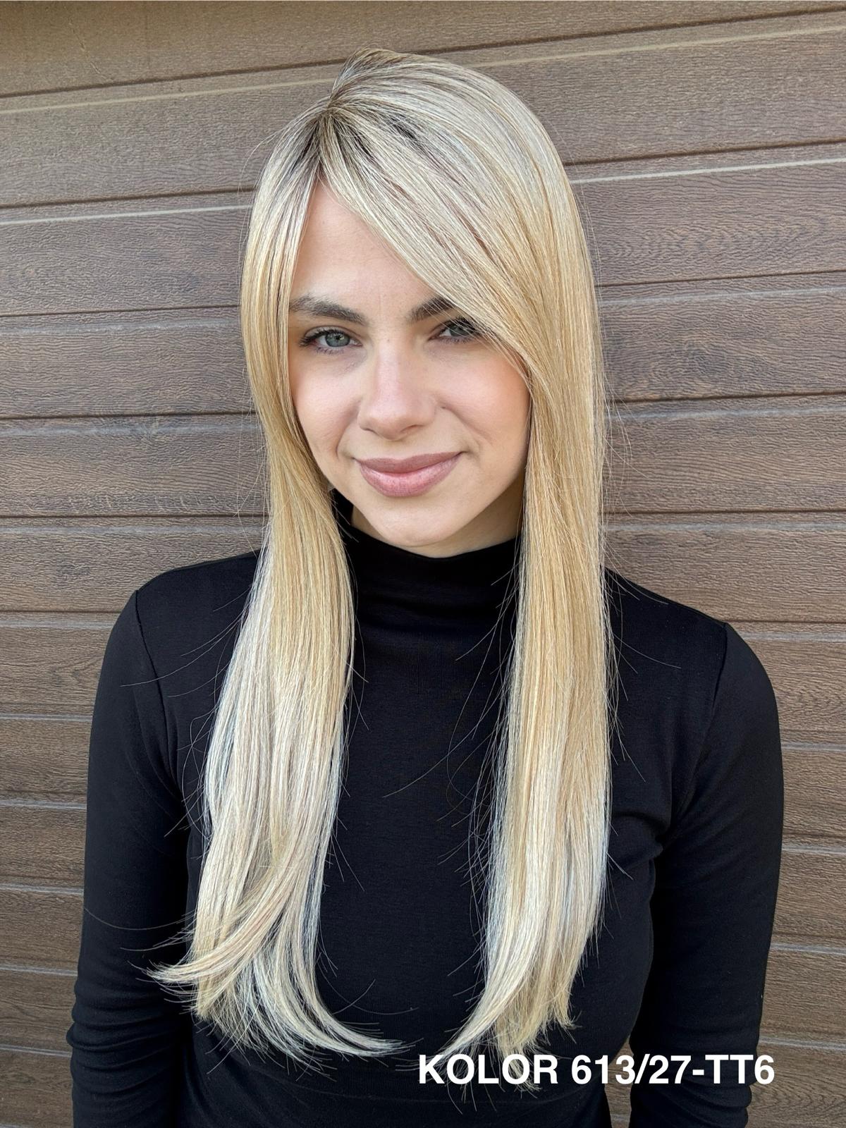 | Kolory | 10/27M, 1B (czarny), 22F16S8, 4/6-30M, 613/16-TT8, 613/27-TT6, 8B613-TT8, F103/60/1001-TT12, H33/Rose, K16/613-14, KOLOR 2, KOLOR 4, P14/22, P16/22, R12/26A, R14/88HSS, RL29/33SS8, RL51/61, RL8/12SS, SS130, SS14/25 (miodowy blond), TT10/247 (platynowy z odrostem), TT10/6670, TT8/0915  |
