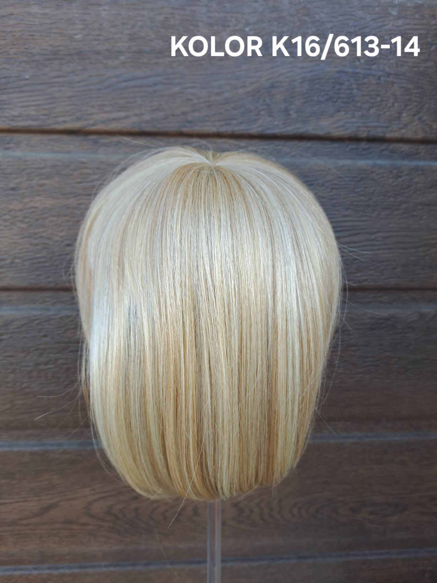 Topper Kasia – delikatny mini topper stworzony do subtelnego zagęszczenia włosów lub stworzenia naturalnie wyglądającej grzywki. Wykonany z włosa syntetyczno-termicznego na bazie włókna japońskiego, dzięki czemu można go delikatnie stylizować i dopasować do swojej fryzury. Świetnie sprawdza się także przy wysokich upięciach, nadając im objętości i lekkości.